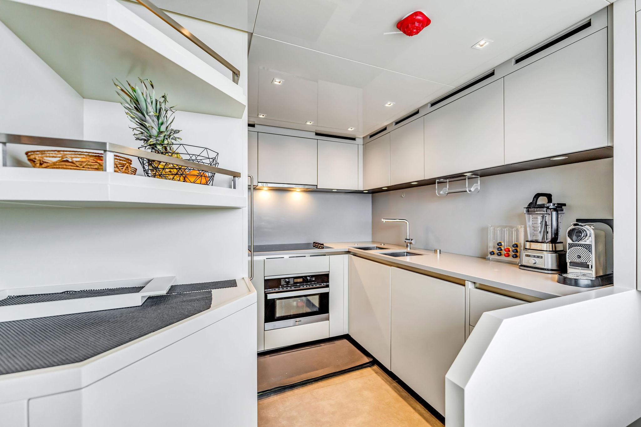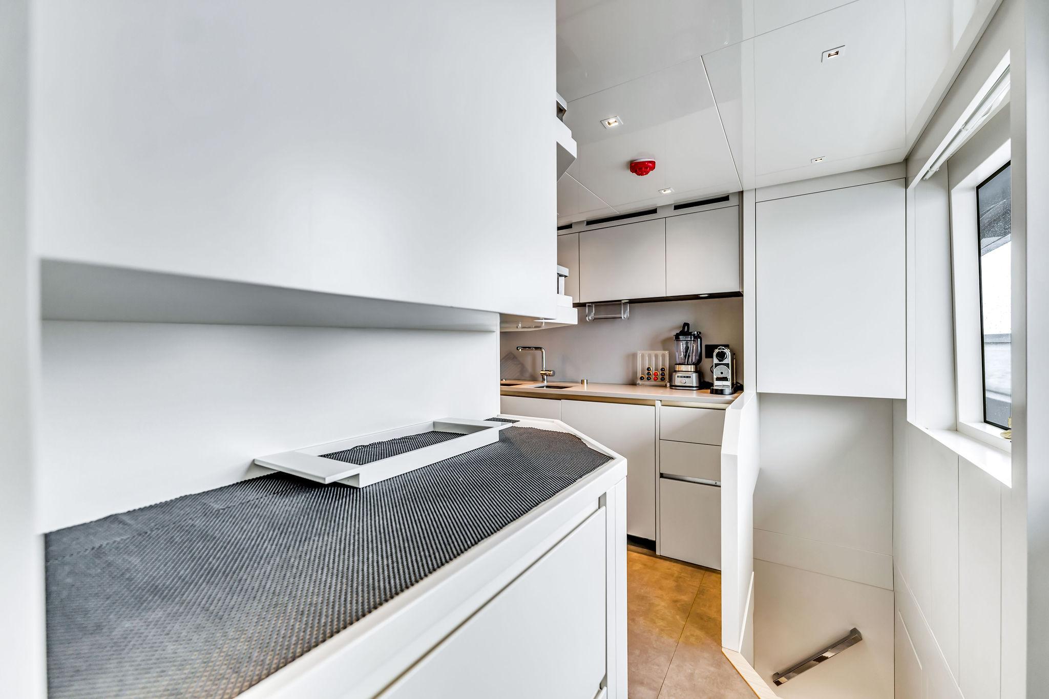 Back in the main salon, moving forward to starboard, you pass a staircase leading up to the pilothouse as well as wall storage for china, flatware, and stemware. Through a hinged door, the galley is a chef's dream, equipped with high-end Miele appliances, generous counter space, refrigeration, and storage. A starboard-side door provides convenient access to the exterior deck.