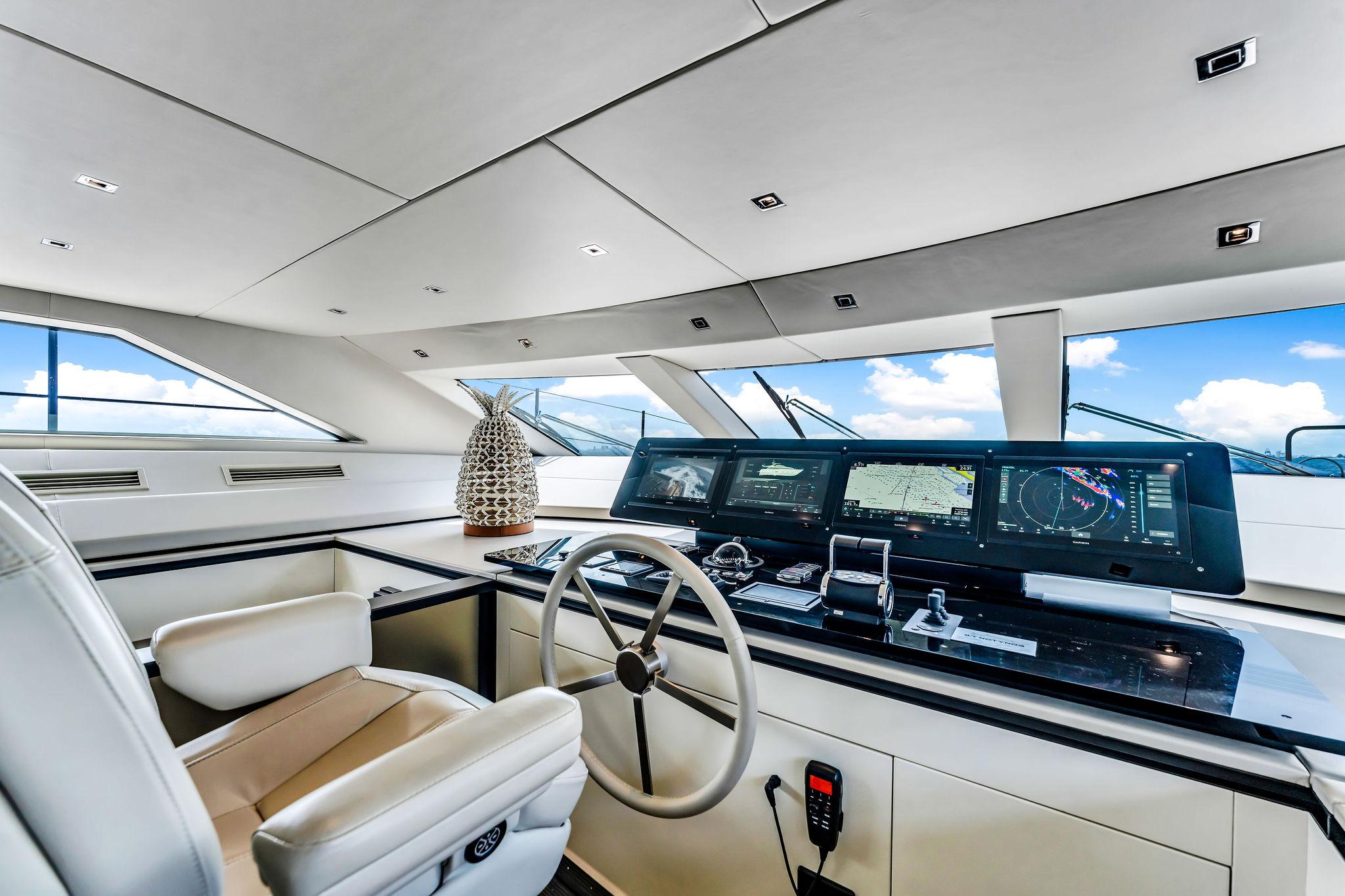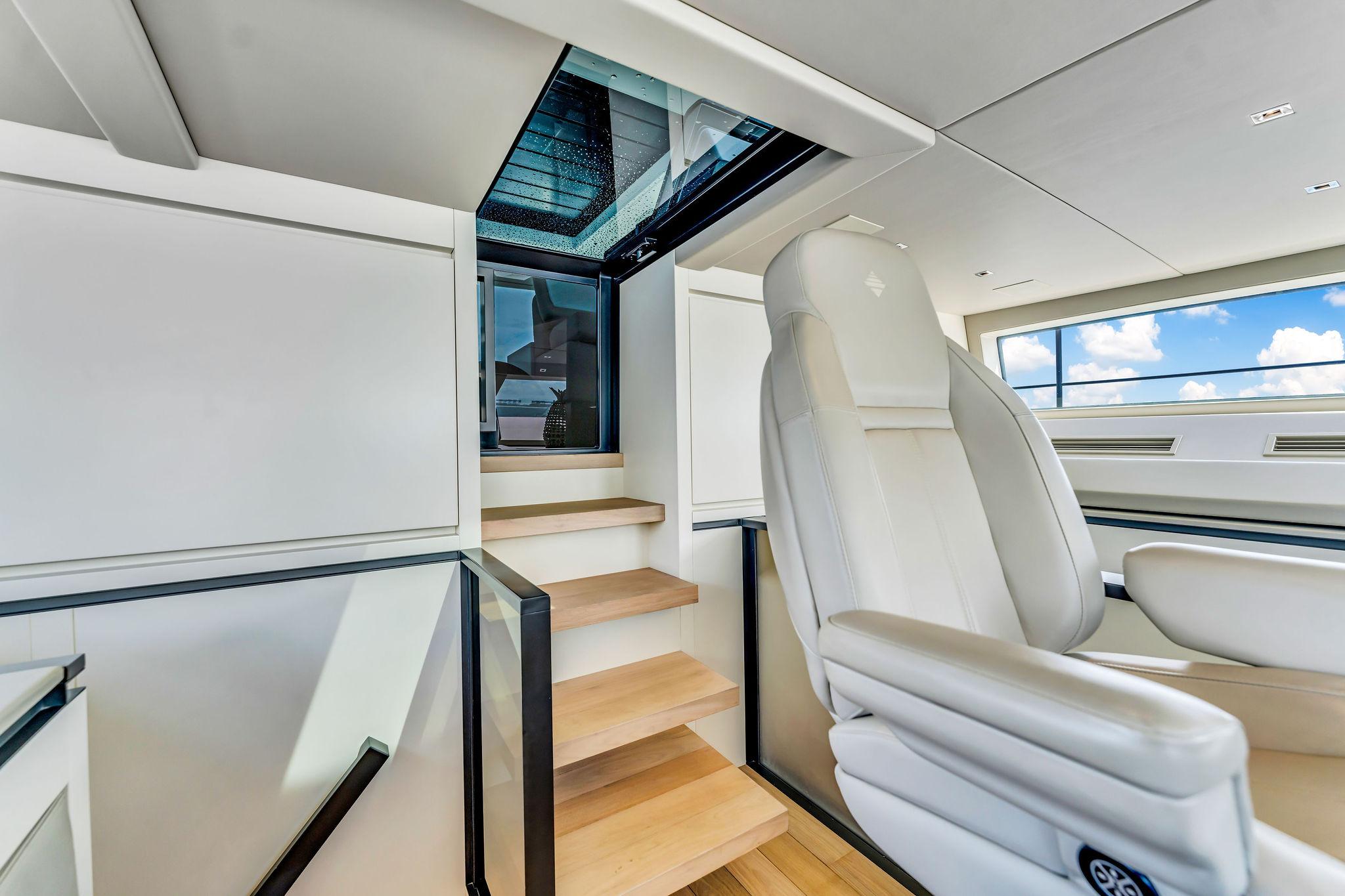 Returning to the main deck's starboard-side corridor, a staircase leads up to the pilothouse, a fully equipped command center with Garmin electronics and state-of-the-art navigation technology. Designed for optimal visibility and operation, the pilothouse ensures seamless cruising. A centerline staircase leads further up to the flybridge via a sliding hatch.