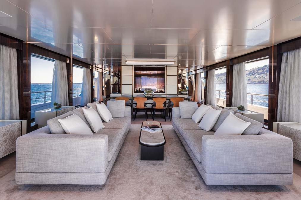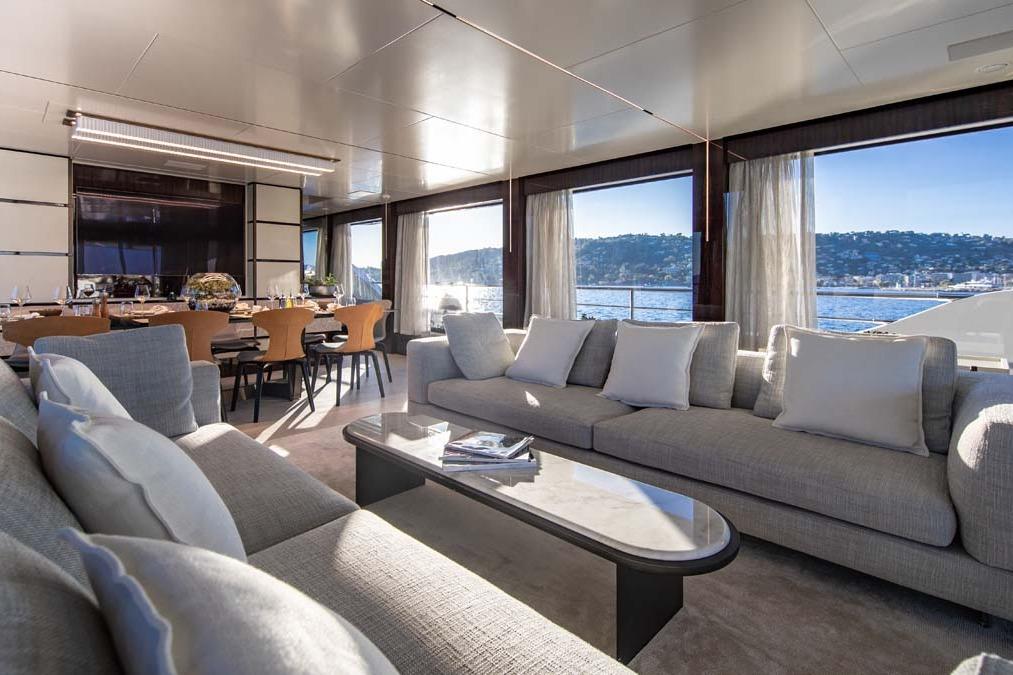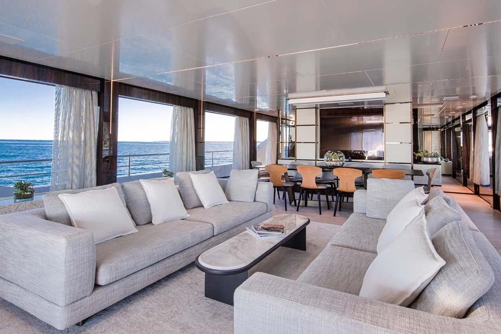 When one walks forward across the large aft deck, one will reach a pair of glass electric double doors giving access to a spacious and well-appointed open layout salon, comfortable seating, and formal dining forward of the salon. The salon and dining area have floor-to-ceiling windows offering a light and airy feel throughout. From here, one can go forward to port to find a guest day head. Further forward and amidship, one will find a corridor giving access to the galley and pilothouse. Back in the dining area, one can go forward to starboard to find a stairwell to lower guest accommodations or up to the private Owner's deck.