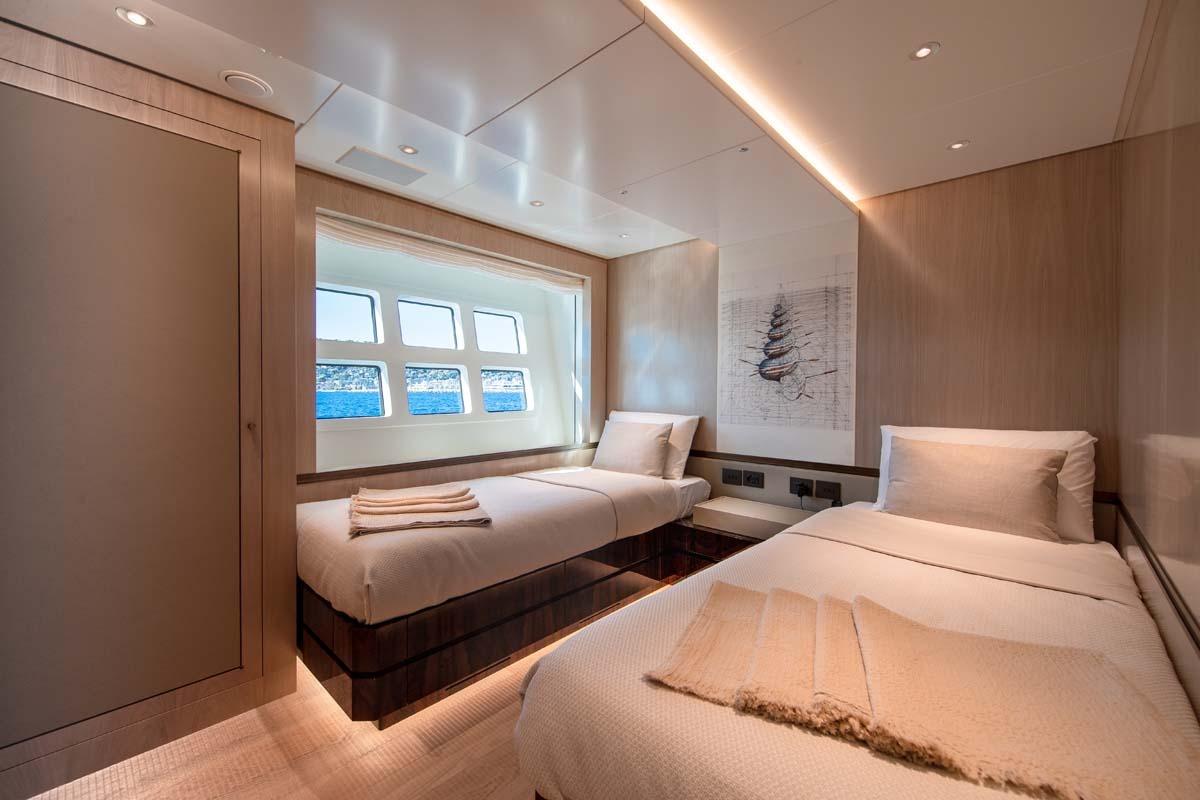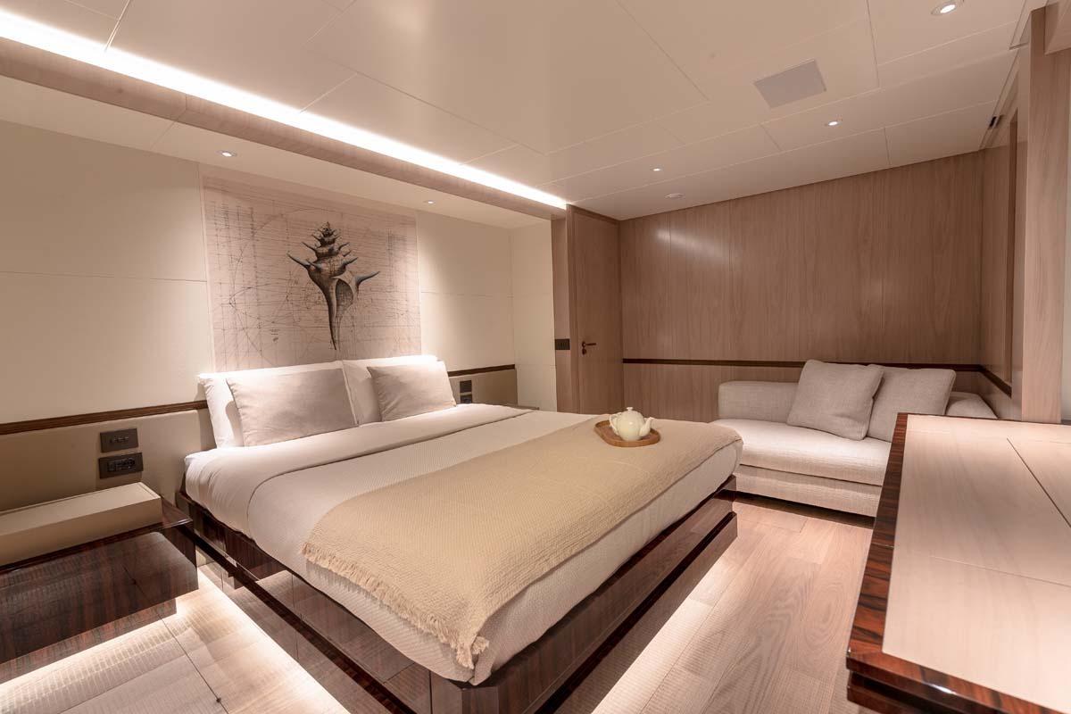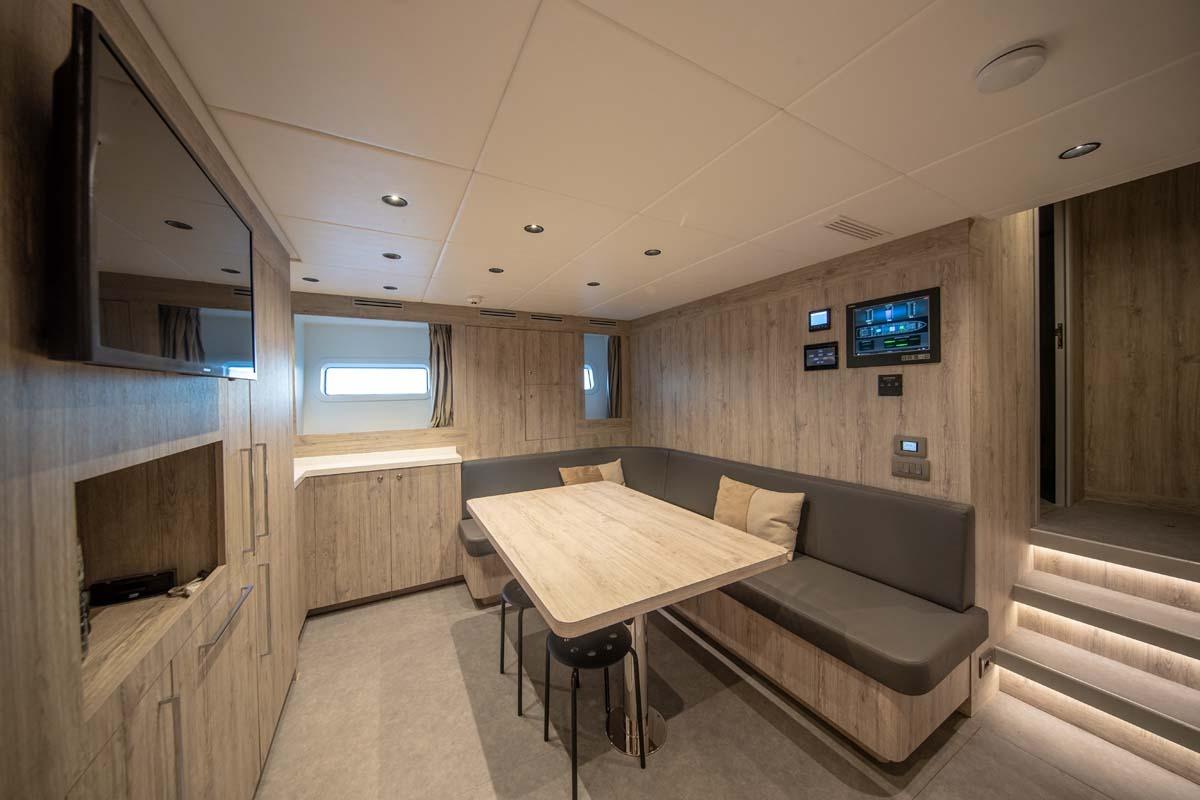 The private owner's cabin is a King berth suite with an ensuite bath, large walk-in closets, ample seating, and storage. Floor-to-ceiling windows bathe the room in natural light, providing stunning views of the surrounding sea. One can walk out of the suite forward to a private owner's seating area. If one walks out of the suite aft through a pair of double doors, one will reach a private owner's deck with a small dining table perfect for private dining, two L-shaped settees with loungers, and a wet bar. The private owner's deck can be open for public use if one would desire, by allowing access from a stairwell from the aft deck.