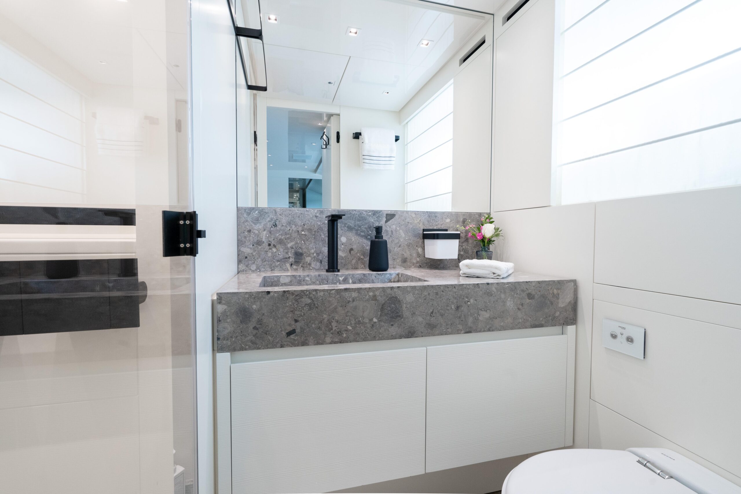 To port and forward one will find a guest corridor with day head. Continuing forward, one will find the Owner's Stateroom. The Owner's suite offers a king berth, and a large ensuite bath with stone sink and shower, toilet and bidet. The owner's area offers ample storage and walk-in closet that is forward and down a couple of stairs.