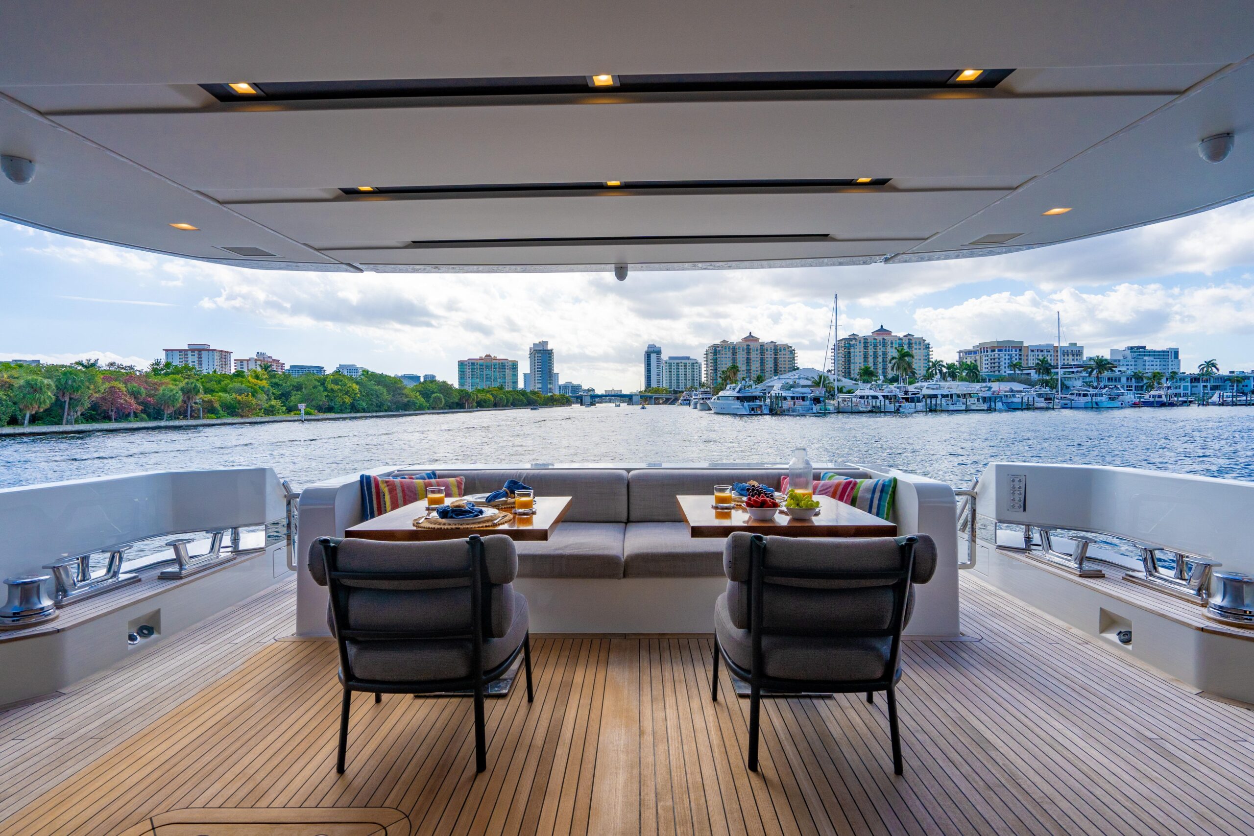 One can board SWEET VIRGINIA from the swim platform to the aft deck or via side boarding. Once aboard the aft deck one will find a spacious area with a built-in settee, teak table and chairs. This area is the perfect area for entertaining, watching water sports or for breakfast and lunch. From the aft deck one can enter the main salon through a set of double glass doors.