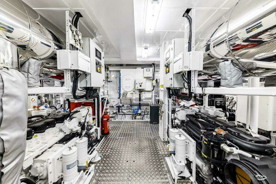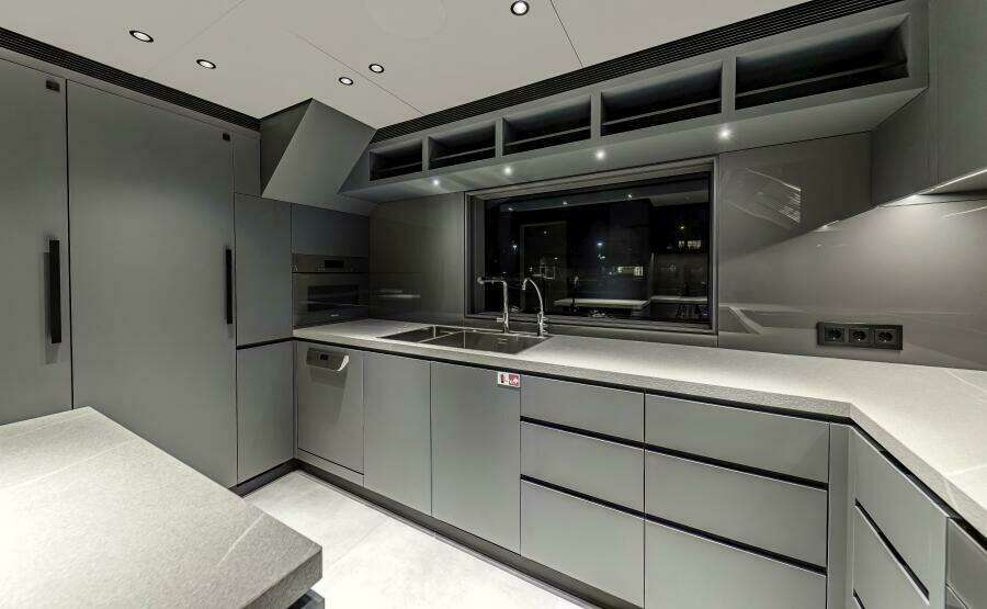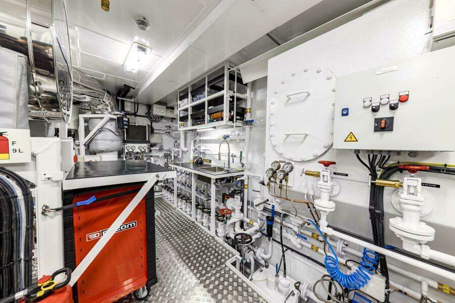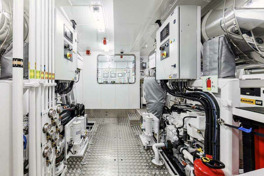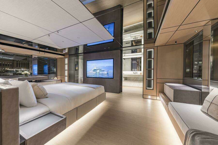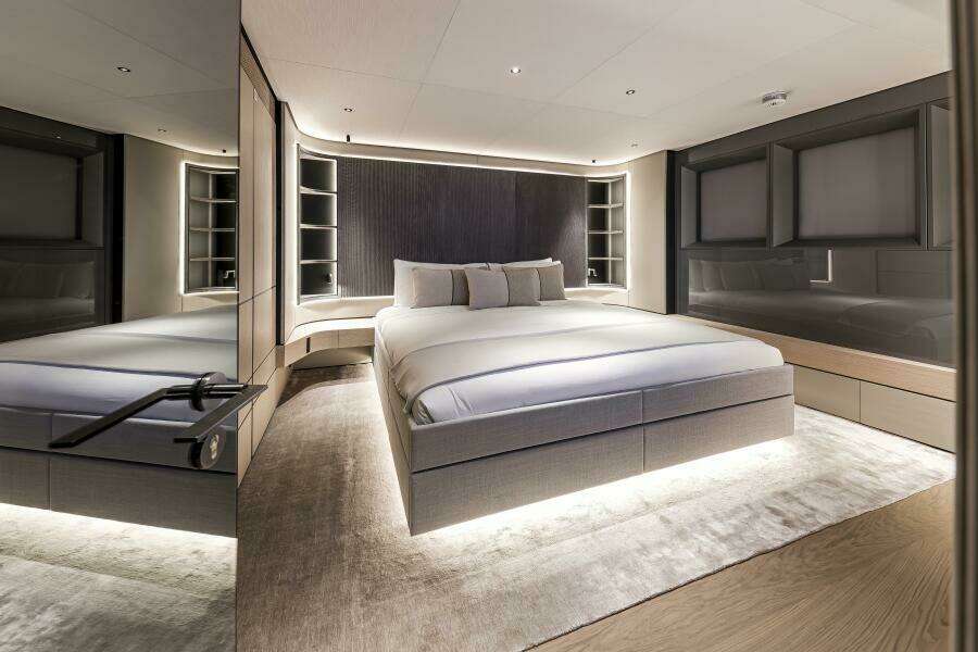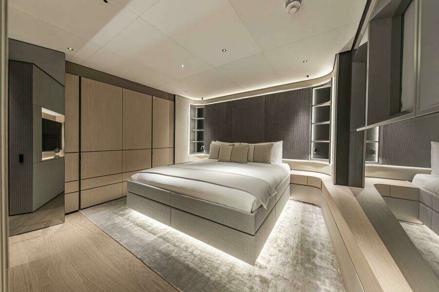 Accommodations offer a full beam owner's suite forward on the main deck plus 4 VIP cabins in the guest accommodations down below. Crew quarters are forward on the lower deck and include a large crew mess, designated laundry area plus 4 double cabins all with private en-suites. A captain's cabin is located on the bridge deck.