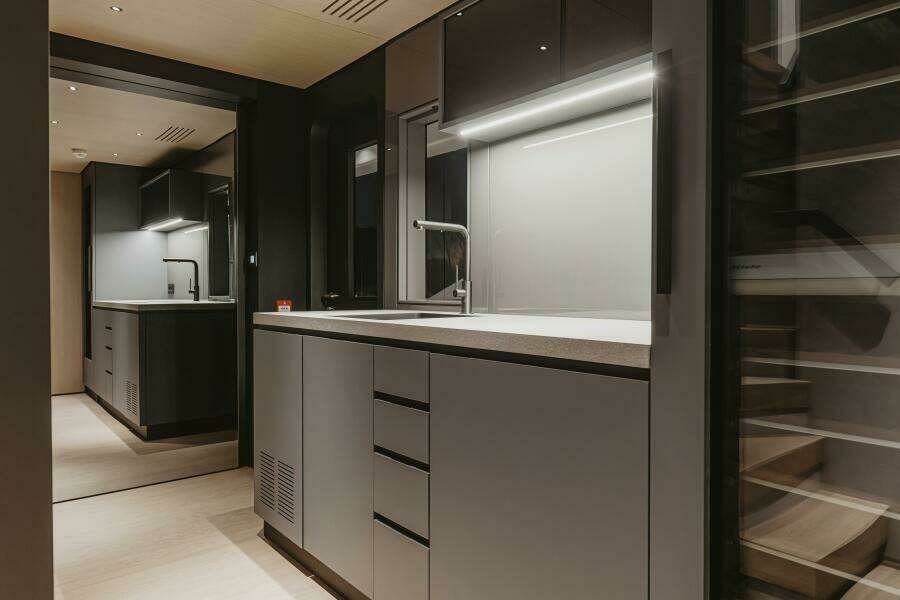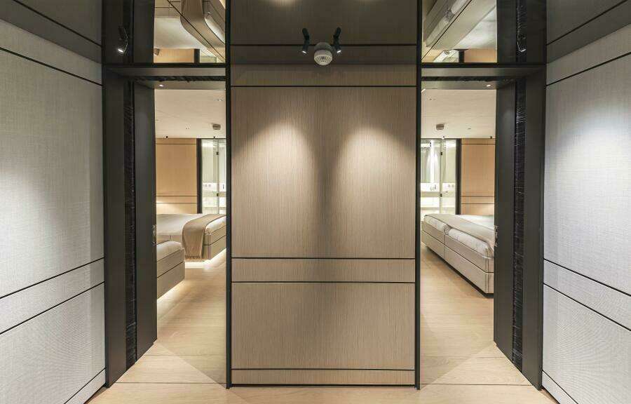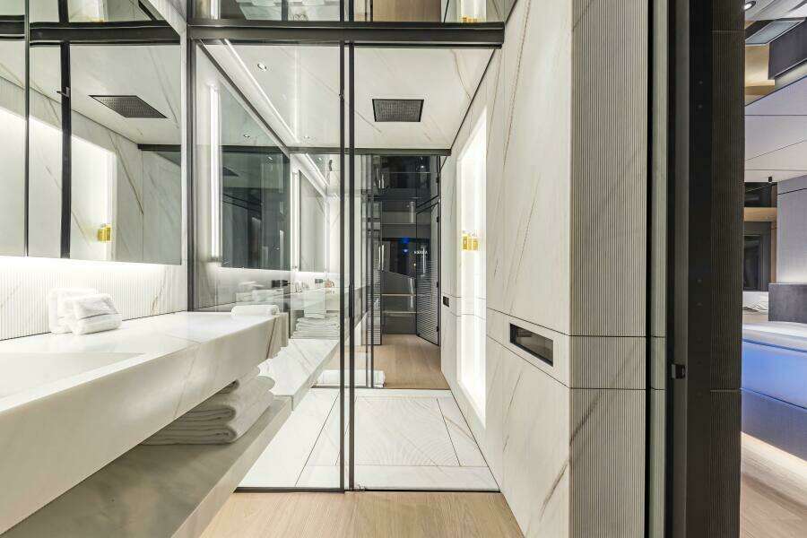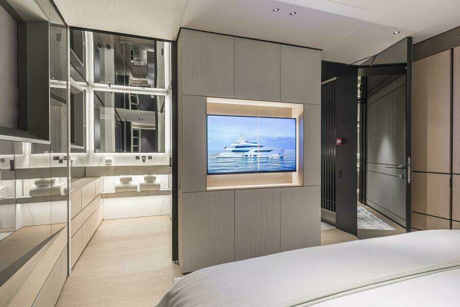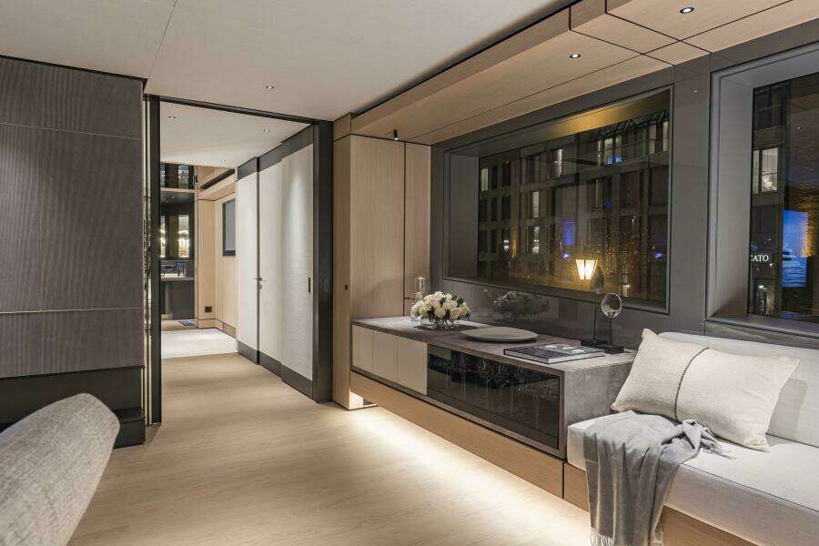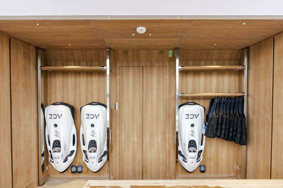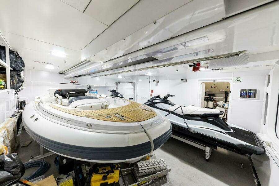 The C144S has a designated garage that can hold a 7m+ tender plus 2 full size jet skis and multiple Sea Bobs. A large hydraulic door opens to the port side thus avoiding interrupting the beach club back aft which is accessible by another large hydraulic door.