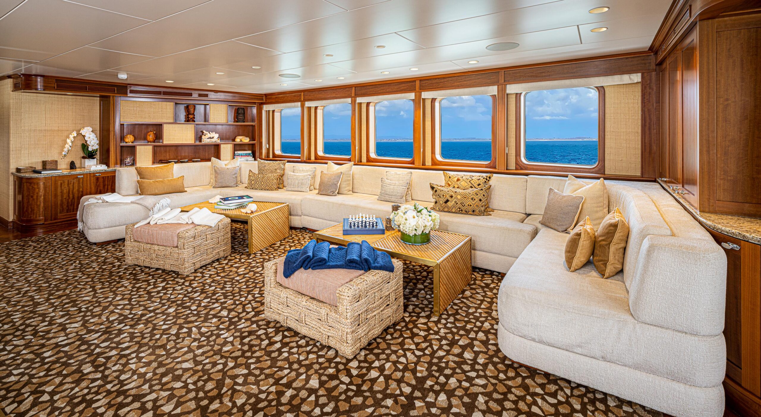 Расположен на главной палубе. Доступ возможен с кормовой палубы или через двери из фасетного стекла и дерева рядом с обеденной зоной. На передней переборке установлен 75" OLED-телевизор, а помещение залито светом благодаря остеклению на 270 градусов. В кормовой части — диван почти во всю ширину корпуса, идеальный для просмотра фильмов или чтения. Ресивер Marantz питает систему объёмного звука Crestron.