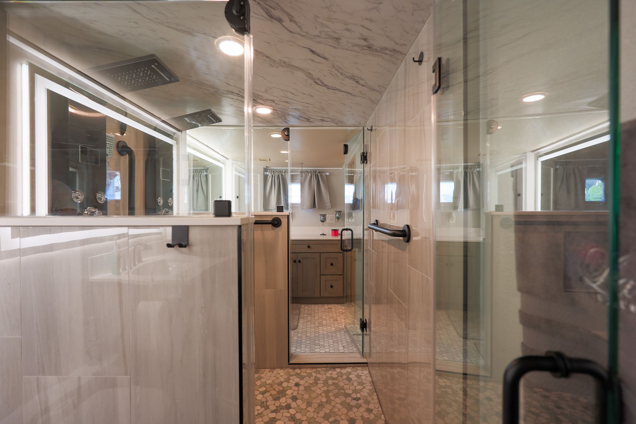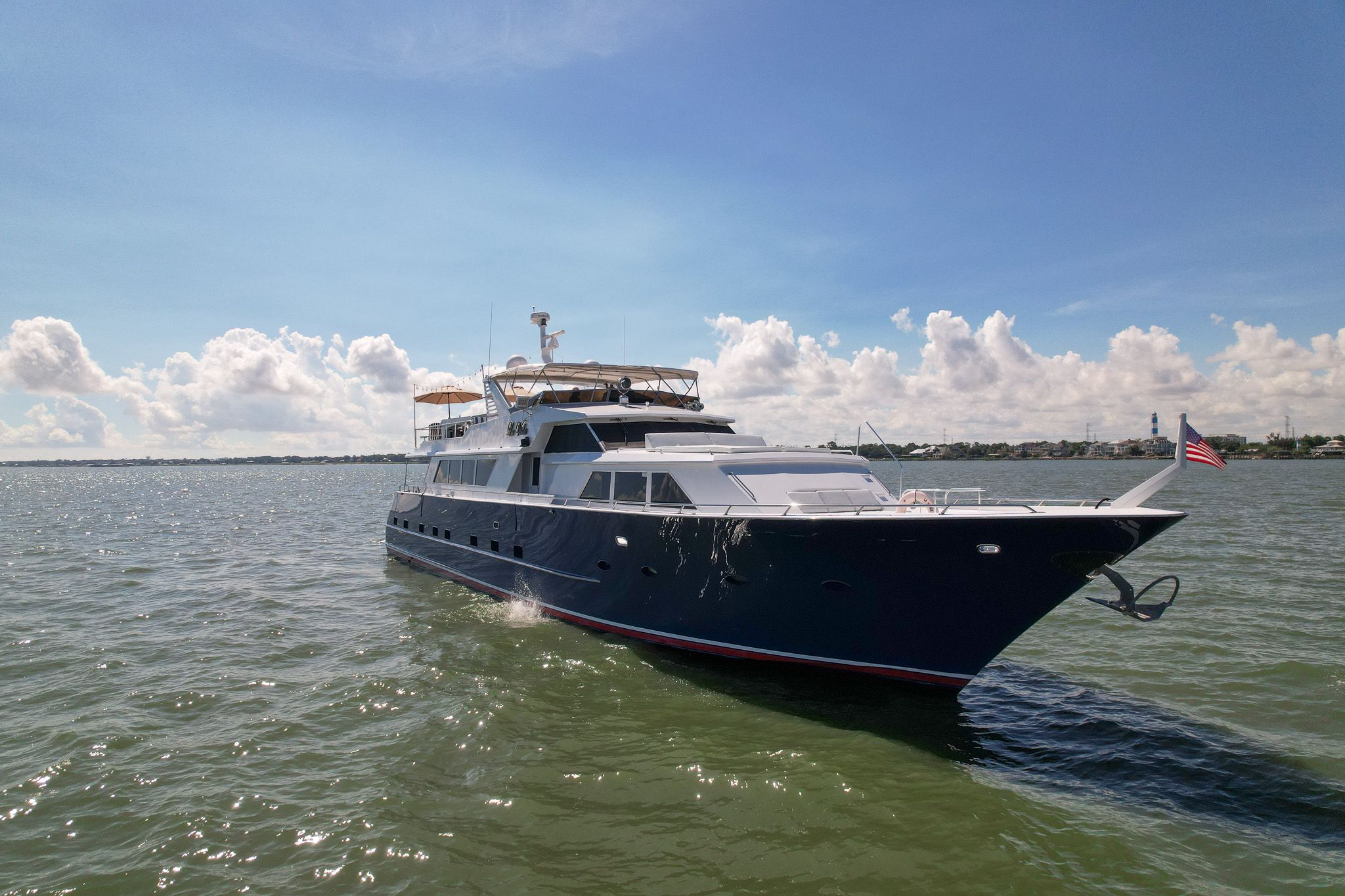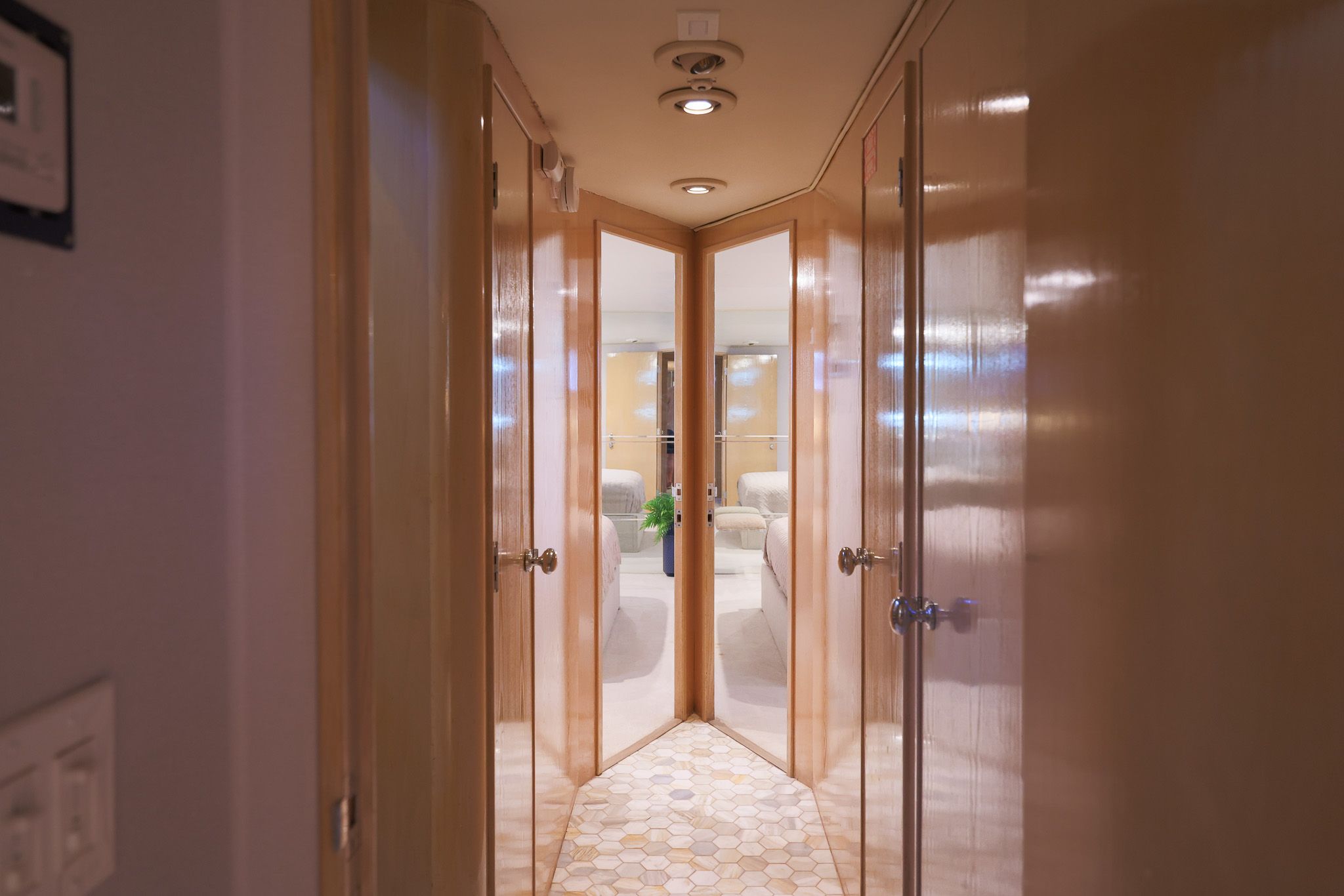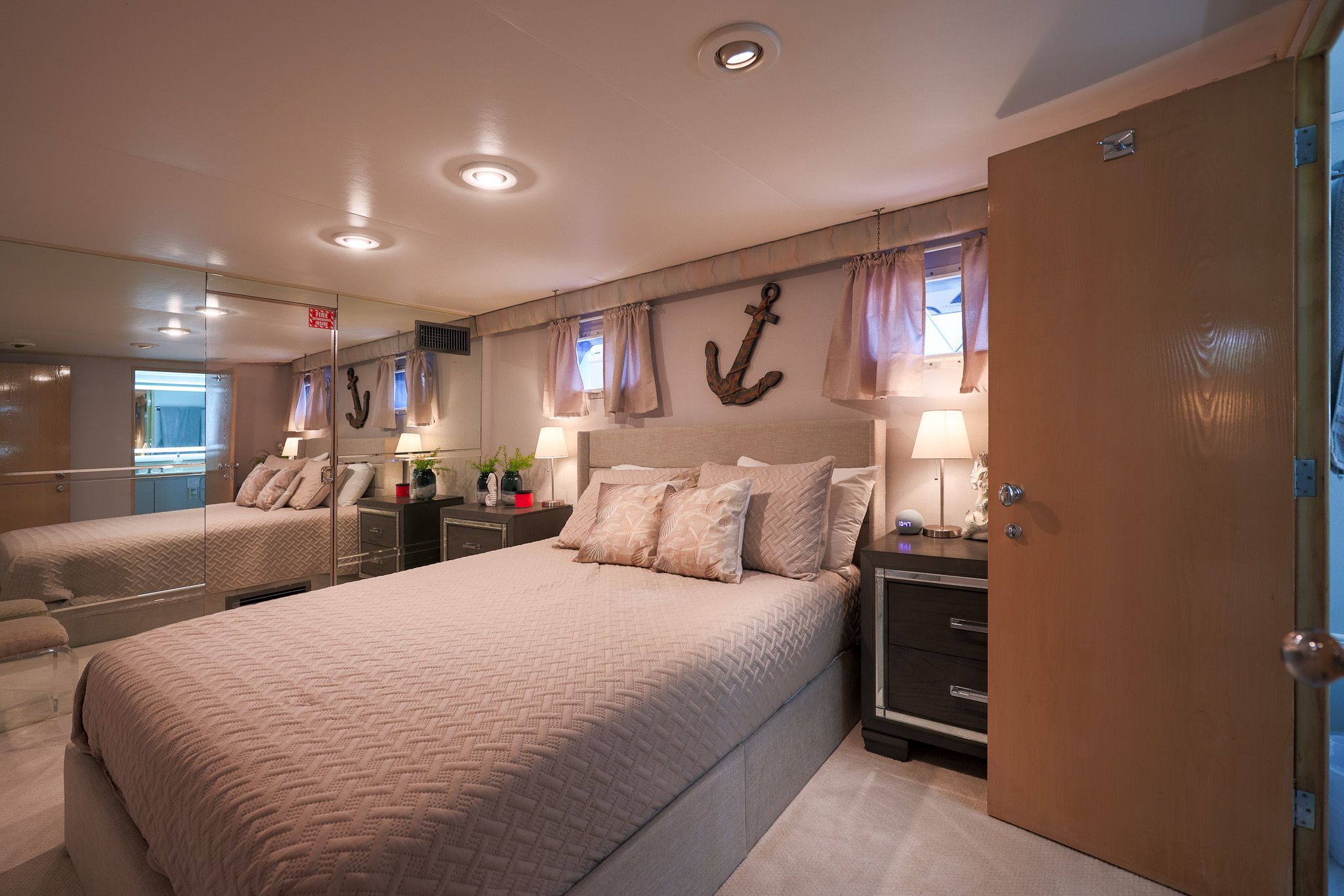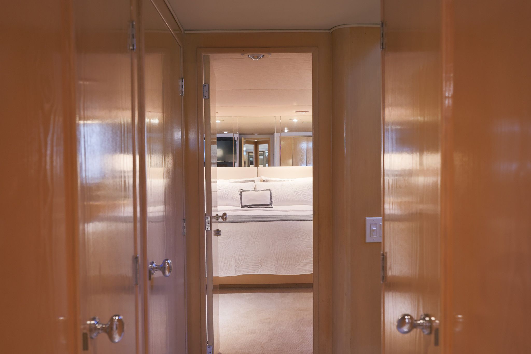 Лестница вперёд по правому борту в главном салоне ведёт вниз к гостевым каютам, отделанным светлым деревом и ковровым покрытием кремового цвета. Внизу у лестницы — холл с двумя шкафами для хранения и стиральной/сушильной машиной, скрытыми в шкафу. Мастер-каюта — полноширинная, в средней части корпуса: двуспальная кровать king-size по центру, по бокам — прикроватные тумбы с мраморными столешницами и подсвеченные панели из травлёного стекла. Встроенных комодов и выдвижных ящиков много, по левому и правому борту. По левому борту между комодами — туалетный столик, по правому — диванчик. В кормовой части — большие шкафы с кедровой отделкой и развлекательный центр.