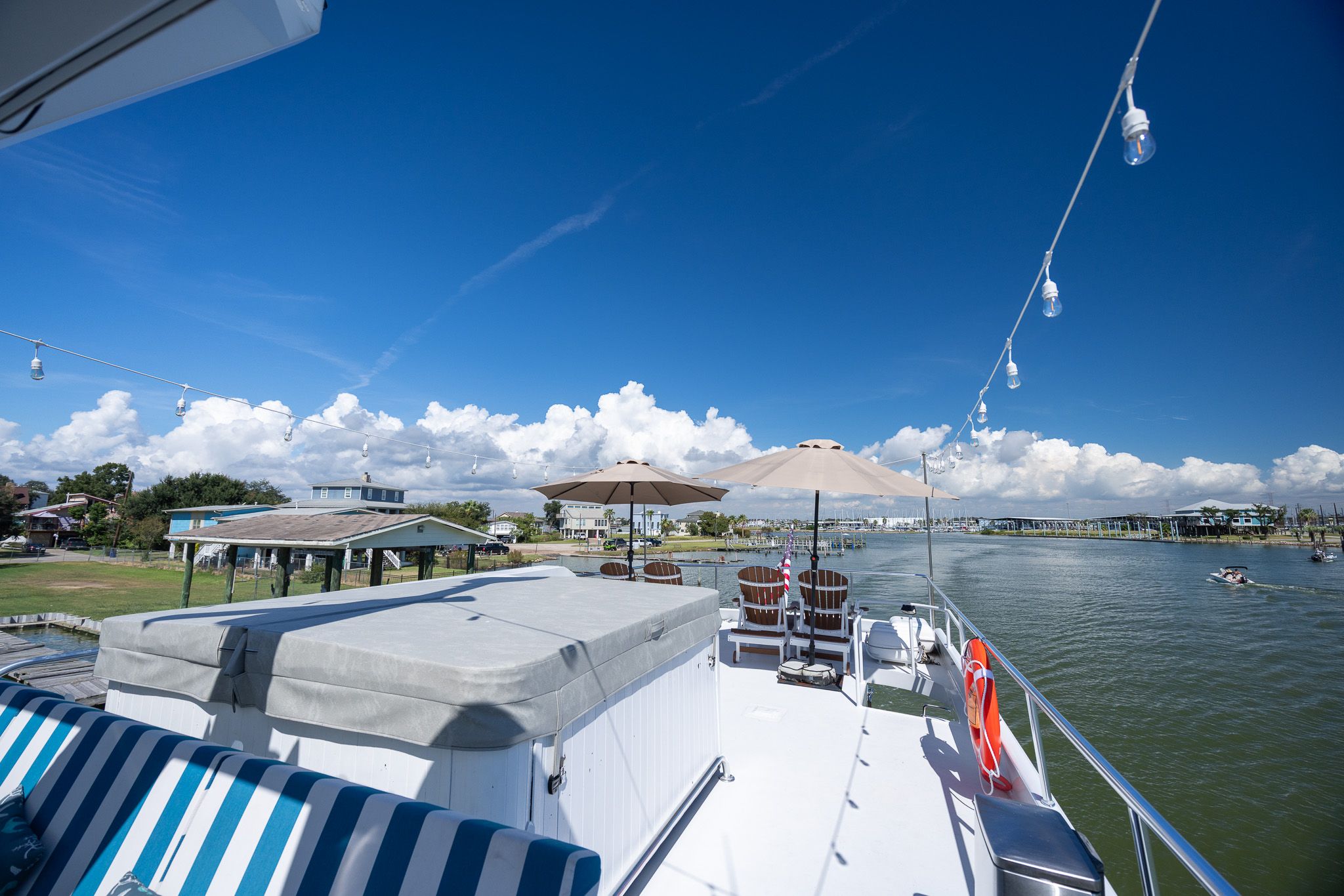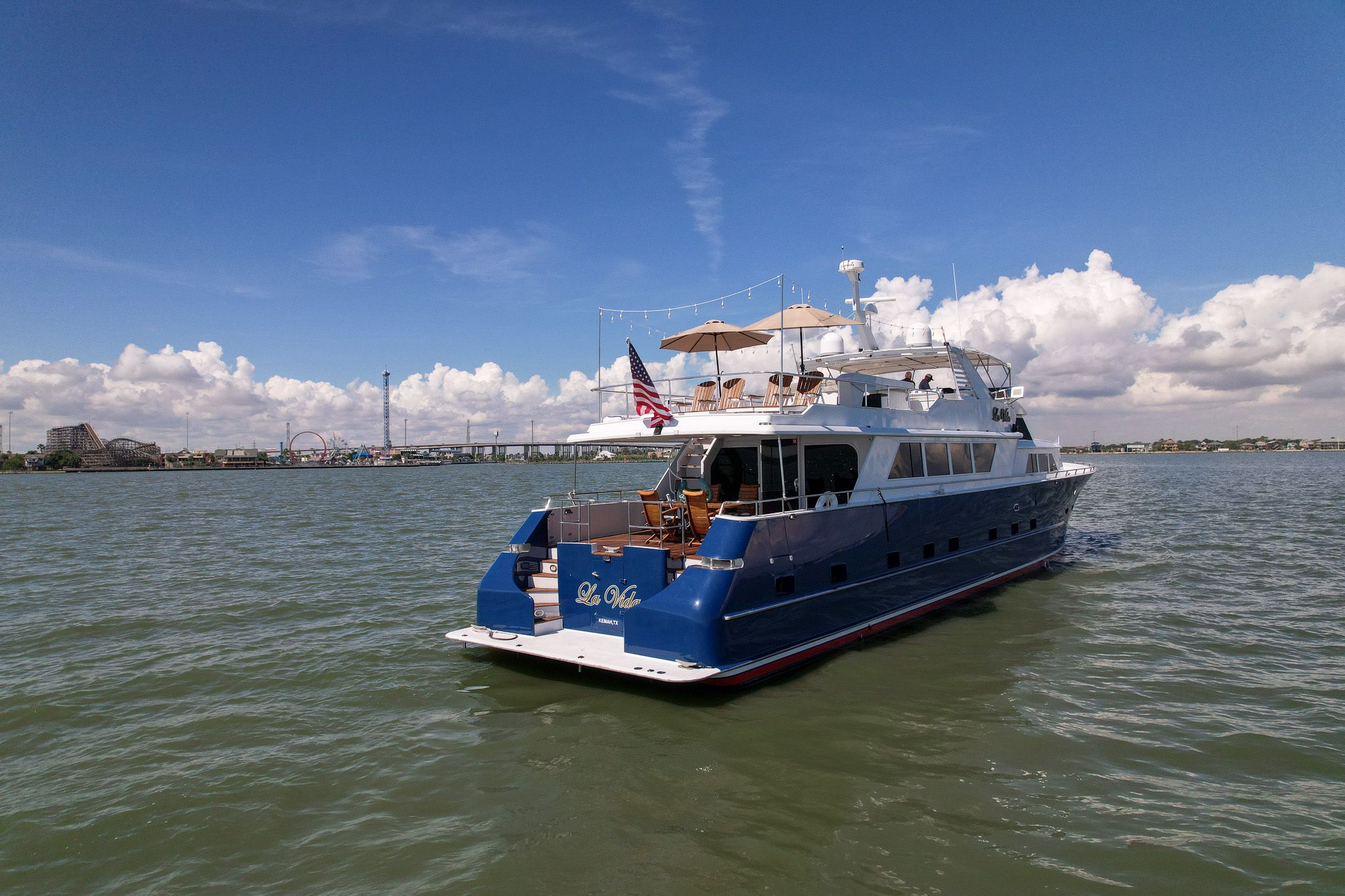 Просторный флайбридж La Vida идеально подходит для отдыха на открытом воздухе и приёма гостей: комфортные посадочные места для большой компании, круговой обзор 360° для рулевого, а увеличенный тент Bimini защищает всех находящихся на палубе. Два кресла у поста управления и полный набор навигационного оборудования. Складная мачта расширяет варианты маршрутов. Вокруг мачты — большой шкаф-модуль со множеством отсеков хранения, мокрым баром, льдогенератором, холодильником и грилем. По левому и правому борту — диваны с подушками Sunbrella, тиковой стол и стулья. Дополнительная посадочная зона по всей ширине кормы — без навеса, идеально для загара.