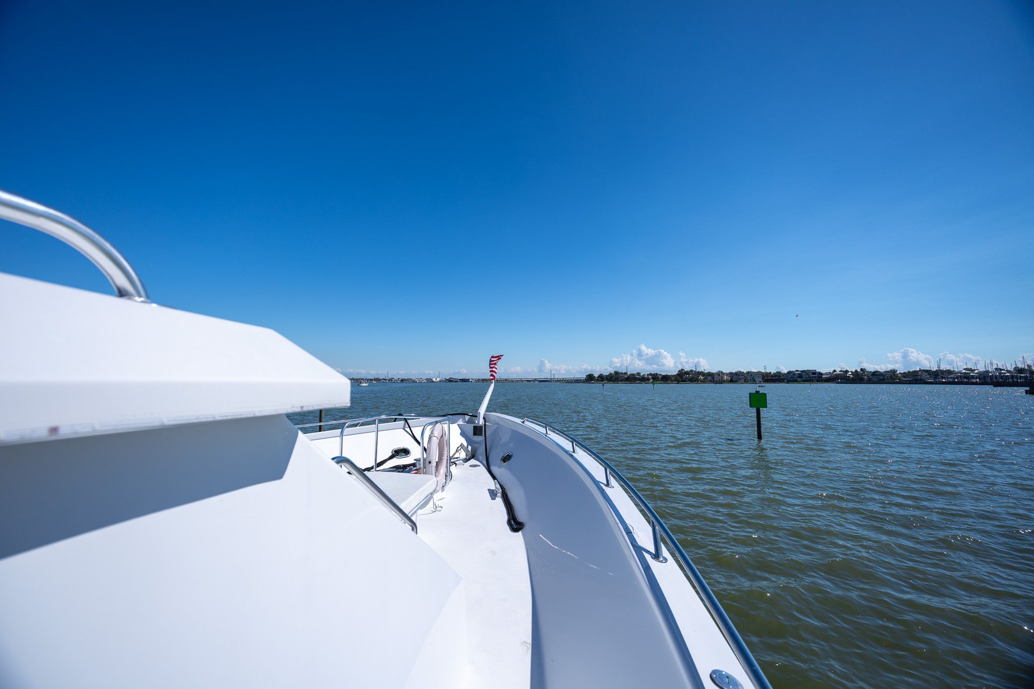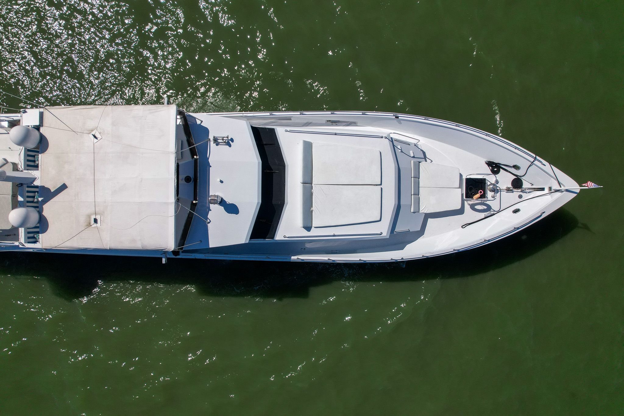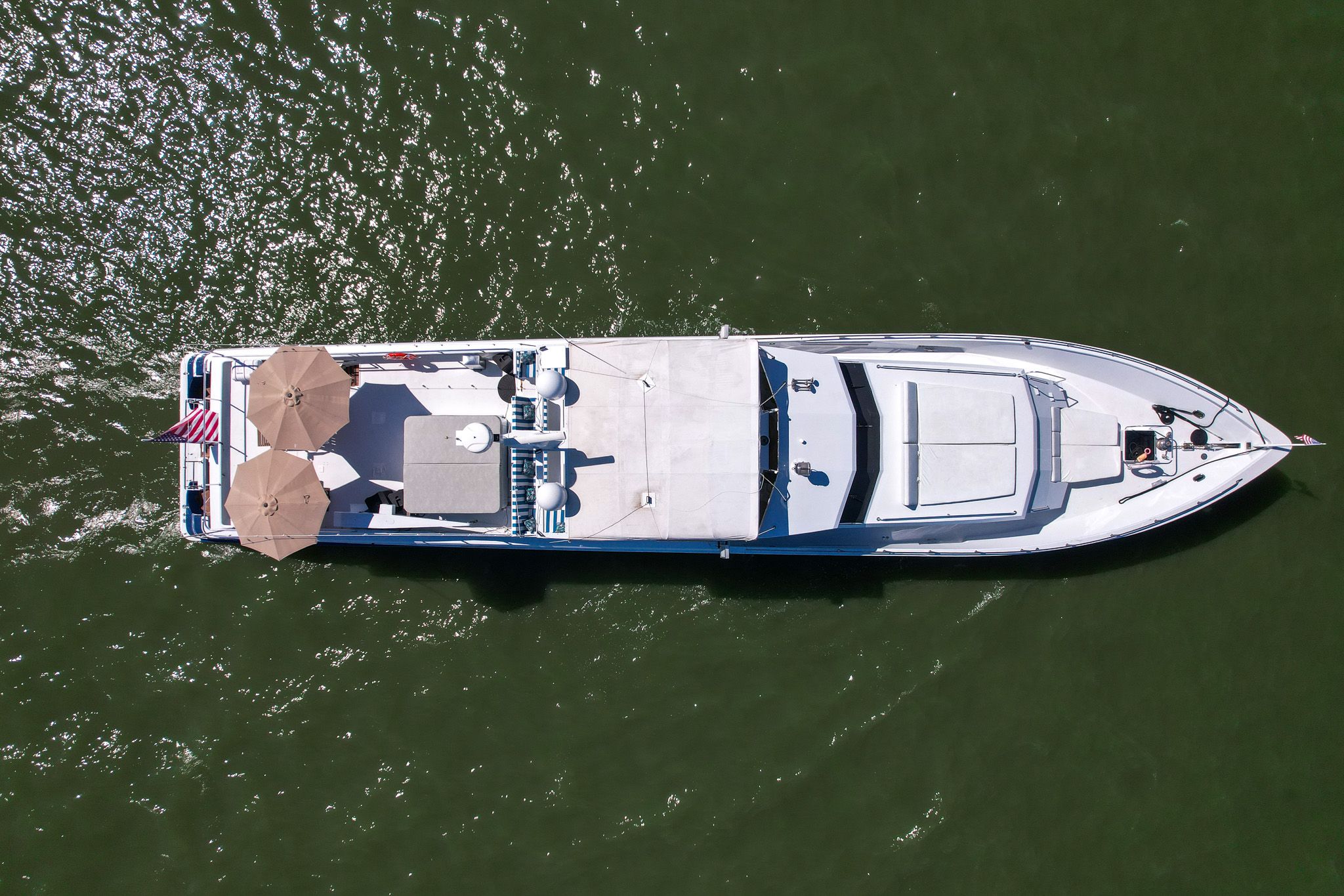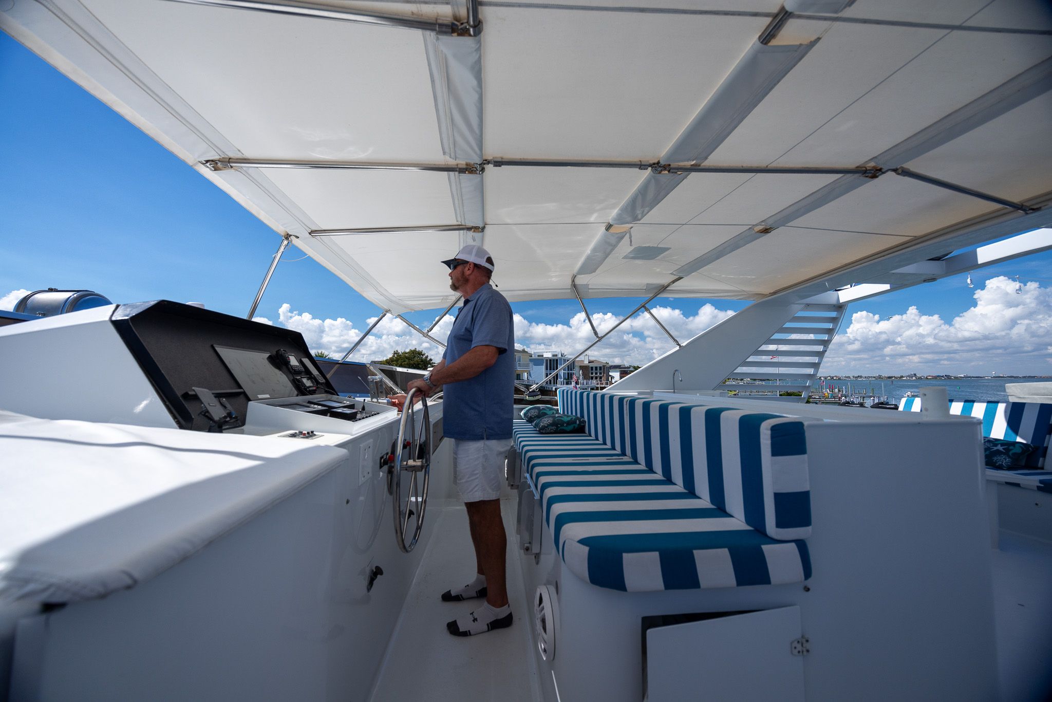 Просторный флайбридж — ещё одна отличная зона для отдыха и приёма гостей на открытом воздухе. Тент Bimini над постом управления, кресла капитана и помощника на пьедесталах, полный комплект электроники, панорамные виды и много посадочных мест для гостей.