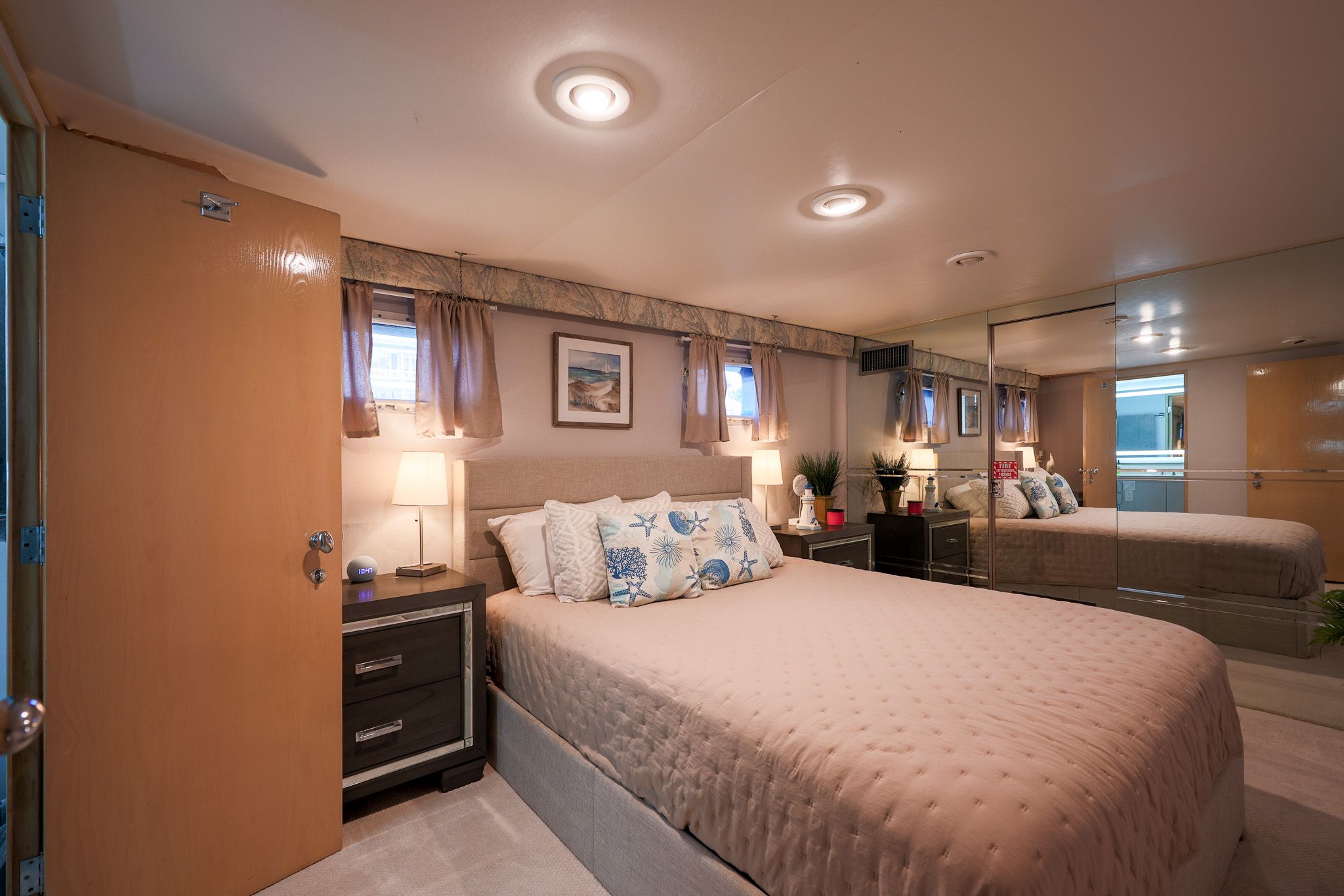 - Кремовый виниловый подволок с зеркалом над кроватью