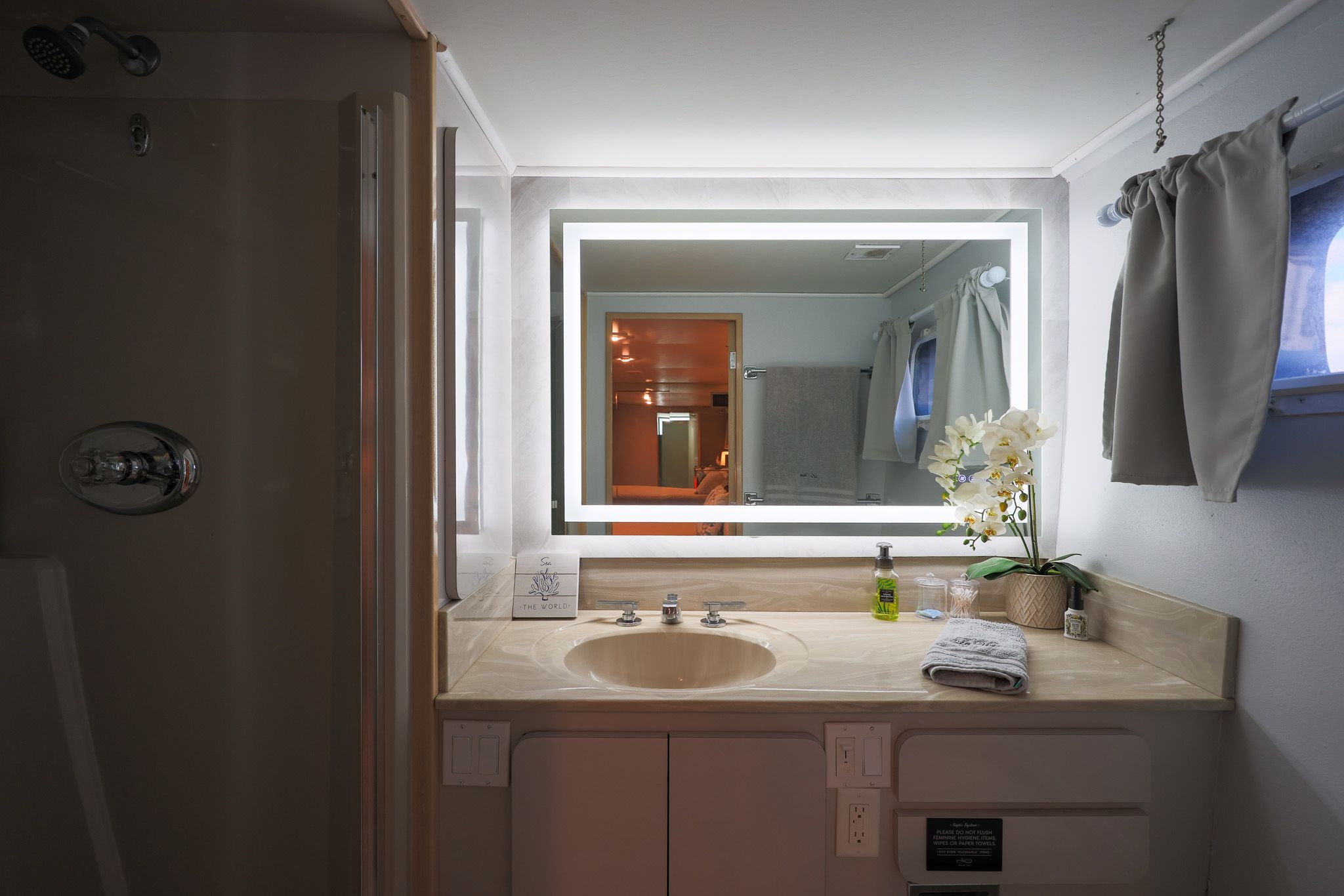 Мастер-каюта: элегантная и просторная, с кроватью king-size, диванчиком, обширным хранением в ящиках и шкафах, раздельными санузлами «his & hers», и развлекательным центром.