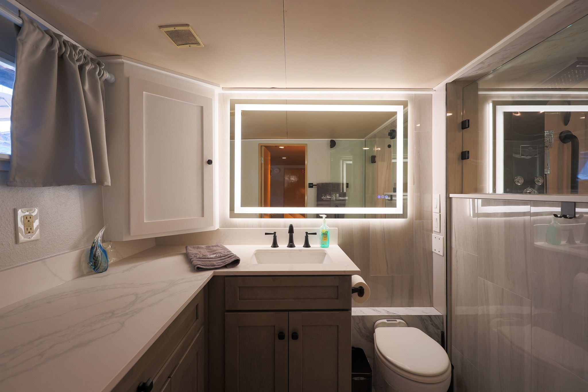 - Освещаемый шкаф с кедровой отделкой и зеркальными складными дверями