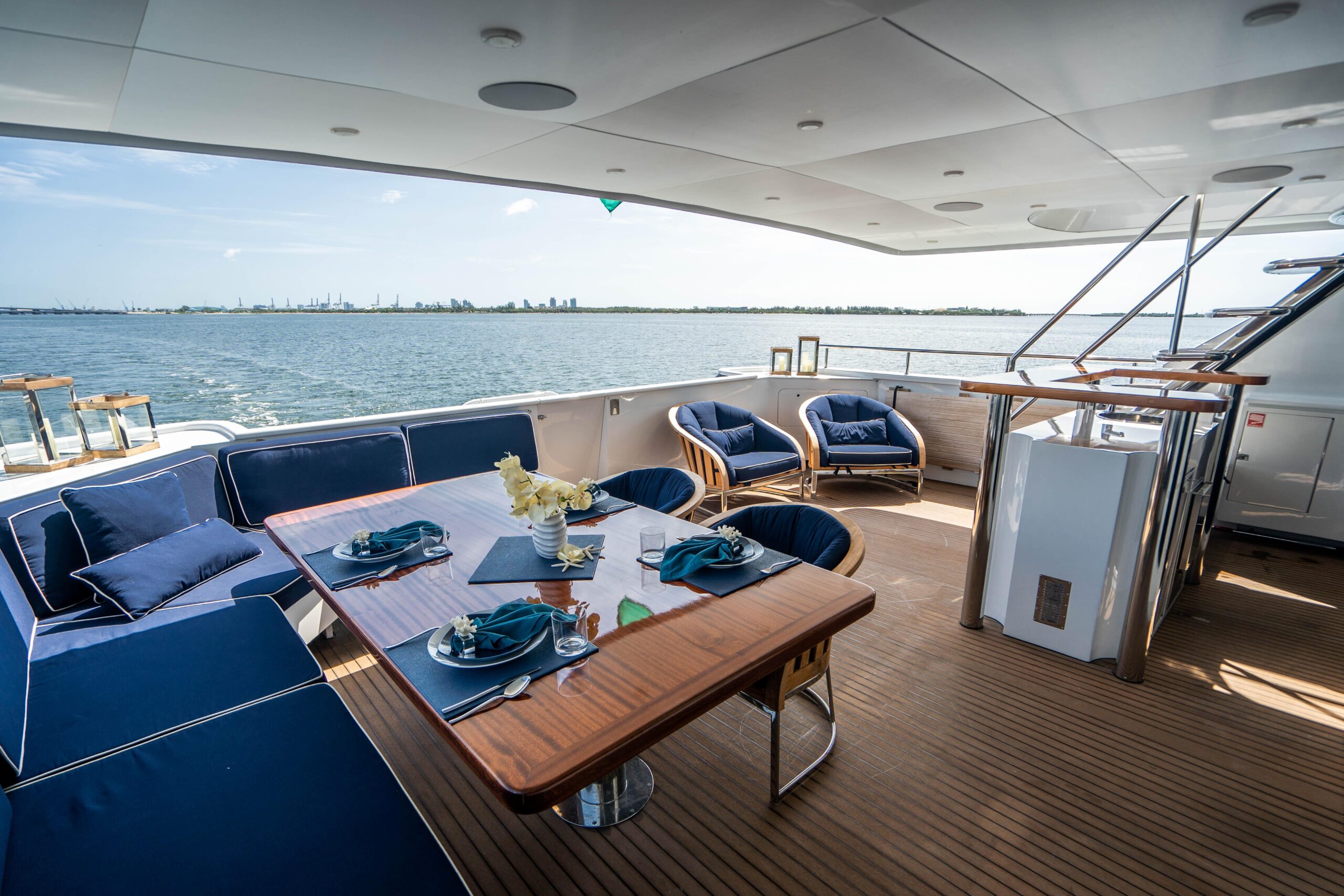 Ещё выше — солнечная палуба (sun deck) с дополнительными местами для отдыха под аркой коммуникационного оборудования яхты. Ранее здесь располагалась гидромассажная ванна (подводка и проводка сохранены и скрыты), а теперь пространство даёт великолепный вид на закат или, возможно, на салюты 4 июля.