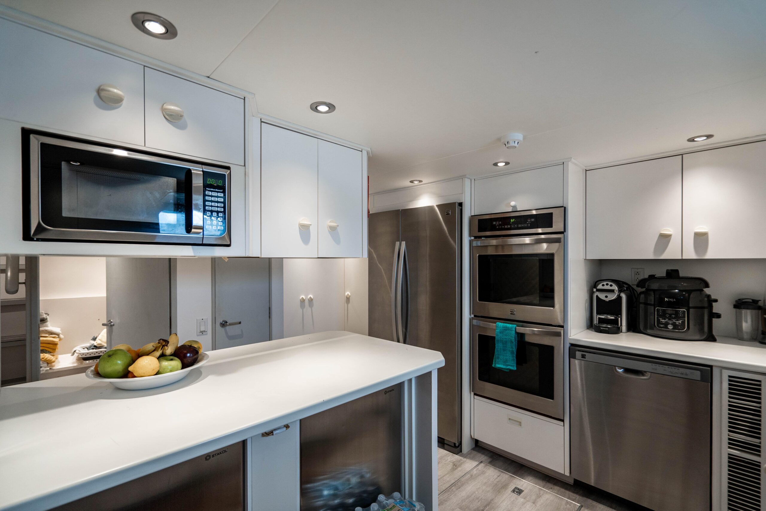 Вход для гостей по правому борту ведёт в удобный холл, откуда можно пройти вперёд в мастер-каюту, подняться на палубу мостика и в sky lounge или пройти назад в обеденный салон. По правому борту, непосредственно перед стеклянной дверью в открытый главный салон, расположена винная зона с винными полками, винным холодильником Kedco и подсвеченной витриной. Здесь же находится дневной туалет (day head). Пройдя дальше в корму, вы попадаете в салон во всю ширину корпуса, где размещён обеденный стол на восемь гостей. Стол оснащён автоматической вставкой-листом, позволяющей одним нажатием превращать его в более компактный вариант для камерных ужинов. Встроенная лакированная мебель даёт много места для хранения посуды и белья, а также служит буфетом во время приёмов пищи. В салоне — мягкая удобная мебель, недавно перетянутая в спокойных кремовых тонах, и большой изогнутый телевизор в углу для киновечеров. Через двери на корме — просторная зона на палубе с местами для отдыха и обедов и полностью оборудованным баром. Рабочая зона палубы расположена ниже, за этой площадкой, над купальной платформой и лазаретом. Внутри, изогнутая лестница из салона ведёт на нижнюю палубу, где вокруг центрального холла находятся три гостевые каюты. Носовая каюта по правому борту — с двумя односпальными кроватями и санузлом с ванной-джакузи; по левому борту — гостевая каюта с кроватью queen size, шкафами, TV и санузлом с ванной-джакузи, а также небольшой зоной отдыха. В корме расположена VIP-каюта с кроватью king size и просторным санузлом с туалетным столиком, двумя раковинами и ванной-джакузи.