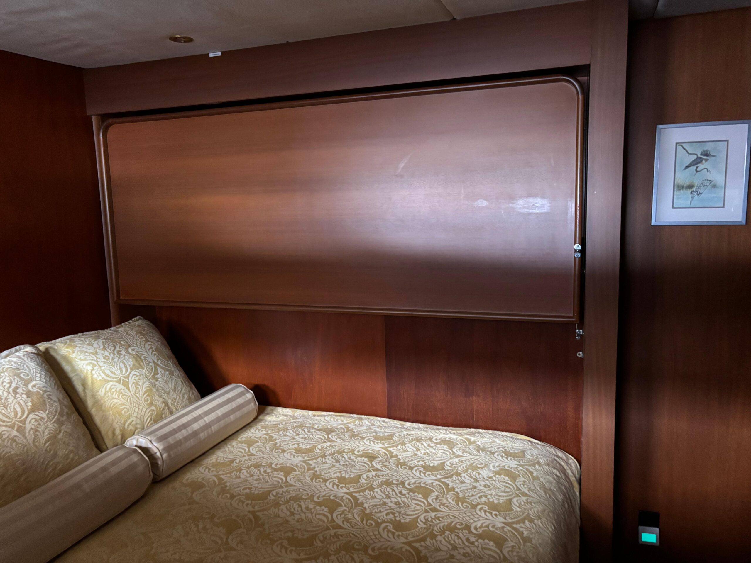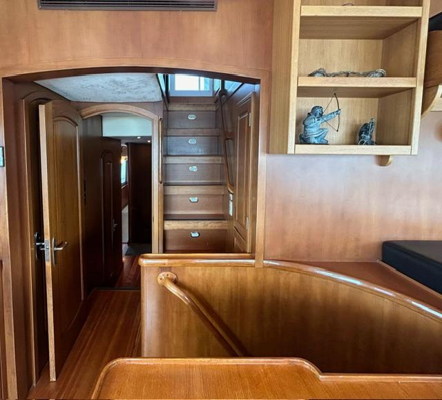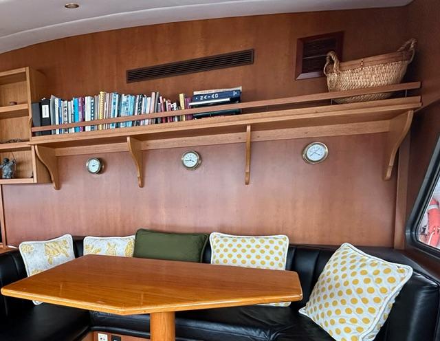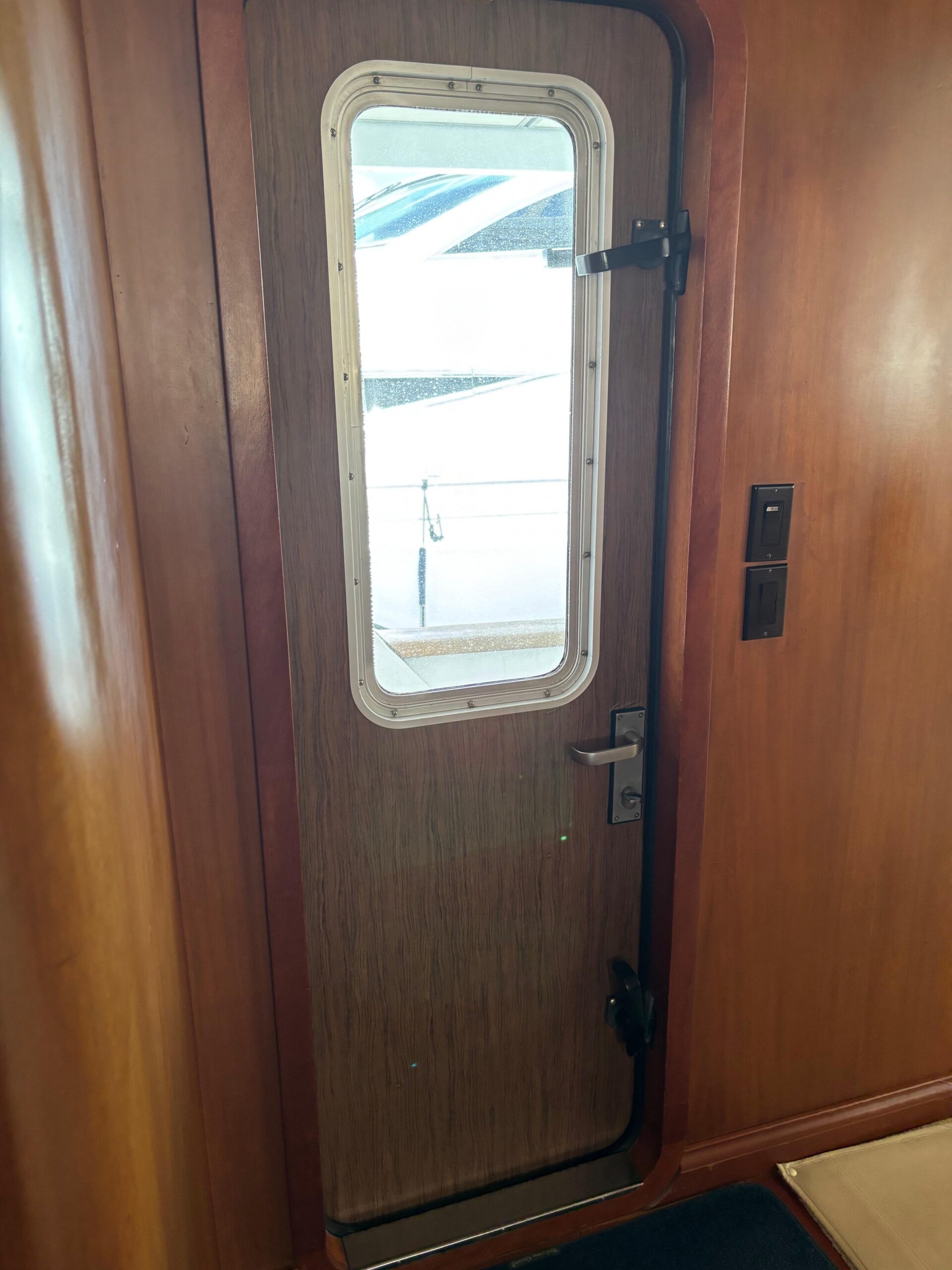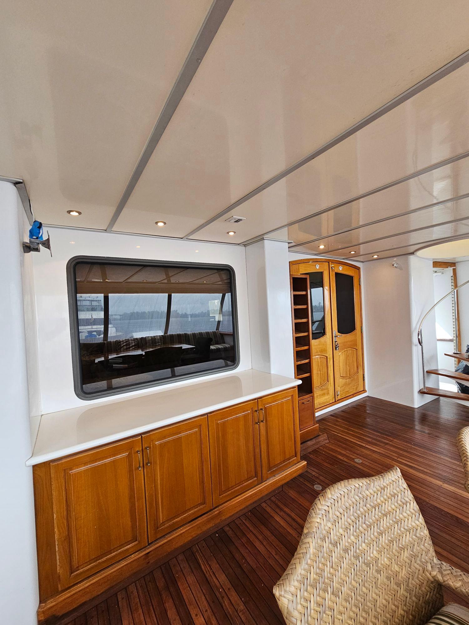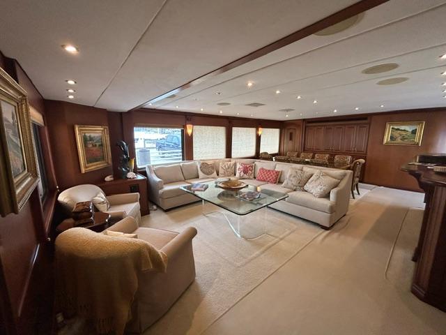 В салон можно попасть через французские двери с кормовой палубы или спереди — через водонепроницаемую дверь из рулевой рубки. Большие окна обеспечивают живописные виды, дают много естественного света и создают уютную атмосферу в просторном салоне. Панели из махагони средней тёмности и формованный декоративный профиль добавляют элегантности и тепла.