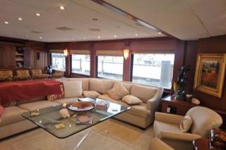 По левому борту расположена большая зона отдыха с Г-образным диваном и креслами. По правому борту: ближе к корме — рабочее место/стол, ближе к носу — просторная барная зона с проходом. Барная стойка отлично подходит для сервировки фуршета для обеденной зоны, расположенной впереди по левому борту.