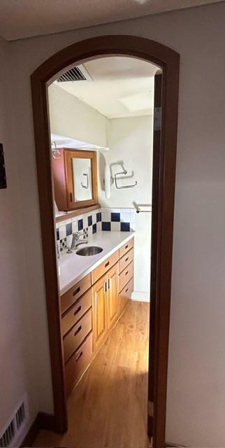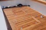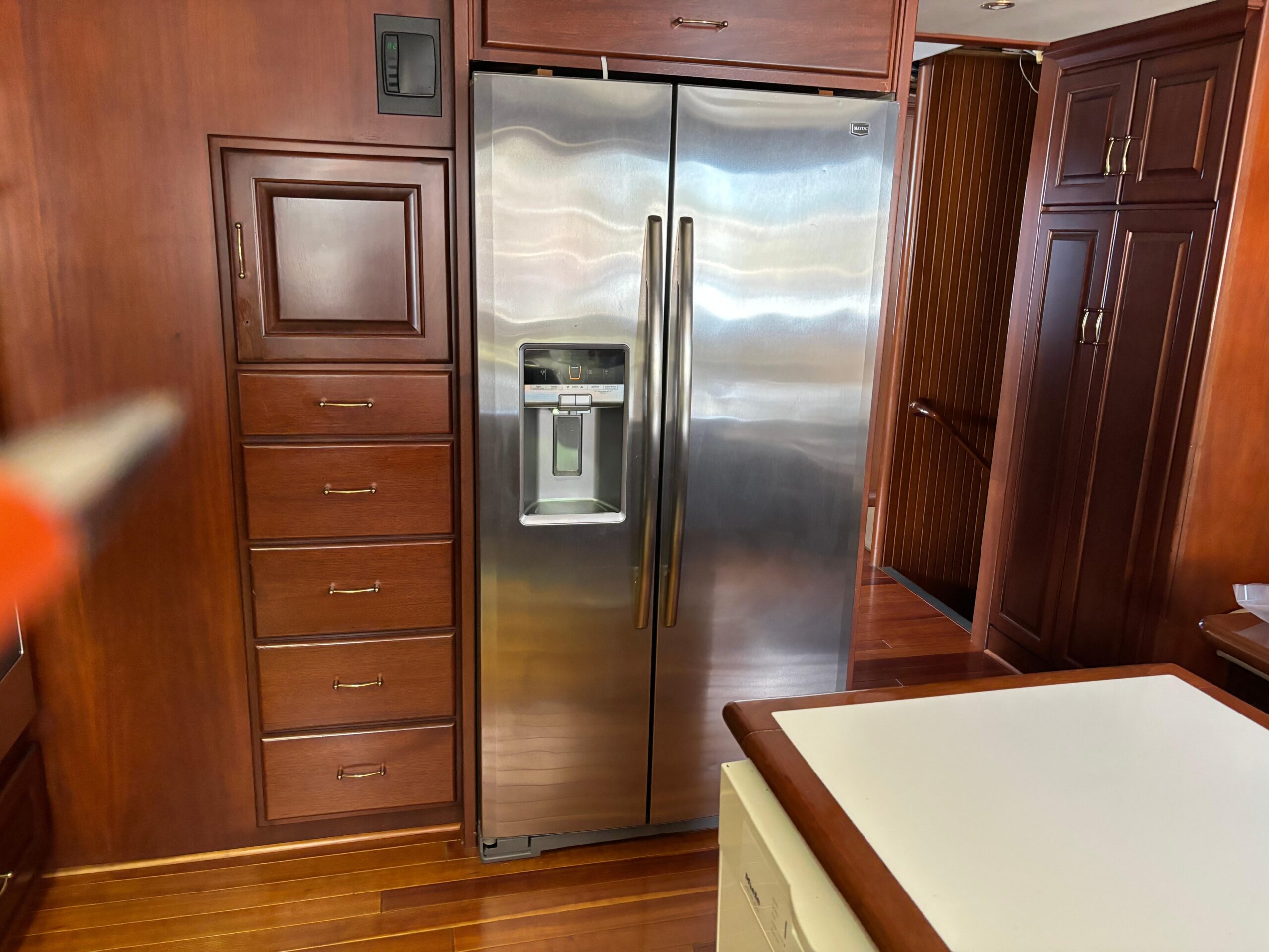 Просторный «домашний» камбуз в стиле country kitchen расположен по левому борту — на несколько ступеней выше обеденной зоны и позади рулевой рубки. Гостевой дневной санузел находится по правому борту. Также в камбуз можно попасть через боковую дверь правого борта — удобно для загрузки провизии. Большой Г-образный диван создаёт комфортную обеденную зону для семейного формата. Большие открывающиеся окна обеспечивают отличные виды и приток свежего воздуха.