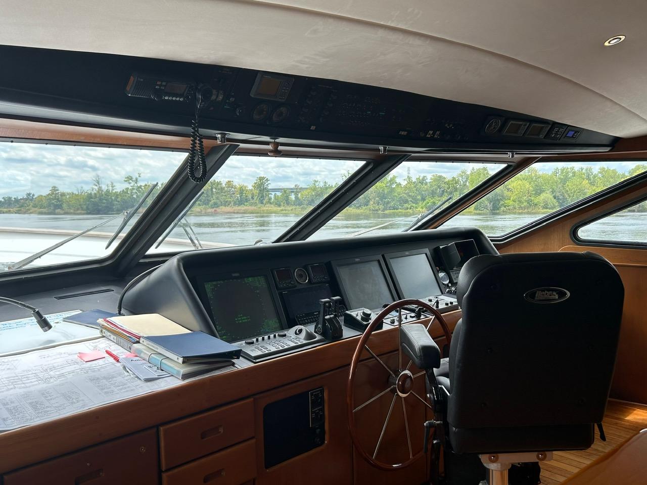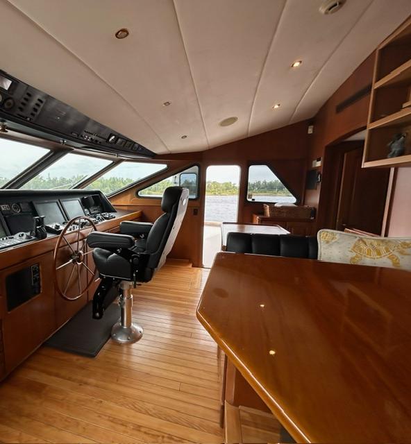 Вход в рулевую рубку — из салона/камбуза или через водонепроницаемые двери по левому и правому борту со стороны бортовых проходов. Г-образный диван рассчитан на 5 человек. Полноценная консоль с набором экранов и электроники, удобно расположенных для доступа.