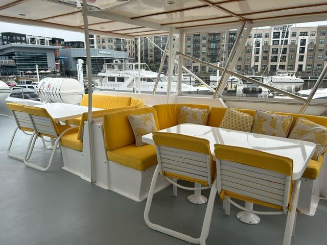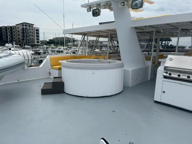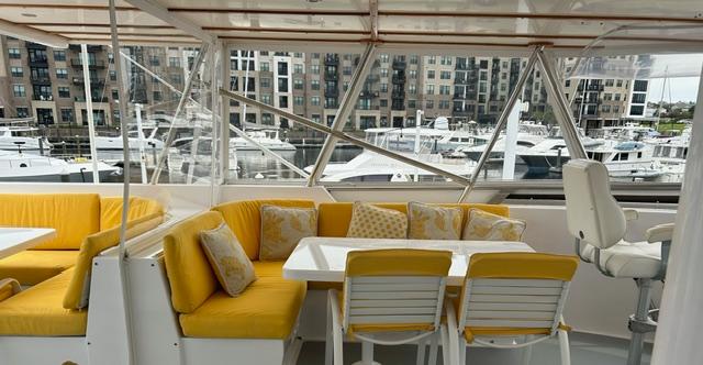 На флайбридж можно подняться снаружи по винтовой лестнице с кормовой палубы или изнутри — через рулевую рубку. Два полноценных поста управления. Отличная обзорность и манёвренность благодаря трём постам управления: по левому борту, по правому борту и кормовому. Большая зона отдыха и развлечений предлагает места как под жёсткой крышей в тени (с обеденным столом), так и на открытом воздухе (также с большим обеденным столом). За зоной под хардтопом расположена гидромассажная ванна на 6 человек. Полноценный бар.