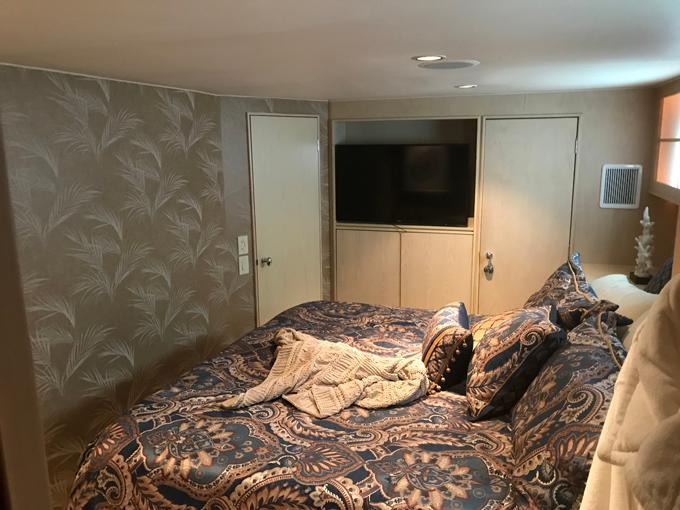 Далее по борту расположен шестидверный шкаф из ясеня с подъёмным телевизором Samsung 50" LED. Внутри шкафов и ящиков размещены Blu-ray плеер Samsung, ресивер Bose и DC-питаемый JVC AM/FM/CD проигрыватель.
