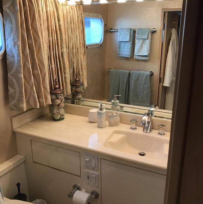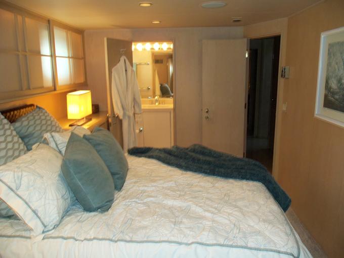 Уникально для этой яхты Broward: в средней части корпуса расположены две мастер-каюты с кроватями king-size, каждая с собственным санузлом. В каюте по правому борту — ванна с душем, по левому — просторная душевая. Такая планировка максимально эффективно использует жилое пространство яхты.