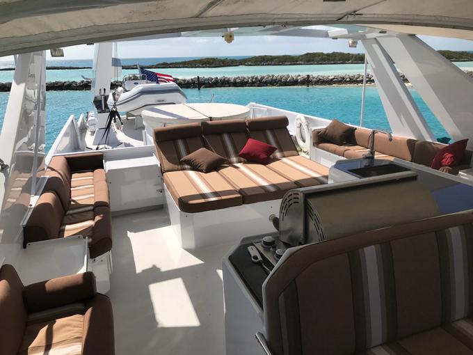 Среди удобств кормовой палубы — мокрый бар, плоский телевизор и полукруглые ступени, ведущие на флайбридж.