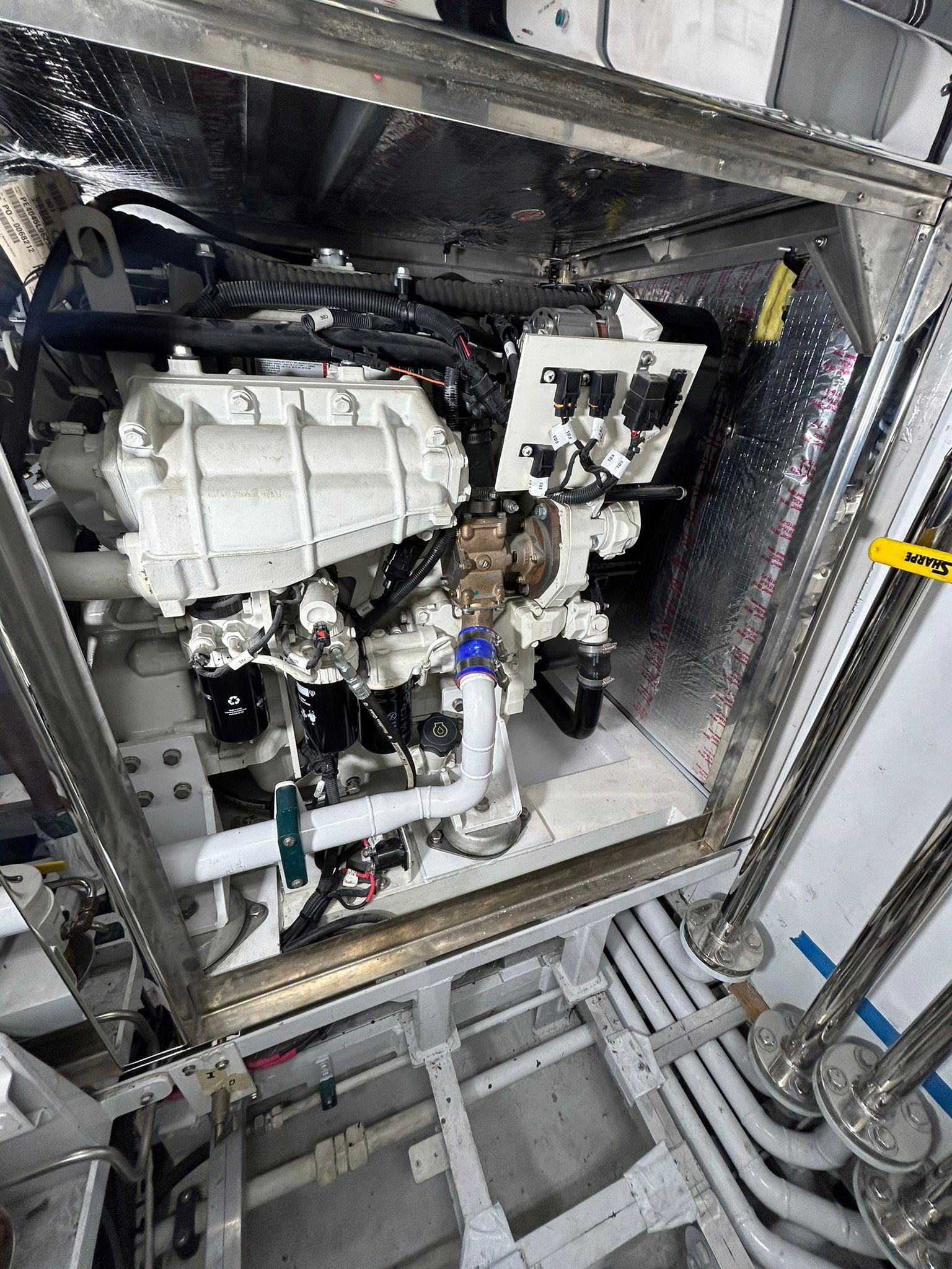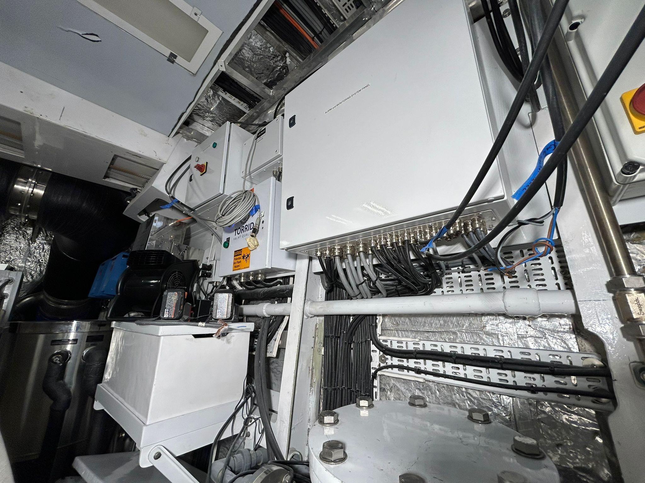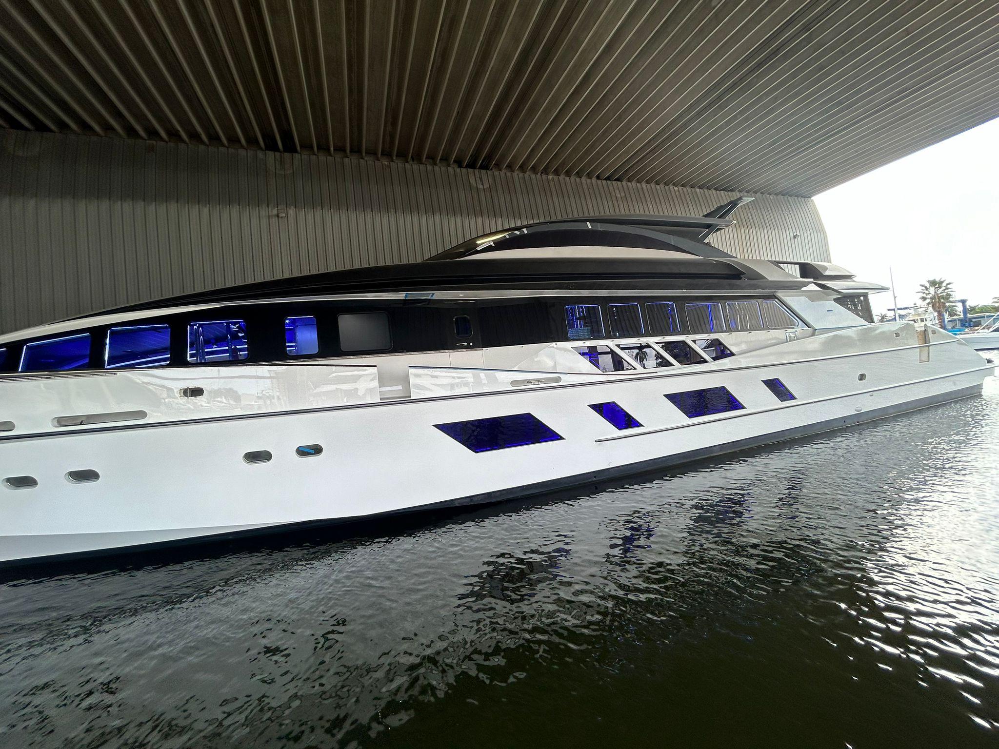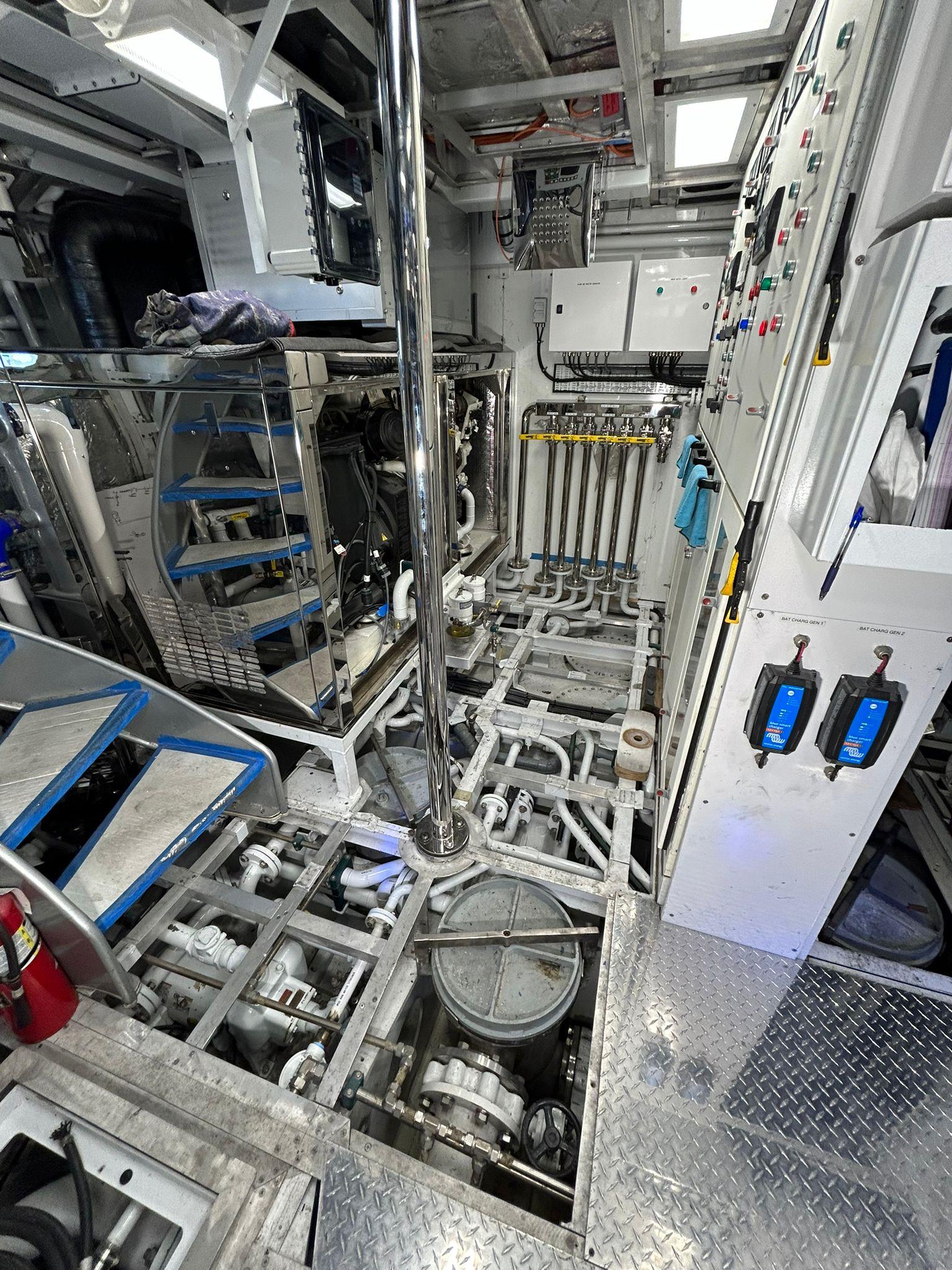 Существенный объём работ уже выполнен. Все основные системы были заменены на абсолютно новые, ни разу не запущенные и не введённые в эксплуатацию, включая главные двигатели, генераторы и системы SeaKeeper. Полностью обновлены системы водоснабжения и электропроводка, все танки восстановлены, водомётные движители и реверсивные ковши перебраны. Обшивка днища прошла полное ультразвуковое измерение толщины.