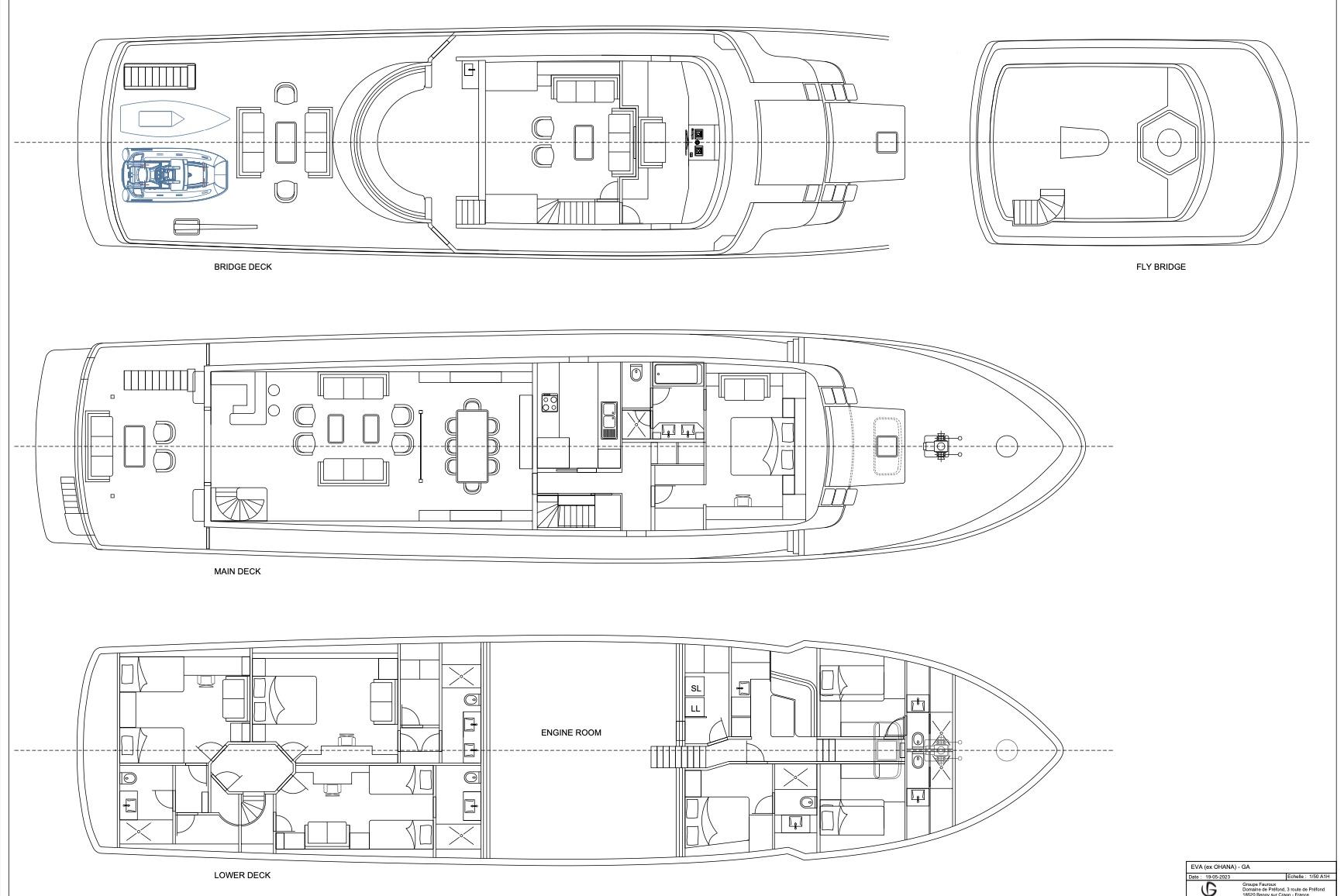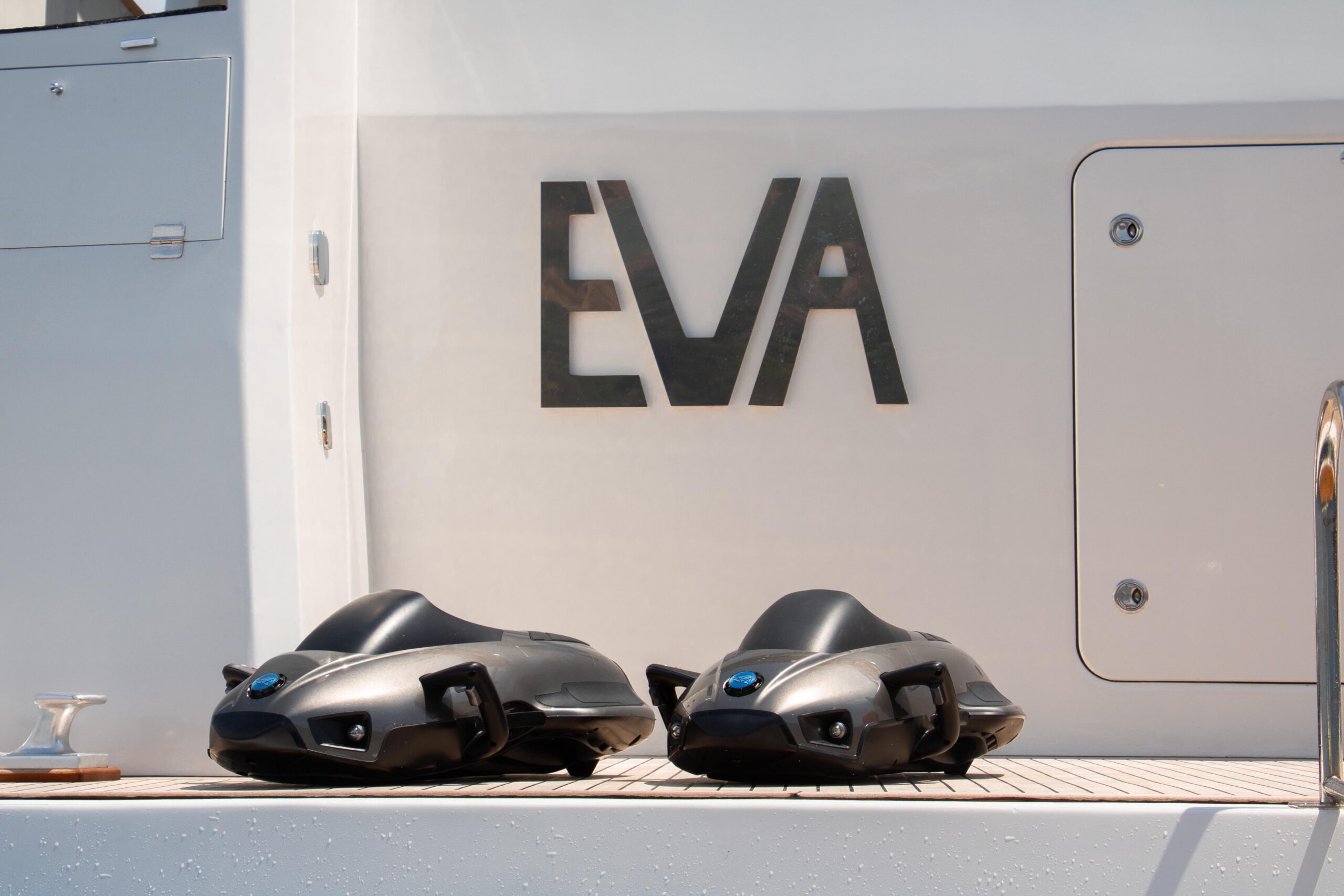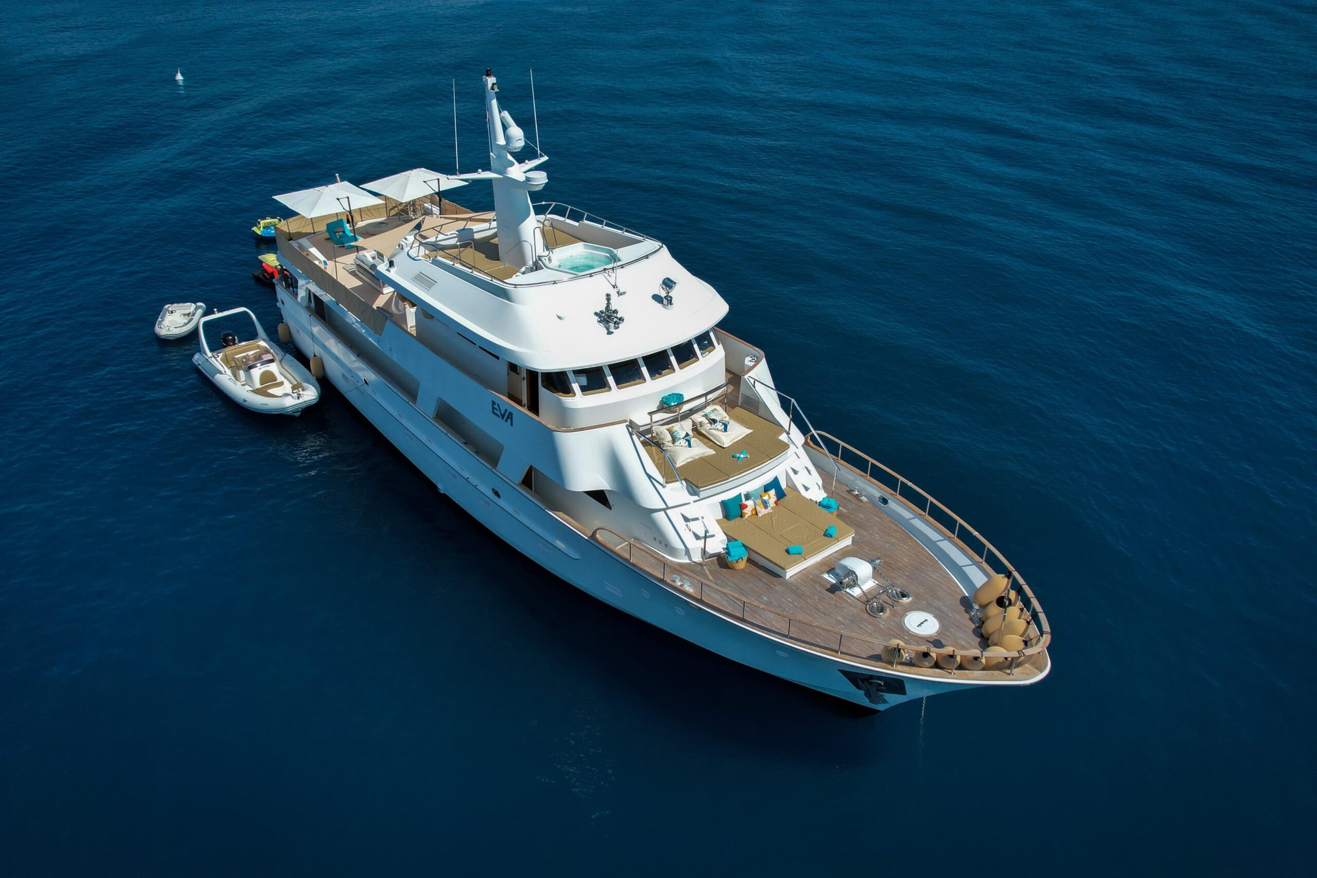 EVA предлагает исключительное пространство как для частного использования, так и для чартеров. Тёплые и изысканные интерьеры включают просторный главный салон с полностью оборудованным баром и обеденной зоной, а также уютный верхний салон с большим телевизором и комфортной зоной отдыха. Благодаря дальности хода, стабилизаторам и экономичному крейсерскому режиму EVA идеально подходит для продолжительных круизов по Средиземному морю с максимальным комфортом. За последние годы EVA имеет успешную чартерную историю.