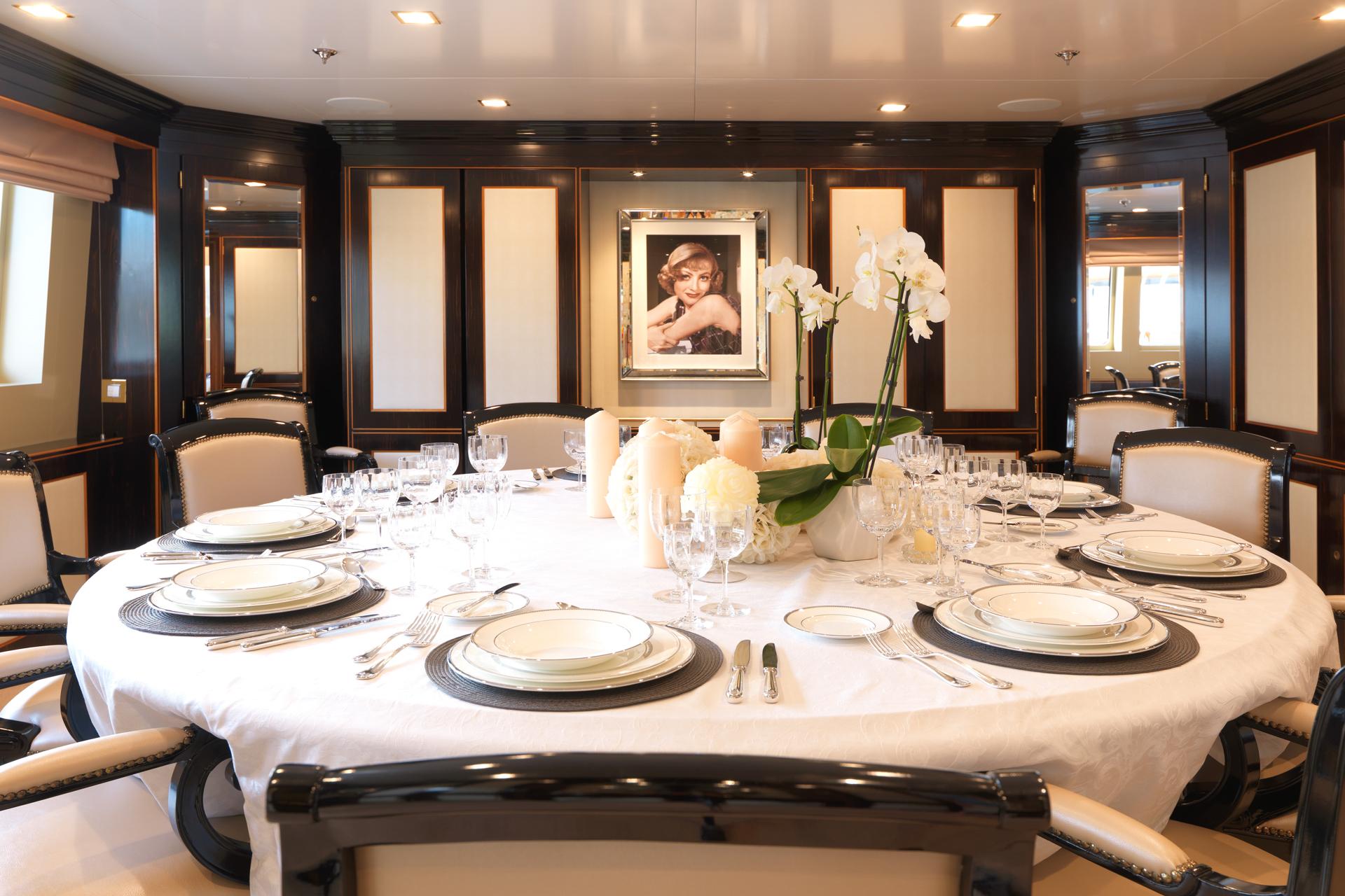 Интерьер вдохновлён одним из лучших лондонских бутик-отелей класса «гранд», расположенным в районе Найтсбридж — The Wellesley. Он выполнен в вневременном и роскошном стиле ар-деко, передающем атмосферу утончённости и комфорта. Размещение рассчитано на 12 гостей и включает две мастер-каюты (одну на нижней палубе и одну на верхней), VIP-каюту на главной палубе, две каюты с раздельными кроватями и одну каюту с двуспальной кроватью.