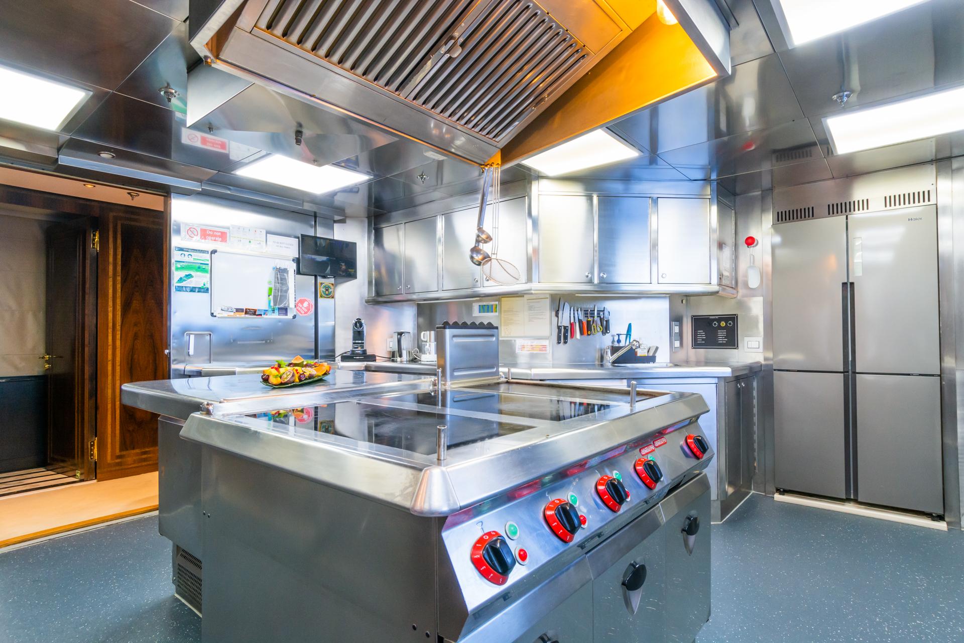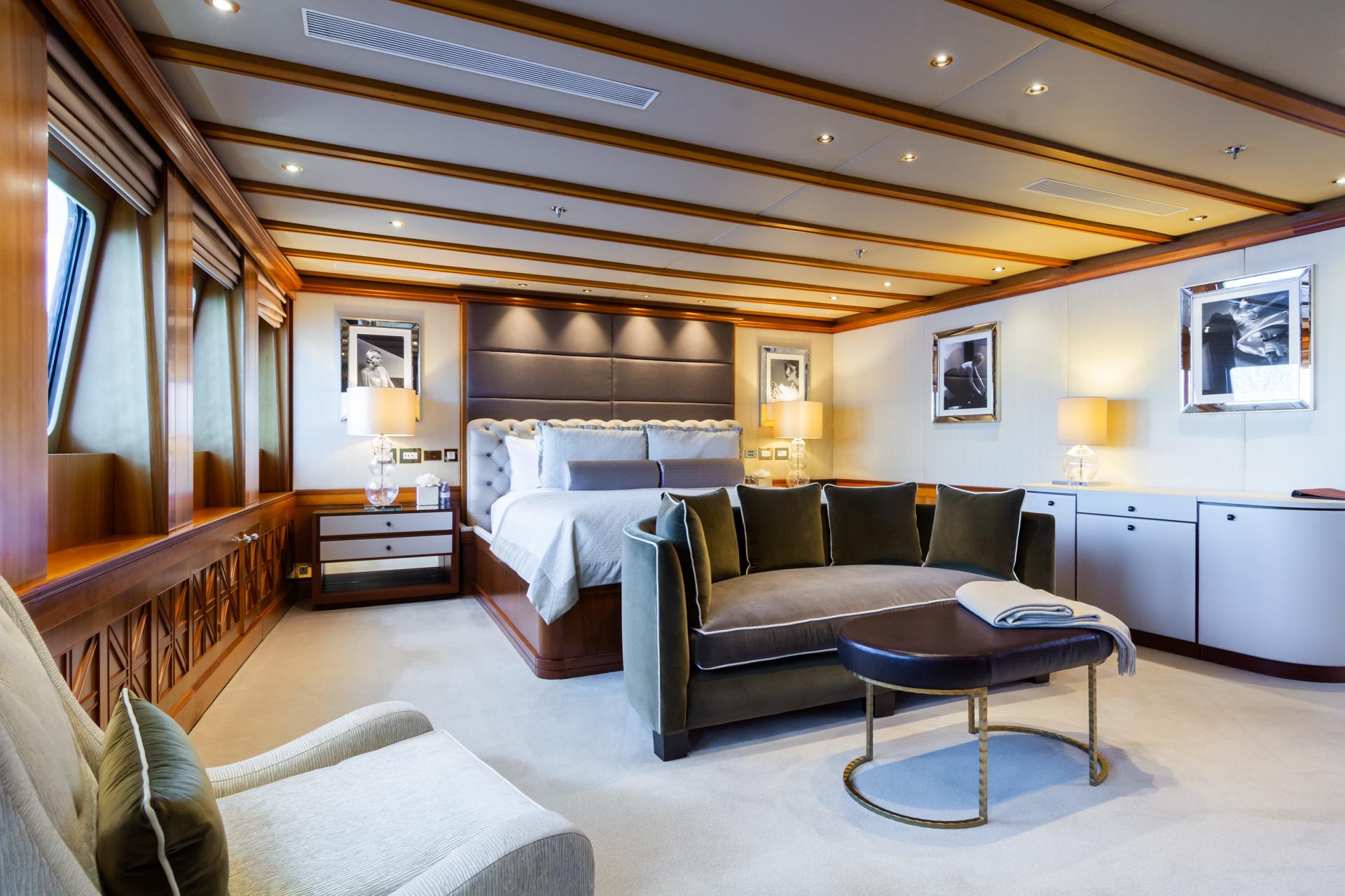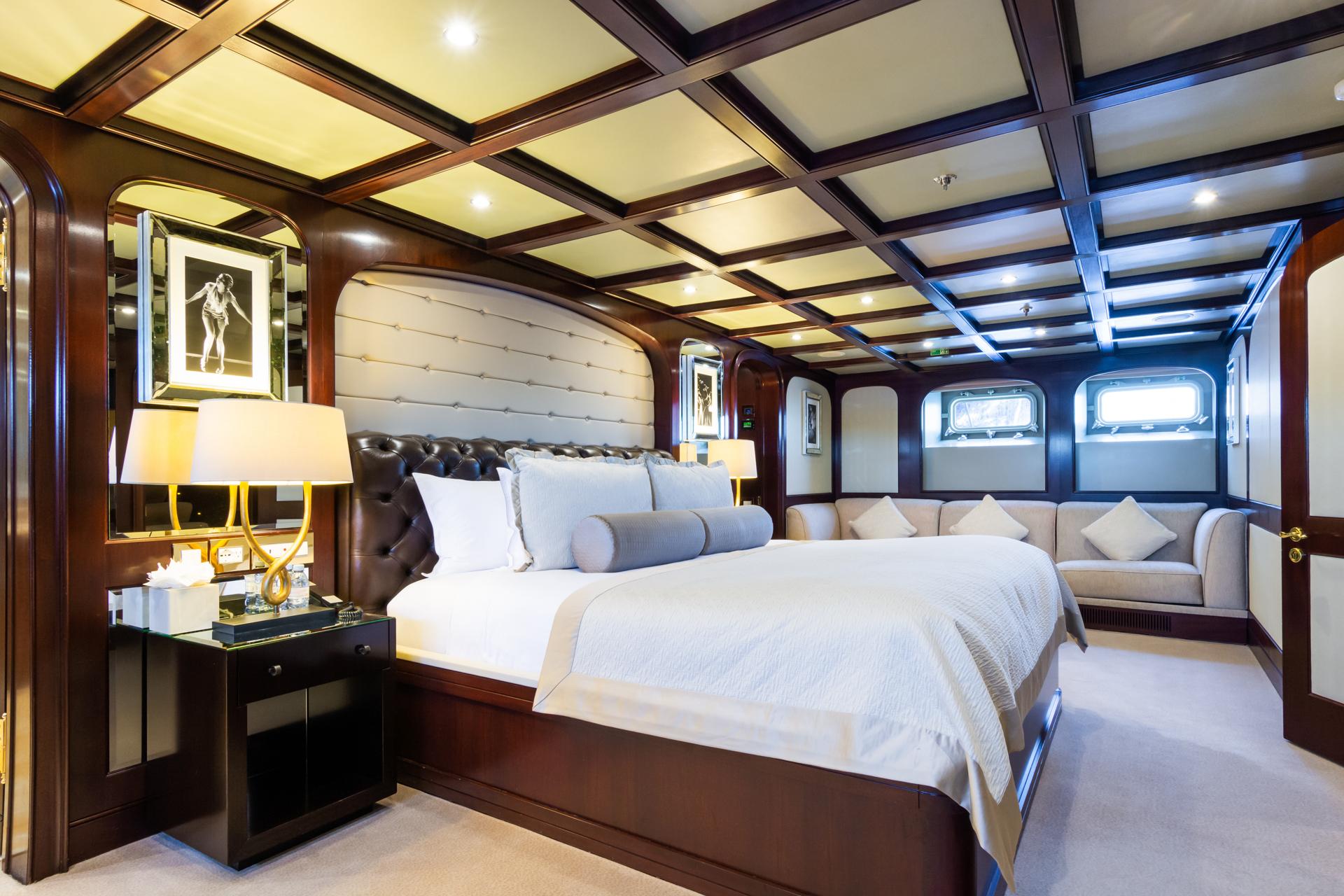 – Главная палуба: 1 × гостевая каюта с кроватью king size и ванной комнатой ensuite.