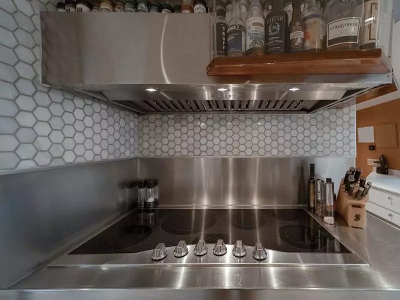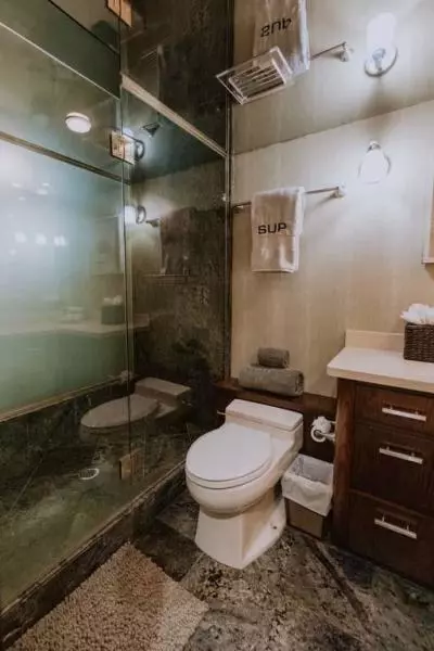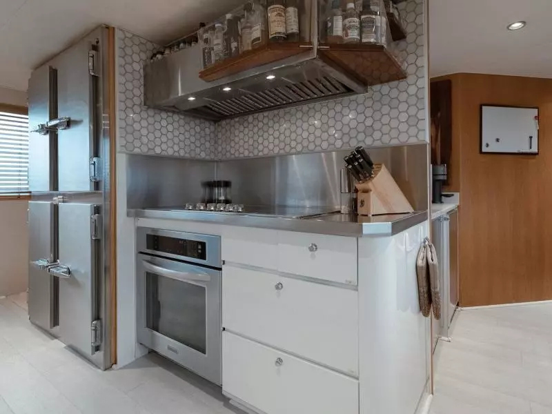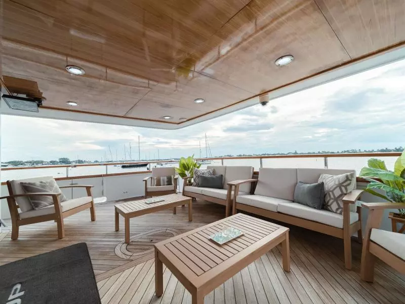 При входе с кормы через центральную дверь или через раздвижные двери по левому и правому борту сразу ощущается простор. Окна занимают около 2/3 высоты стен, обеспечивая панорамный вид на океан. В кормовой части салона расположены два глянцевых обеденных/карточных стола на 4 места — по левому и правому борту. Чуть впереди находится полноценный бар. Далее — диваны по обоим бортам и развлекательный центр с 60-дюймовым телевизором Sony 3D. Над окнами установлены электрические деревянные жалюзи на заказ. При переходе вперёд, по правому борту, расположен гостевой дневной санузел с раковиной.