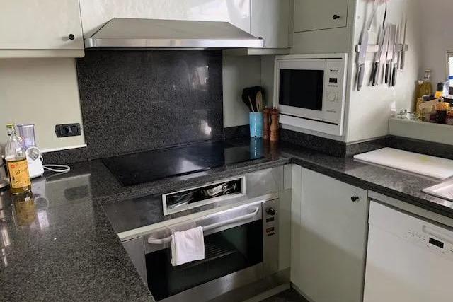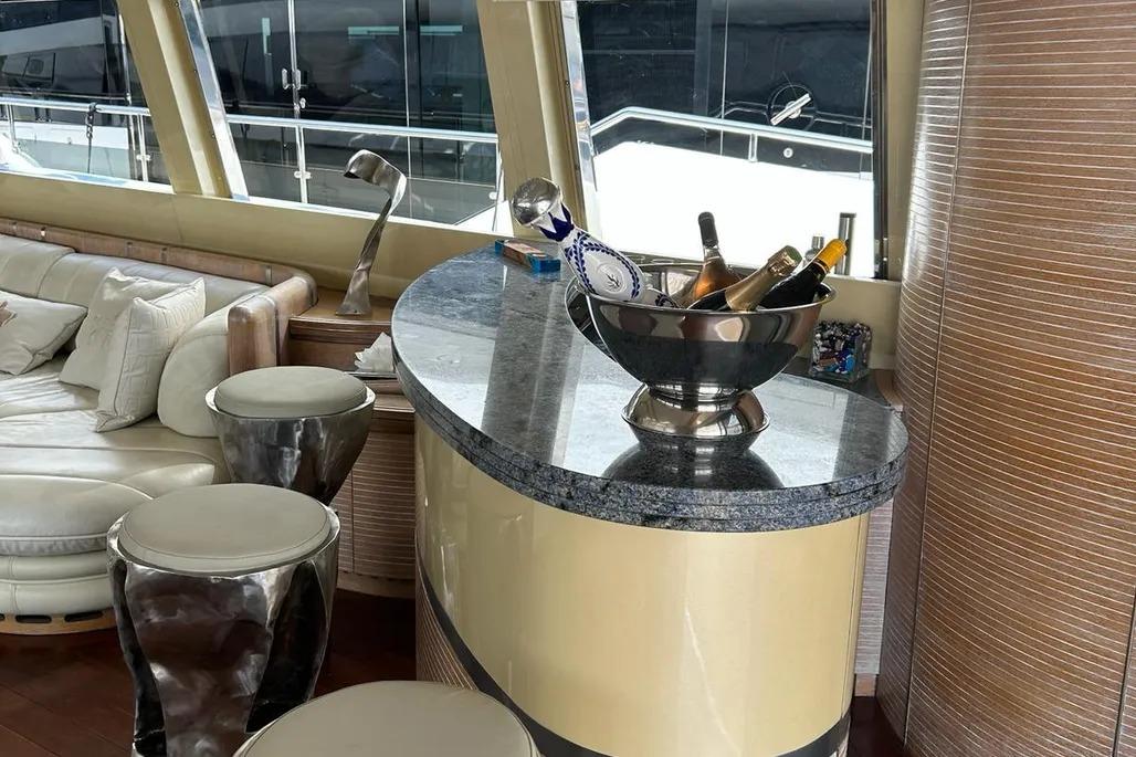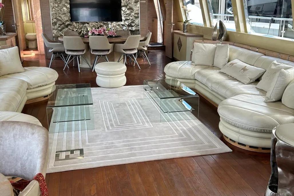 Роскошный салон оформлен в светлых тонах с кремовой мебелью и серебристыми акцентами, создавая элегантное пространство для дневного отдыха и вечерних приёмов. Рядом с раздвижными дверями расположена барная стойка для обслуживания гостей как внутри, так и на открытых зонах. Диваны установлены у окон, обеспечивая максимум естественного света и великолепные виды.