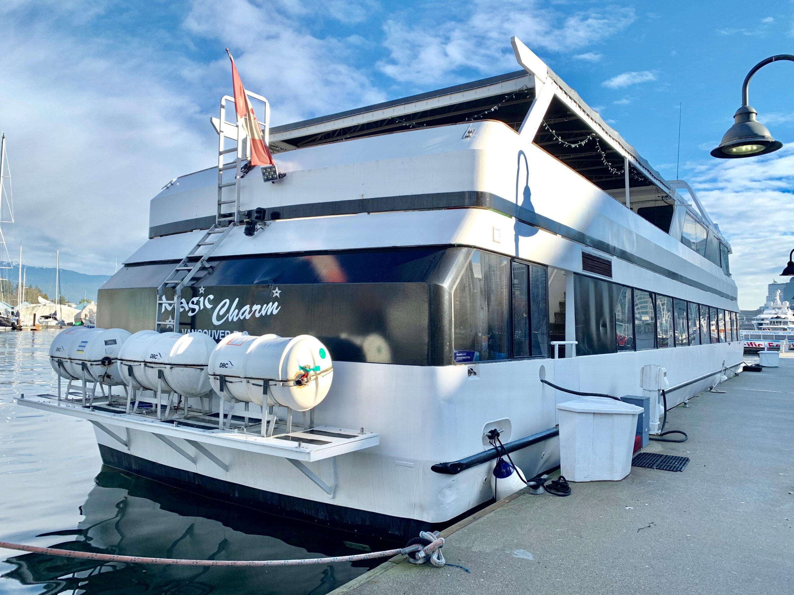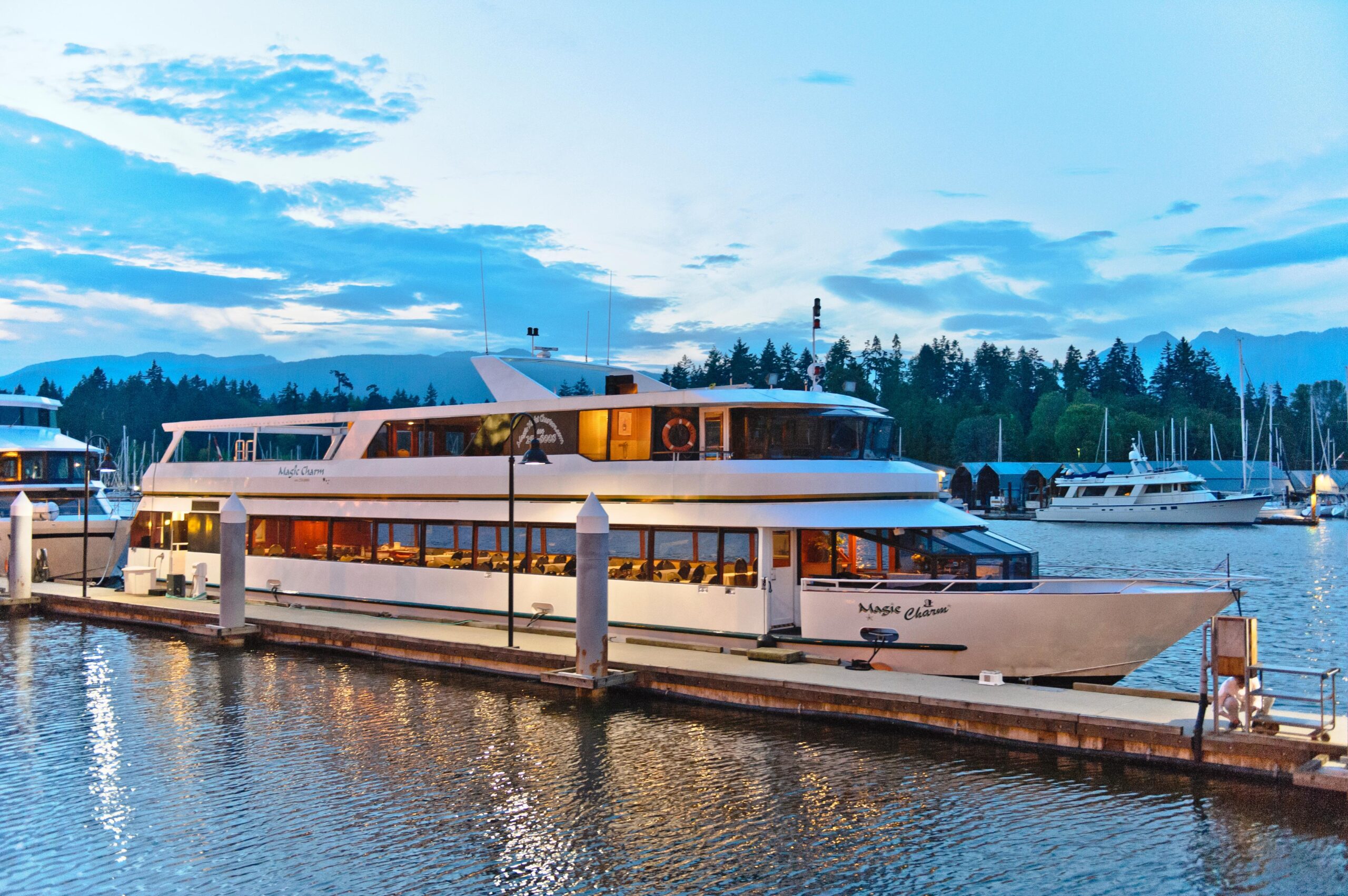 MAGIC CHARM — это круизно-банкетное / событийное судно вместимостью до 215 человек, в настоящее время сертифицированное и работающее в центре Ванкувера, Британская Колумбия, и теперь доступное для покупки. Это одно из двух чартерных судов, эксплуатируемых компанией Magic Yacht Charters с базированием в Prime Moorage в марине Bayshore Hotel Marina в центре Ванкувера.
