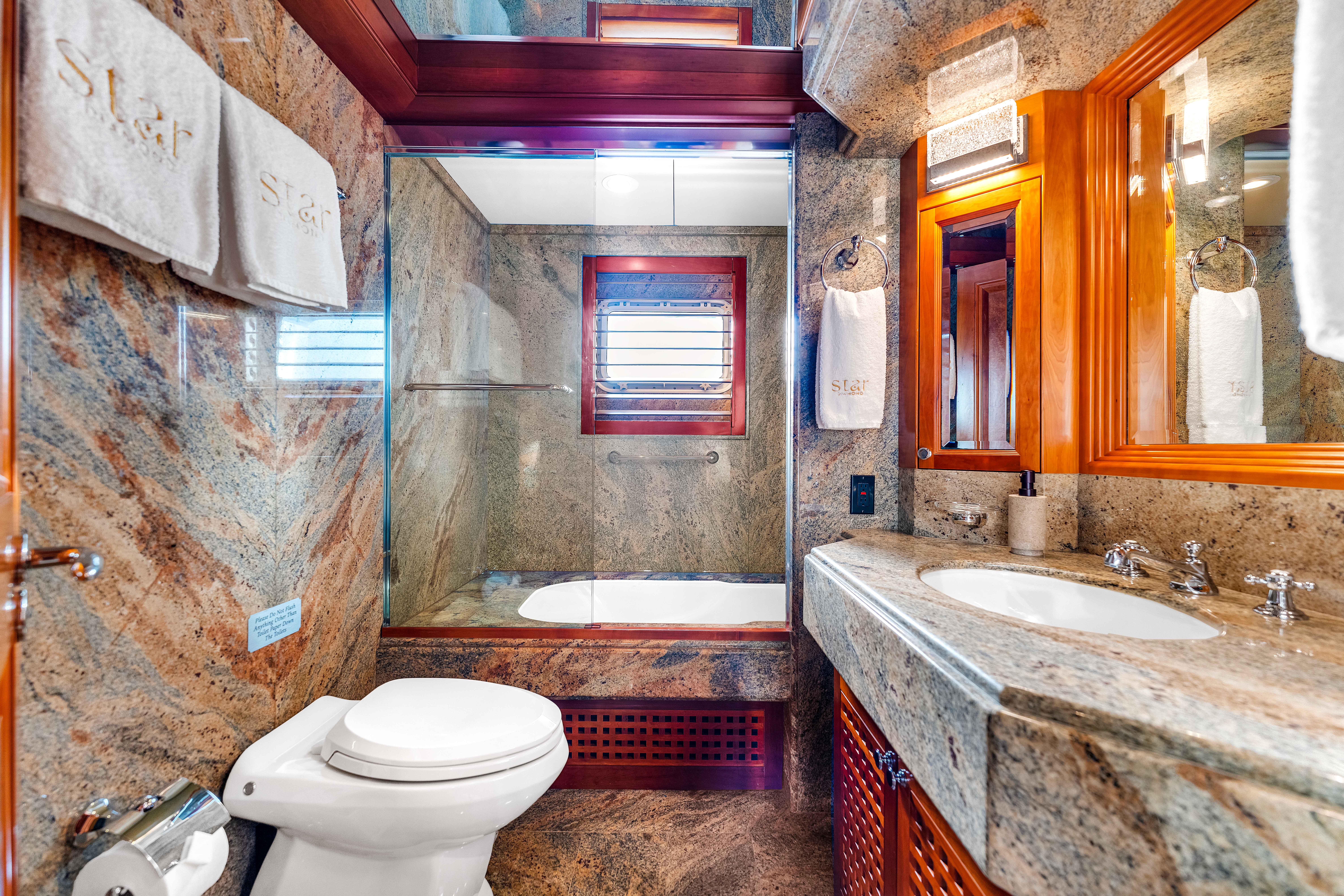 STAR DIAMOND обеспечивает максимальный комфорт для 10 гостей, размещённых в пяти роскошно оформленных каютах. Полноширинная мастер-каюта, расположенная на главной палубе, гарантирует высочайший уровень приватности. При входе в каюту по правому борту находится элегантная лаунж-зона владельца с мягкой мебелью, развлекательным центром и рабочим столом. По левому борту расположена спальная зона с роскошной кроватью king-size. Мастер-каюта STAR DIAMOND дополнена впечатляющей ванной комнатой с душем и джакузи. Остальные гостевые каюты отличаются универсальностью и просторностью: две каюты с двуспальными кроватями и две каюты с трансформируемыми раздельными кроватями.