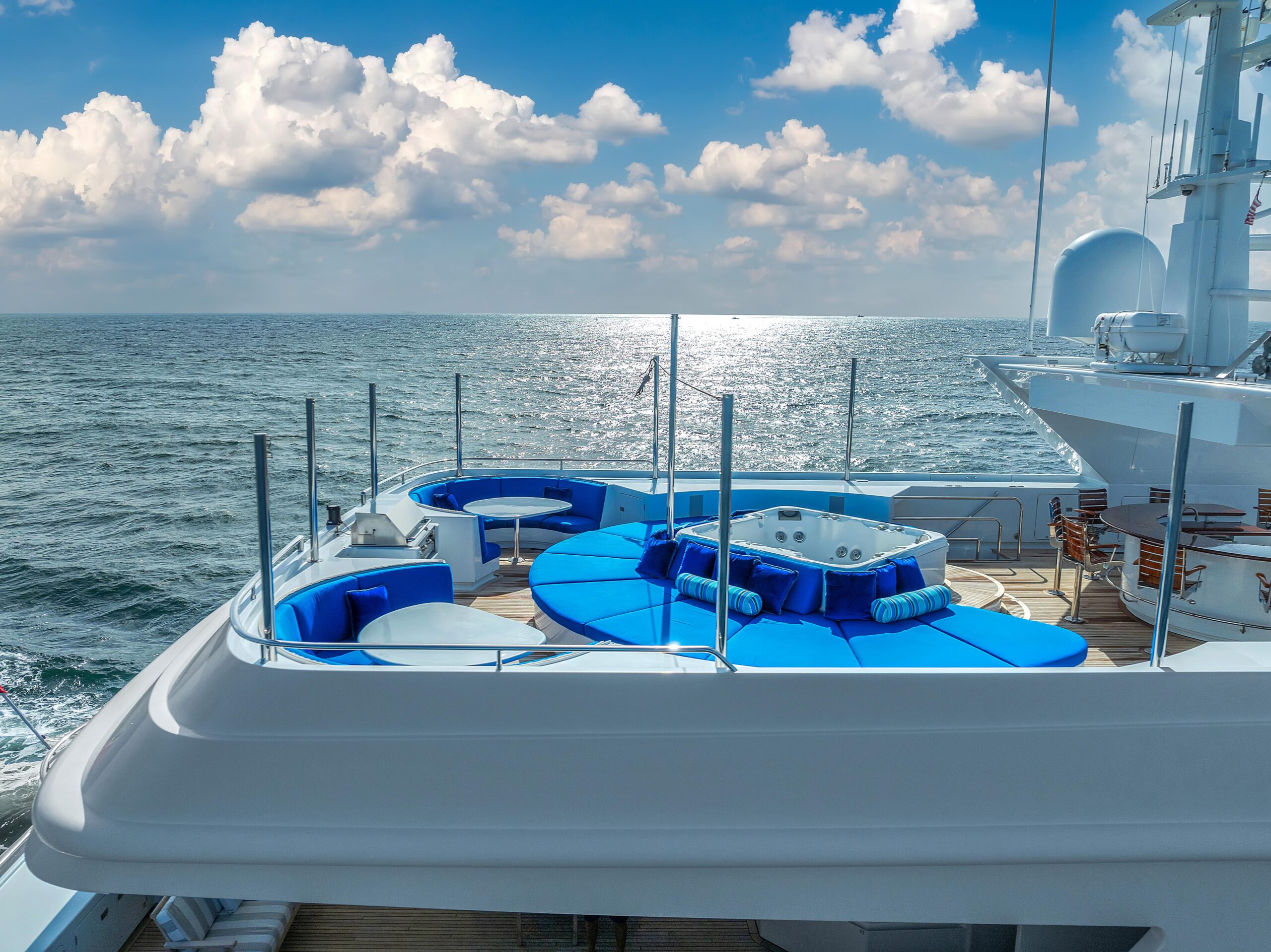 На корме бридж-дека предусмотрен обед на открытом воздухе на 12 человек, а также уютная С-образная зона отдыха с четырьмя плетёными креслами и пуфами. Даже при неидеальной погоде пространство остаётся комфортным благодаря прозрачным ветрозащитным шторам.