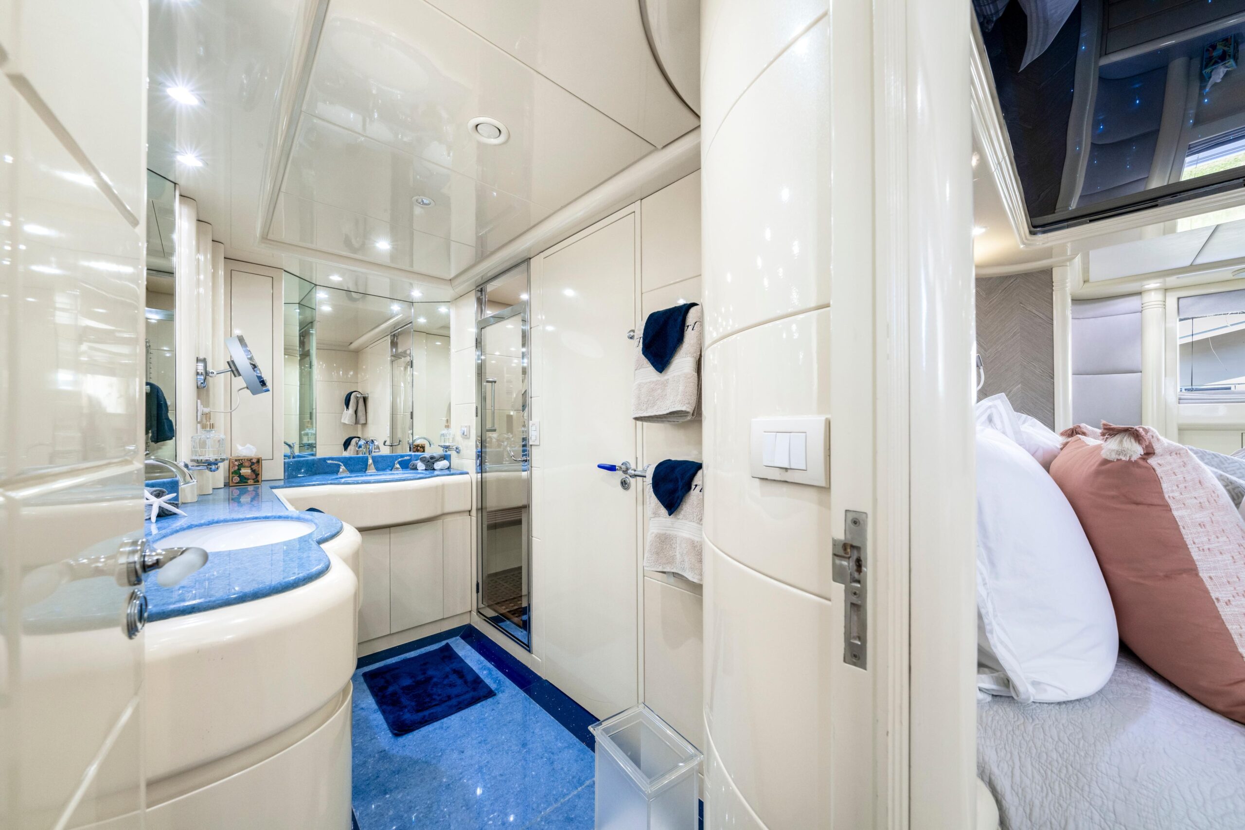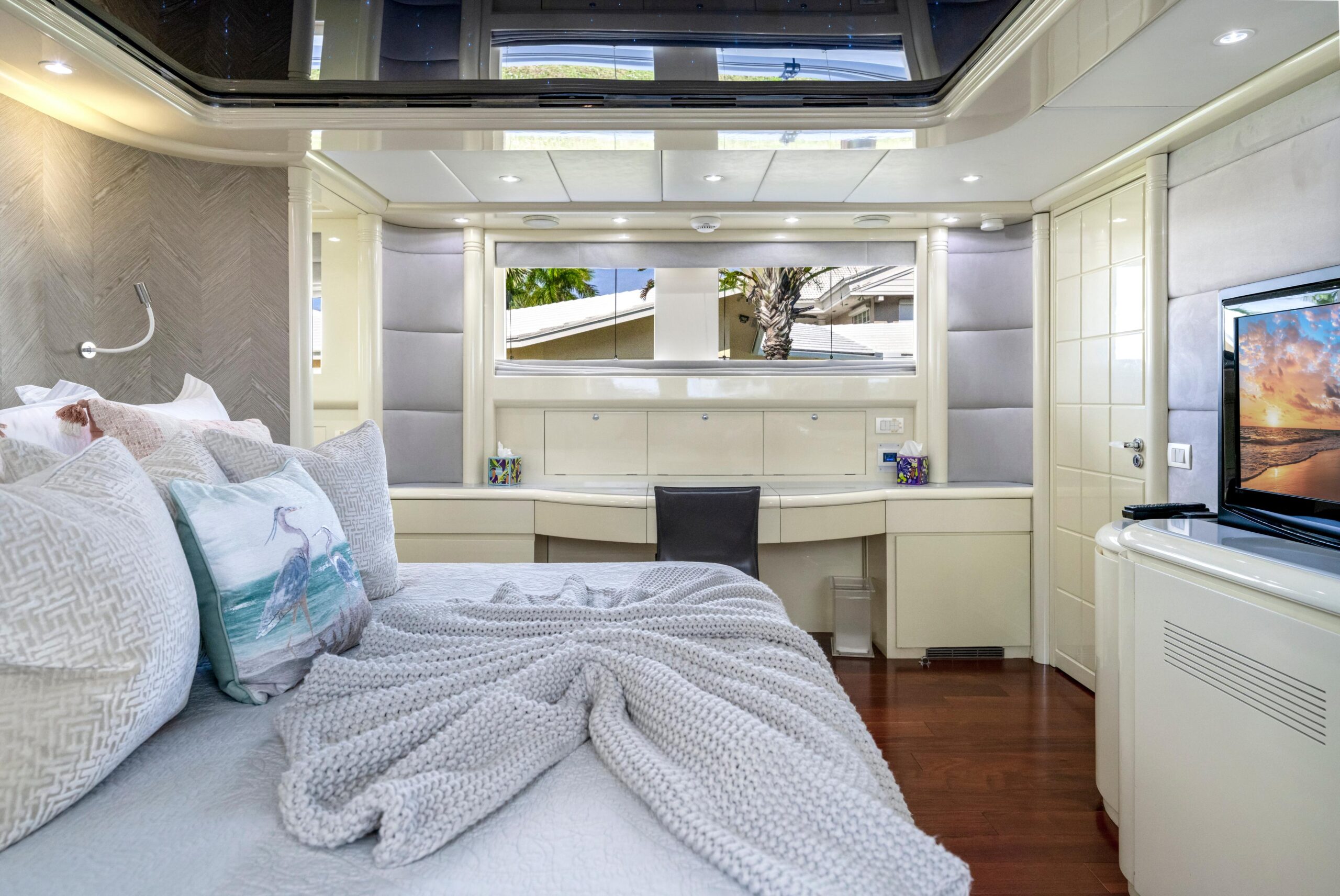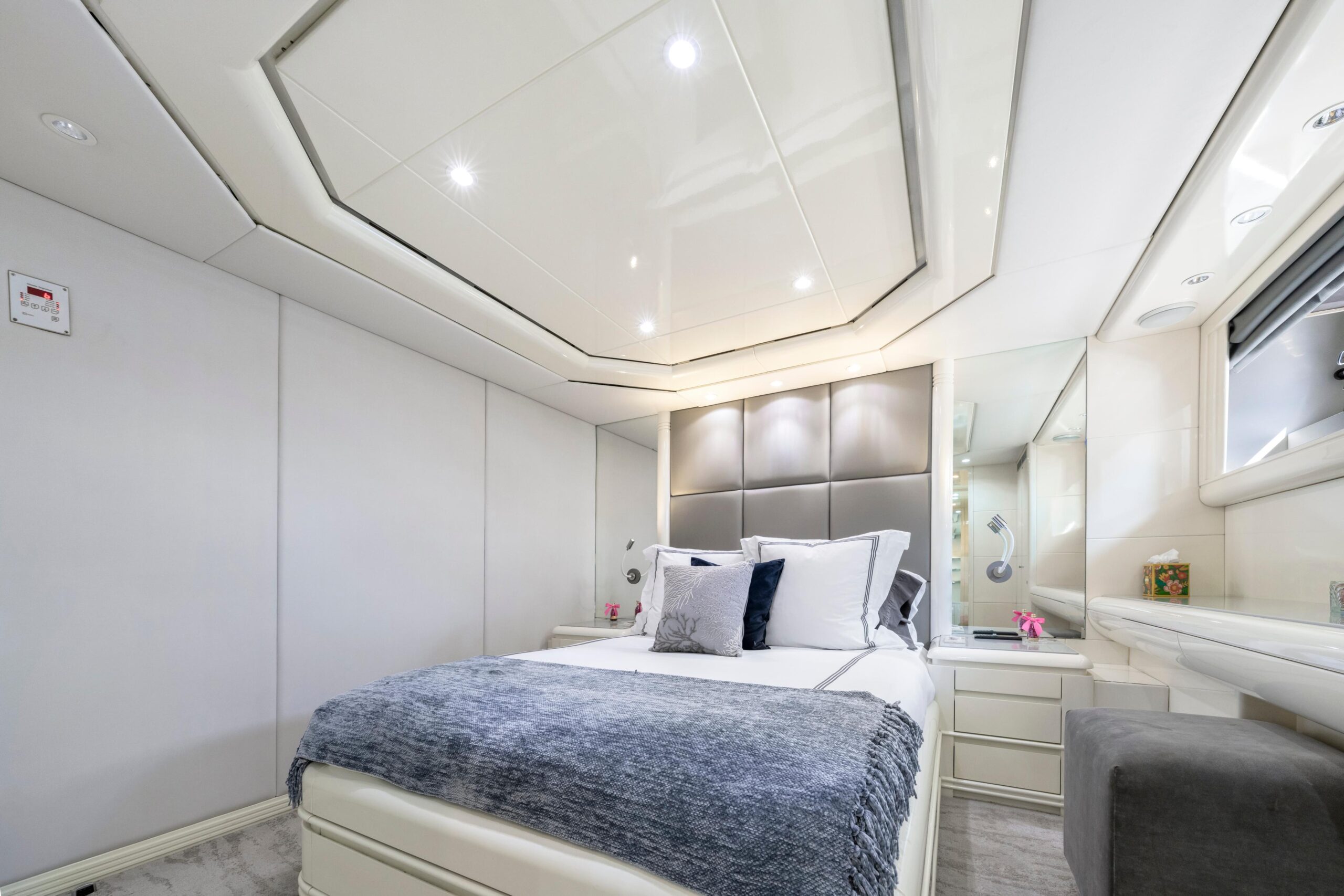 Полноширинная мастер-каюта со «звёздным» потолком, приватным кабинетом, кроватью king size, отдельной гардеробной и ванной комнатой.