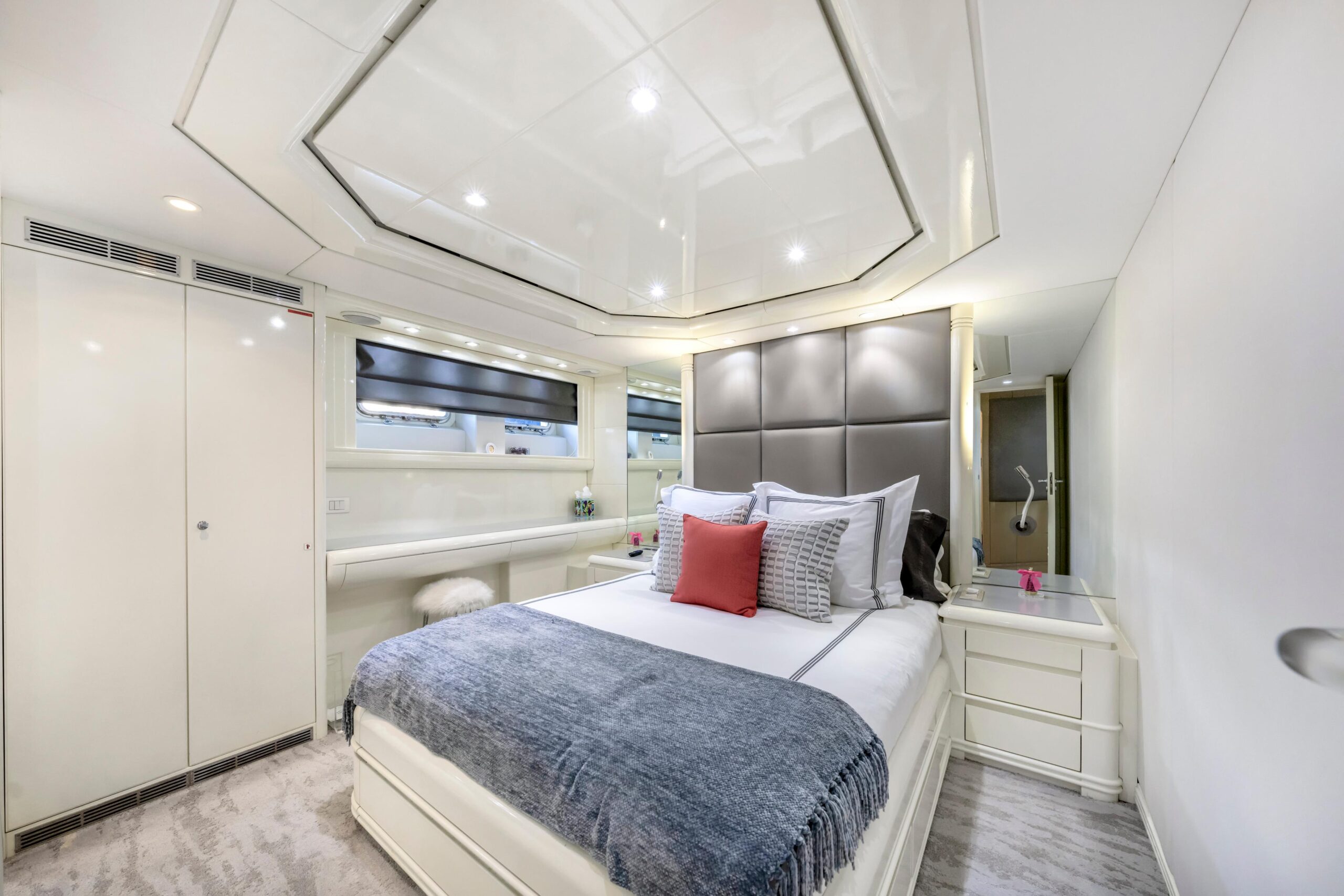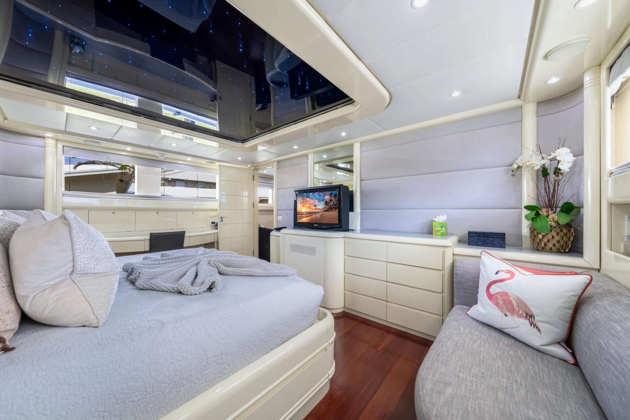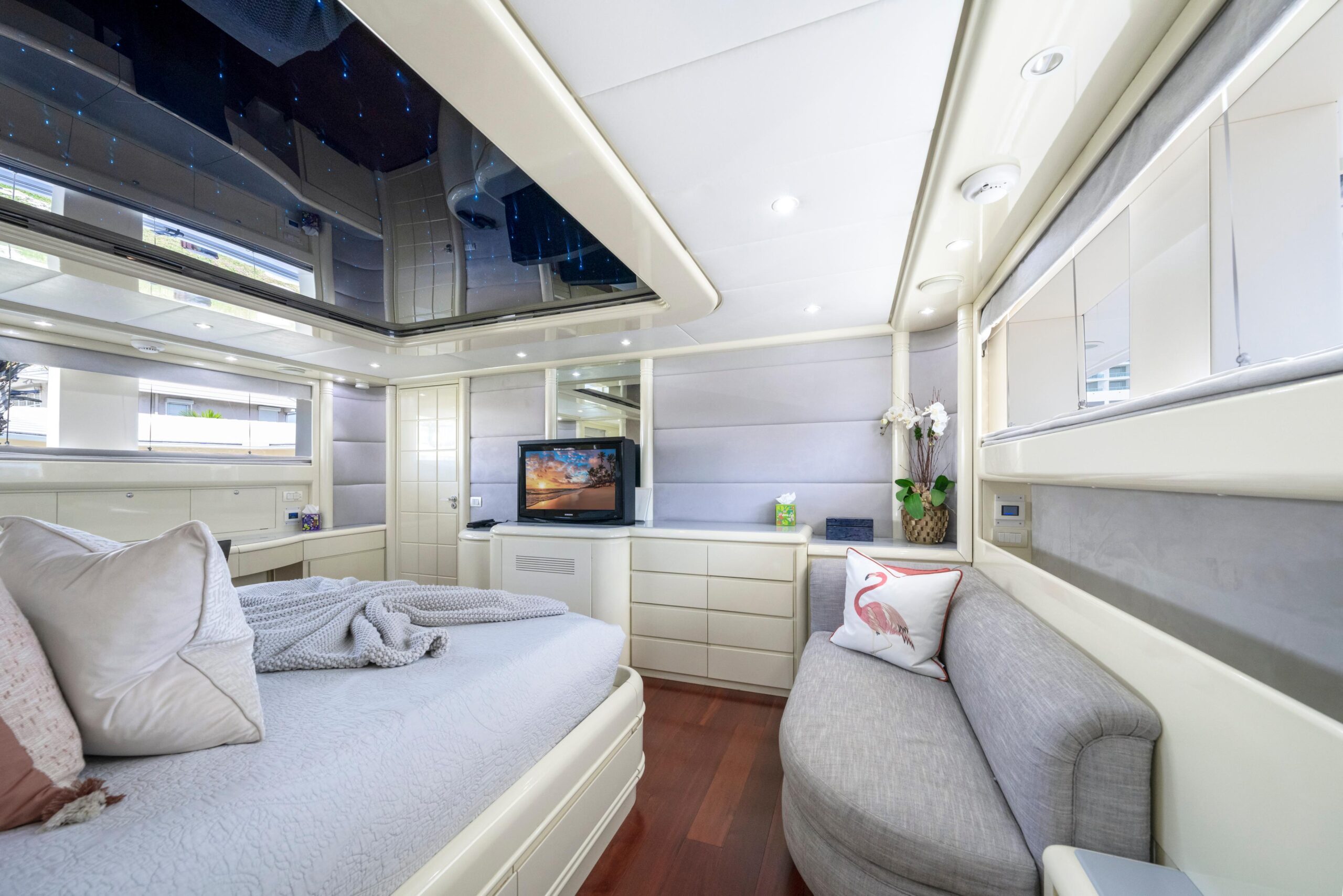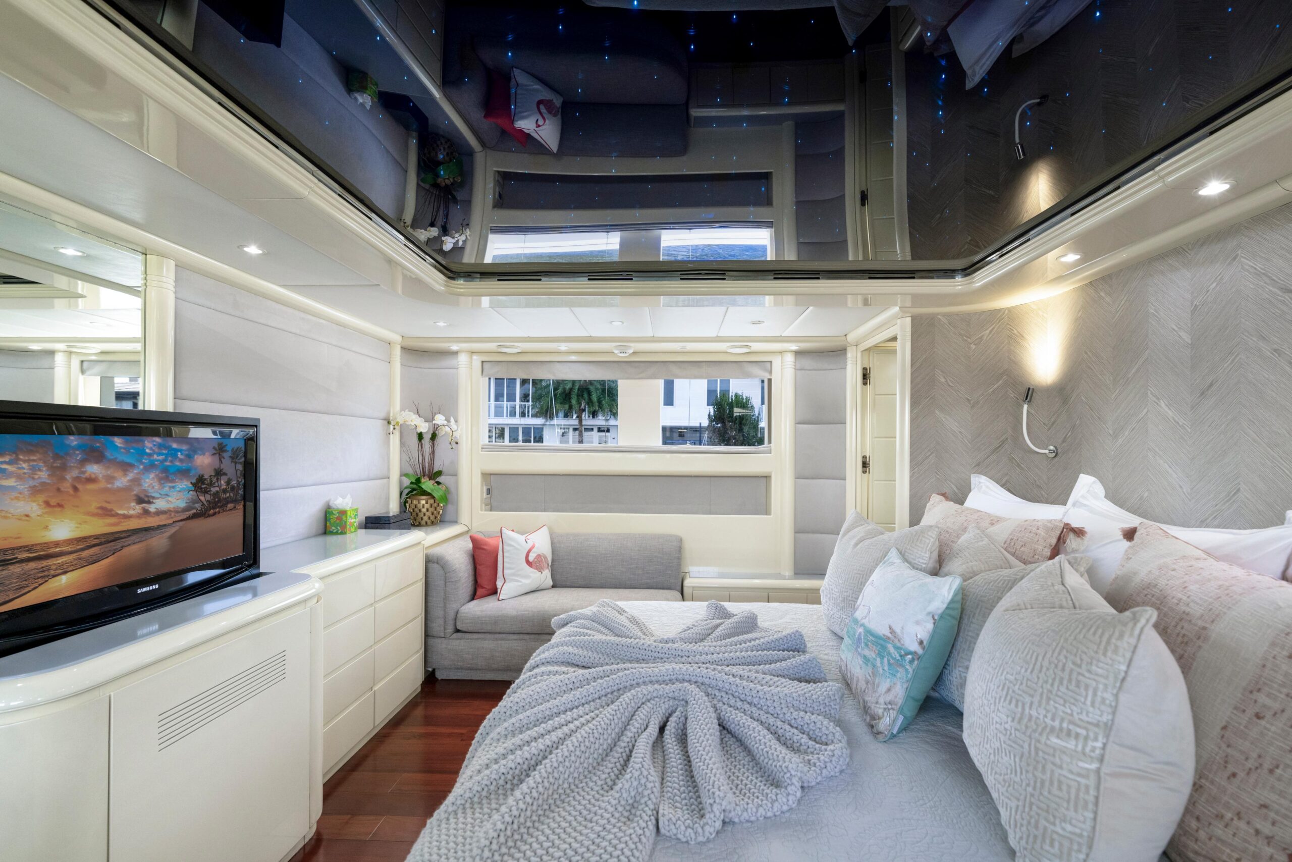 Полноширинная мастер-каюта со «звёздным» потолком, приватным кабинетом, кроватью king size, отдельной гардеробной и ванной комнатой.