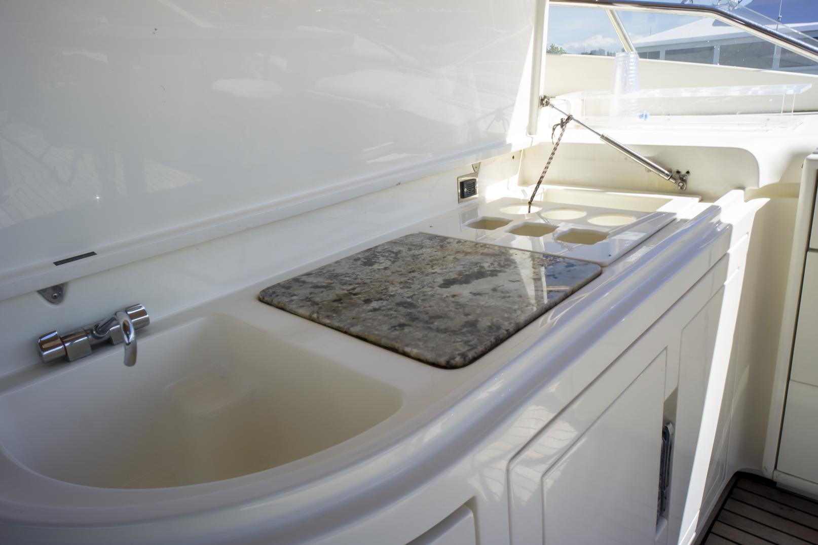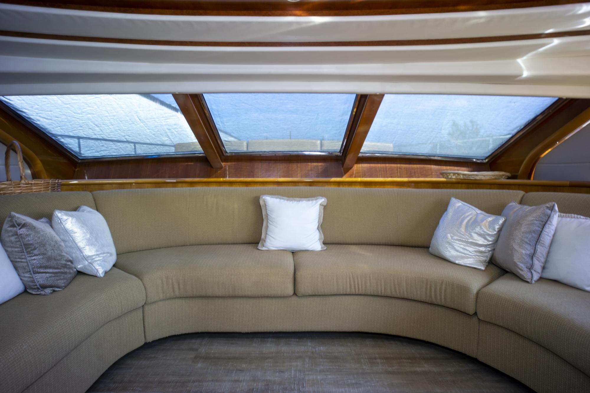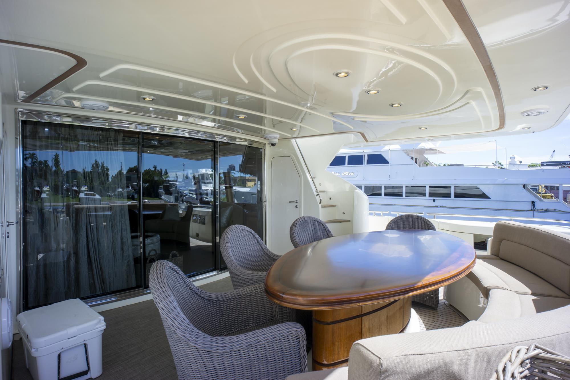 Кормовая палуба предлагает просторную обеденную зону на свежем воздухе с тиковым столом и встроенными сиденьями — идеально для неспешных ланчей и вечерних коктейлей у моря. Широкие проходные бортовые палубы обеспечивают безопасный и удобный переход к носу, а нержавеющие релинги и палубная фурнитура подчёркивают премиальный морской характер.