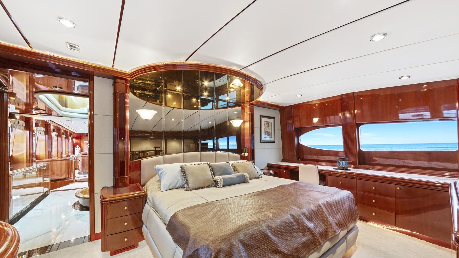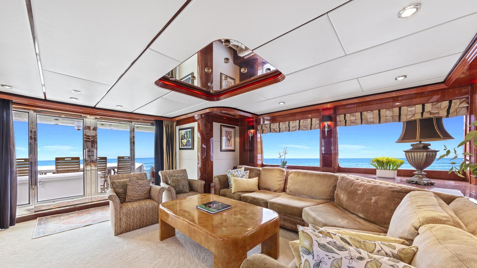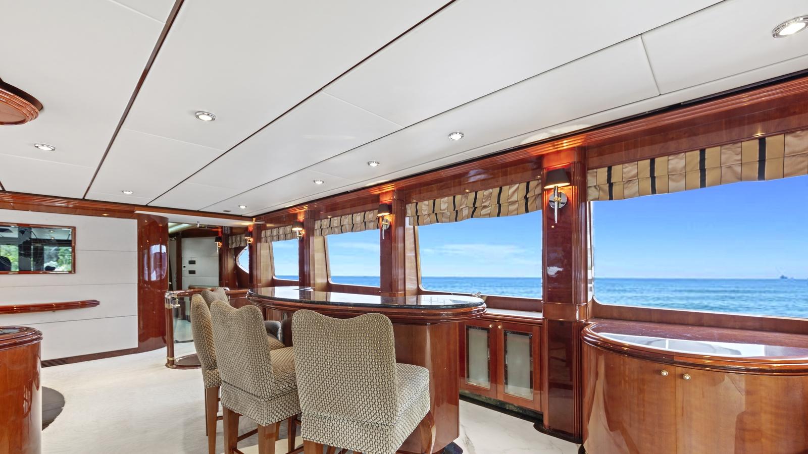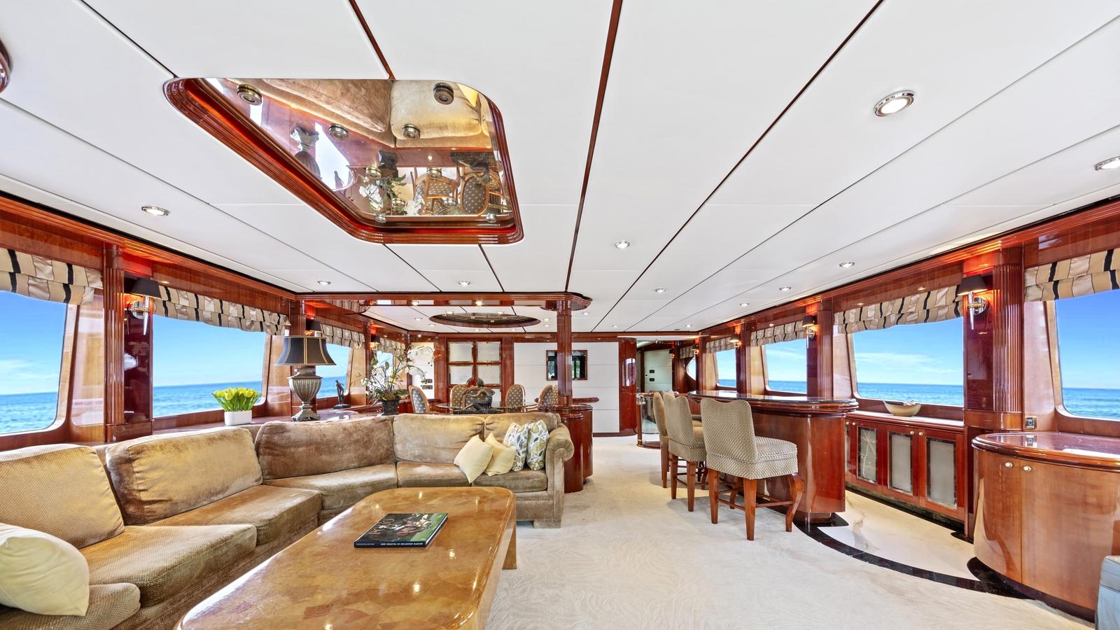 Вход в салон осуществляется через индивидуальные электрические раздвижные хромированные двери. Интерьер выполнен с отделкой из вишнёвого дерева с высоким глянцем и создаёт ощущение сдержанной роскоши. Салон во всю ширину корпуса наполнен светом и воздухом, чему способствуют обновлённые электромеханические шторы и панорамные виды на океан. Полноценный бар с льдогенератором и холодильником делает любое мероприятие по-настоящему стильным.