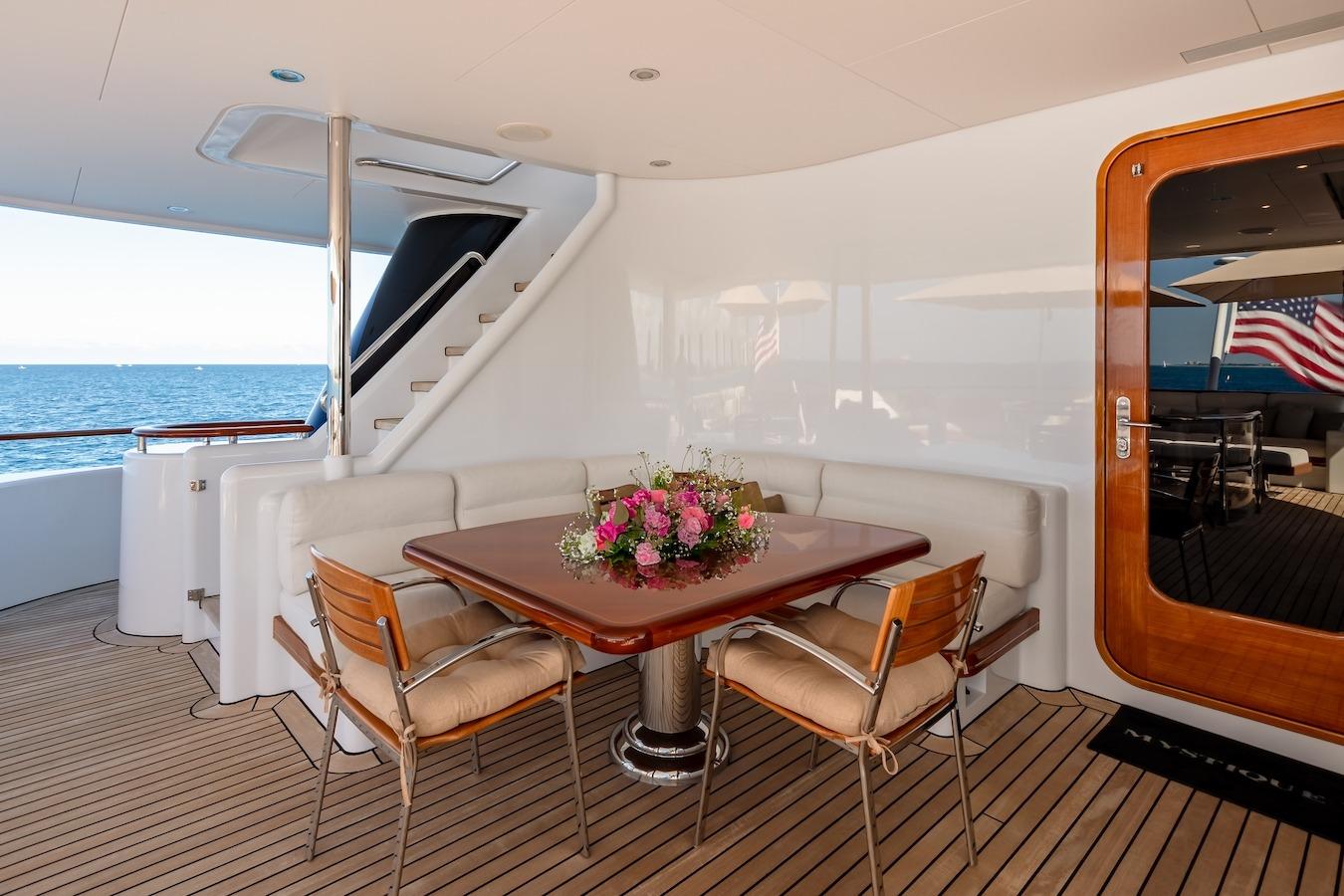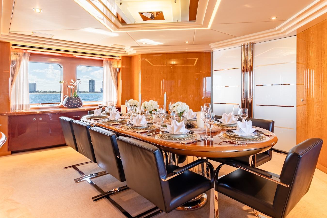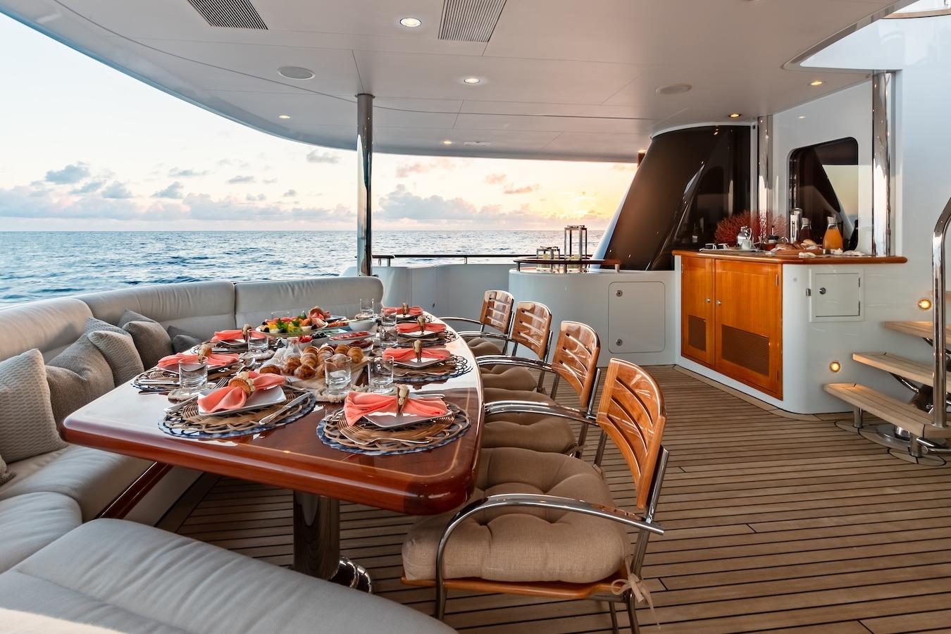 Формальная обеденная зона расположена на главной палубе впереди салона. Обед на открытом воздухе доступен на корме главной палубы и на корме палубы Skylounge