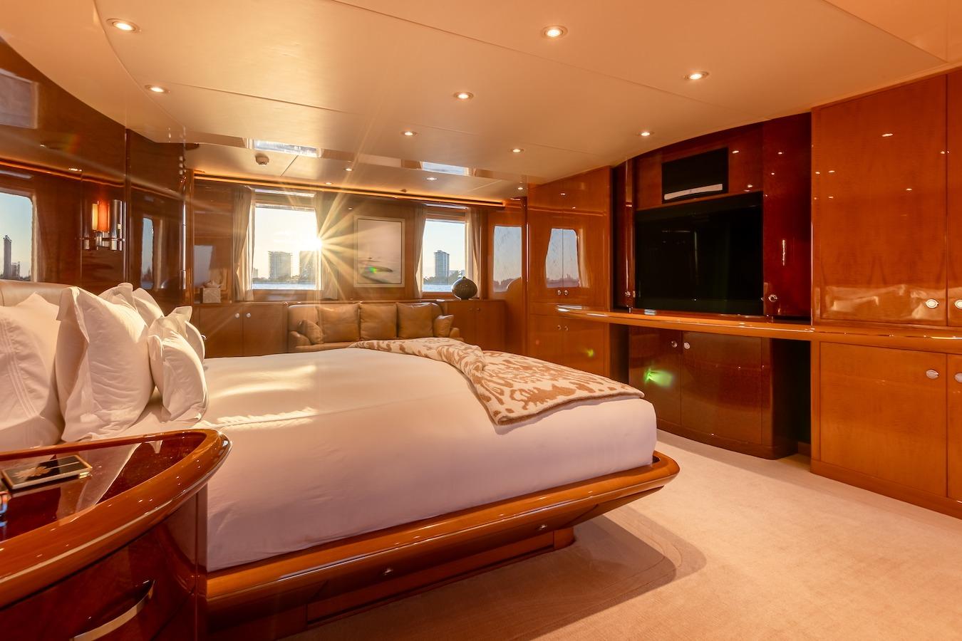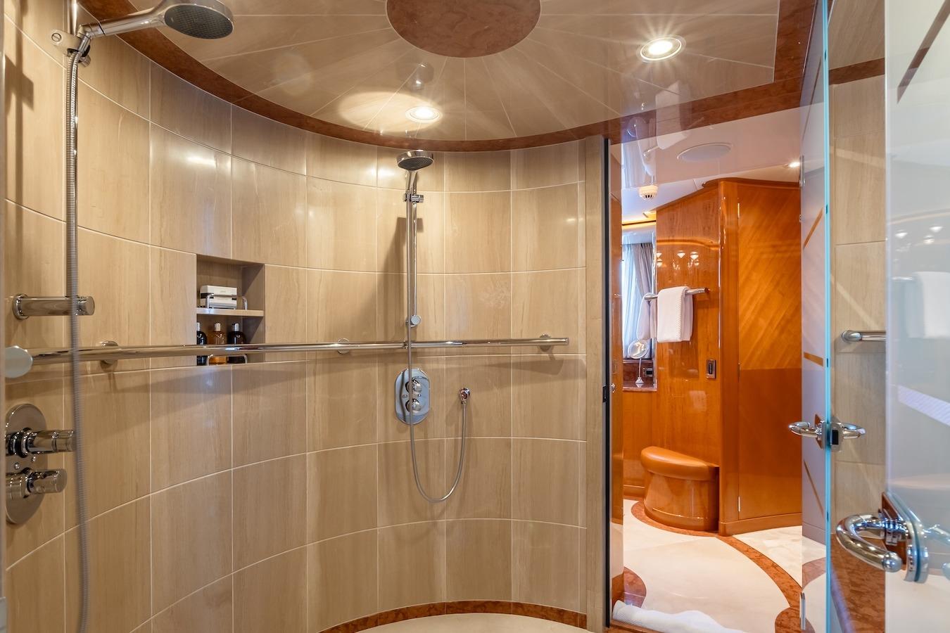 Полноразмерная Owner's Suite на всю ширину судна расположена на главной палубе в носовой части: кровать King, санузел his/her на всю ширину с центральной ванной-джакузи и очень просторной душевой на двоих