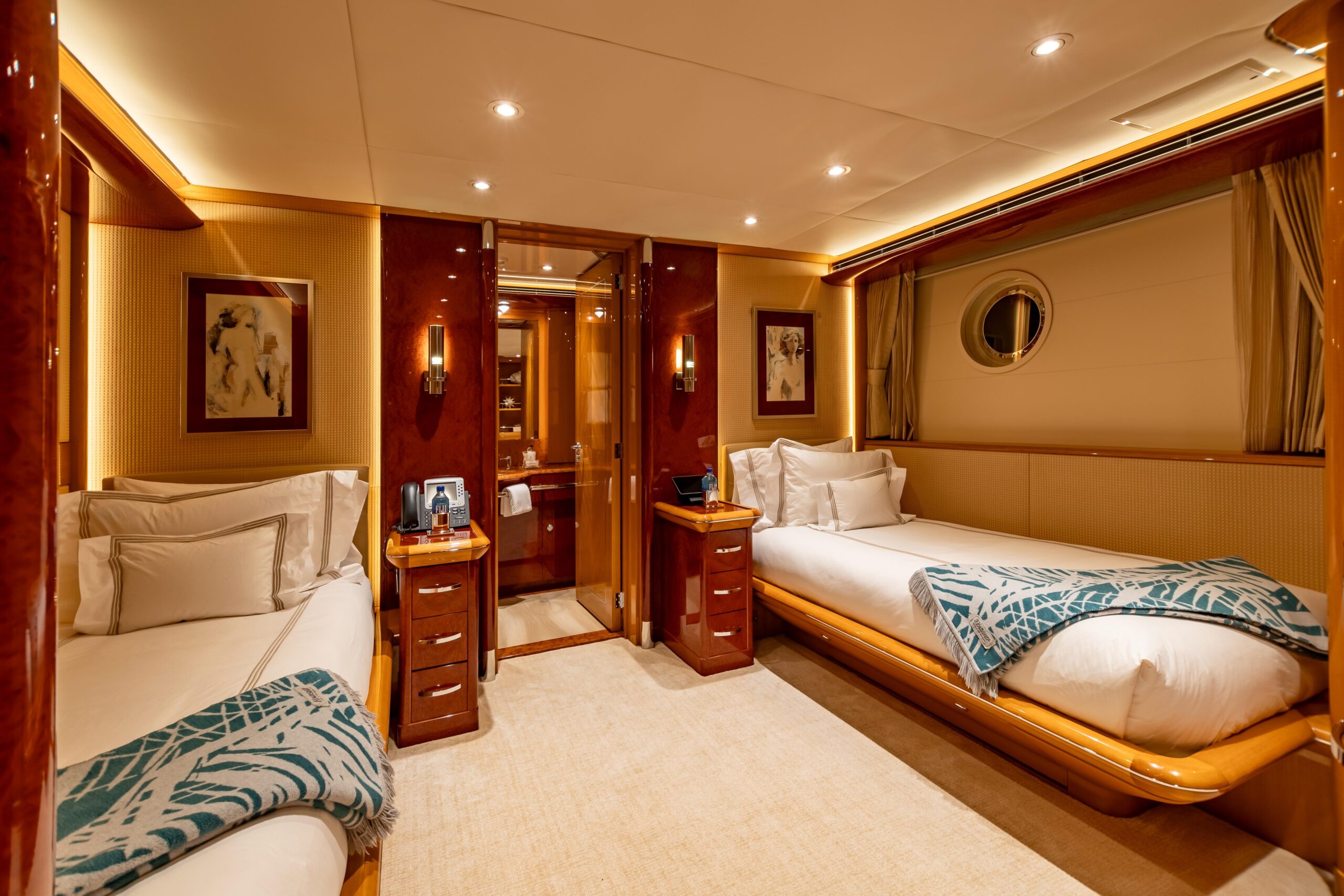 Ниже расположены VIP каюта Queen на всю ширину и 2 каюты Twin (в каждой — две односпальные кровати и койка Pullman)