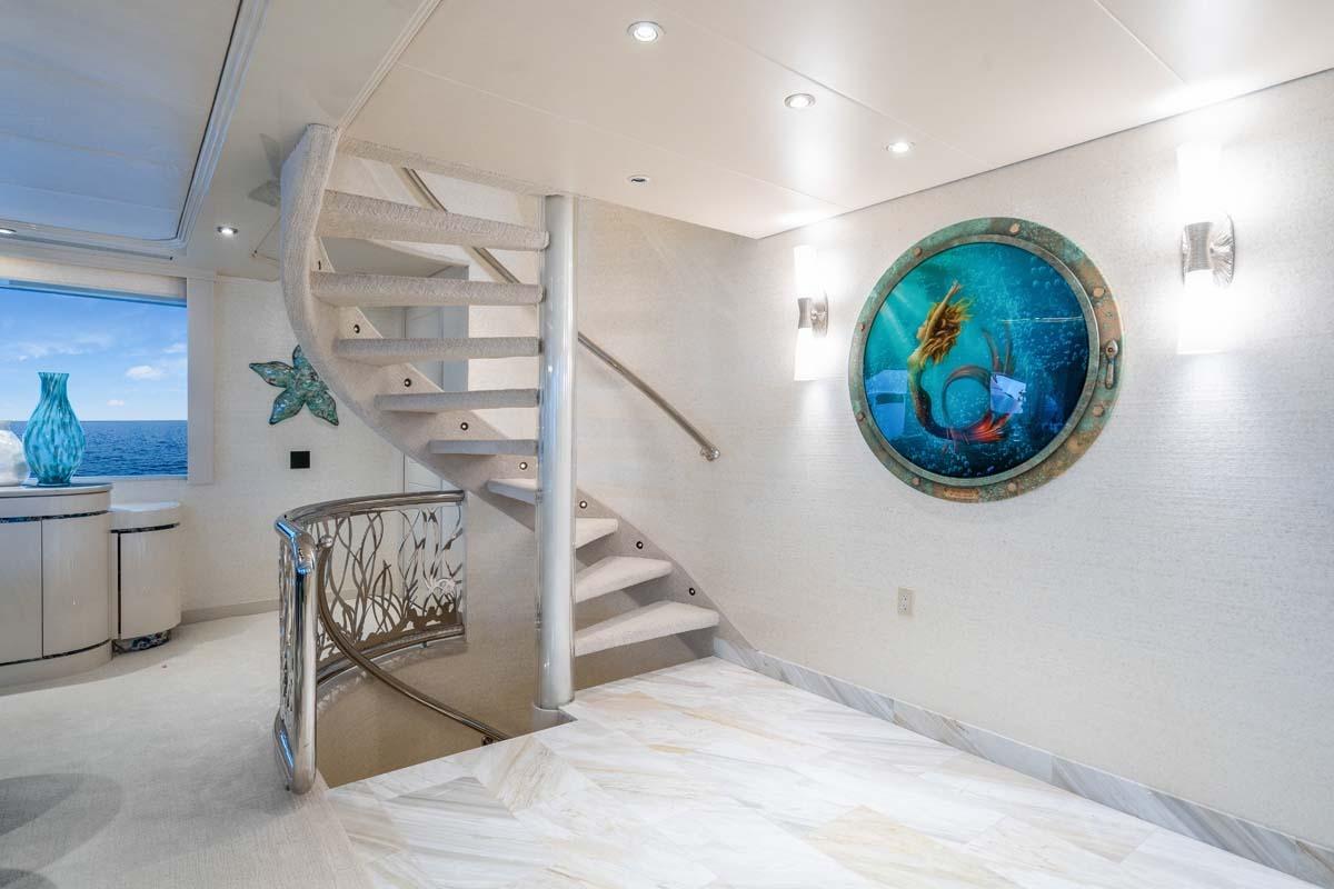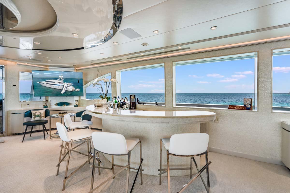 Большие окна подчёркивают простор главного салона во всю ширину корпуса. Вечером мягкую атмосферу создают купольные и утопленные светильники. В основной обеденной зоне предусмотрен формальный обед на десять гостей. Бар салона с полноценной посадкой, открывающий панорамные виды через большие окна, отлично подходит для вечернего дижестива. Винтовая лестница в носовой части салона дополняет современный стиль и качество исполнения мебели и отделки.