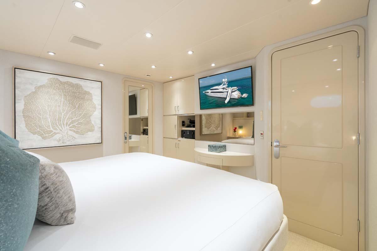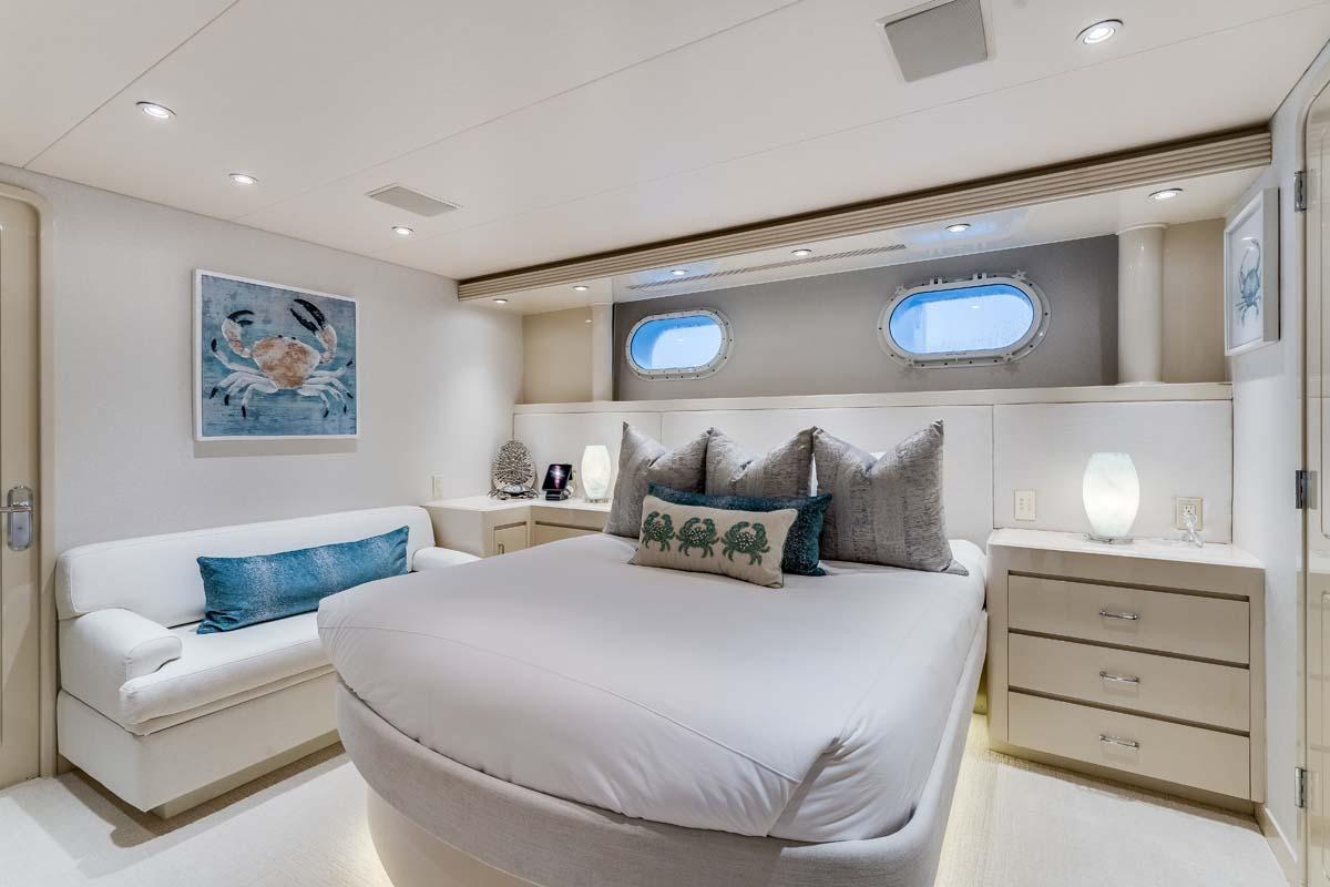 Эта каюта во всю ширину корпуса на главной палубе создана как вершина комфорта и роскоши и оснащена кроватью king-size. В санузле — отдельная душевая кабина и глубокая ванна-джакузи. Просторные “его” и “её” зоны санузла обеспечивают уровень удобства, ожидаемый от яхты такого класса. Два гардероба дают много места для одежды и багажа. Отдыхать в мастер-каюте особенно приятно благодаря мягкому дивану, полноценному развлекательному центру и телевизору с плоским экраном.