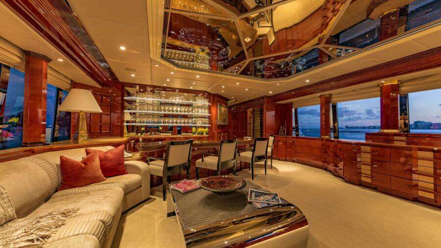 I LOVE THIS BOAT — отличный выбор для тех, кто хочет получить максимум от мира роскошных яхт. Она обязательно превзойдёт ожидания во всём. ГЛАВНЫЙ САЛОН Входя в главный салон с кормовой палубы, гости сразу отмечают простор и располагающую атмосферу, созданную для отдыха и комфорта. Элегантное сочетание дерева, изысканных тканей, каменных акцентов и коврового покрытия формирует тёплый и утончённый интерьер. Зона отдыха включает большой диван, двухместный диванчик и два кресла, объединённые вокруг кофейного столика на заказ из травлёного стекла и маркетри. AV-система включает полное управление Crestron и электрическое освещение Lutron «One Touch», обеспечивая удобную эксплуатацию и контроль атмосферы. Чтобы сохранить открытость пространства, по обе стороны панели из стекла с травлением раковин установлены колонны из мадроны на заказ, а их верх украшен металлическими пальмовыми листьями. Этот дизайн изящно отделяет салон от формальной столовой, не «закрывая» пространство визуально.
