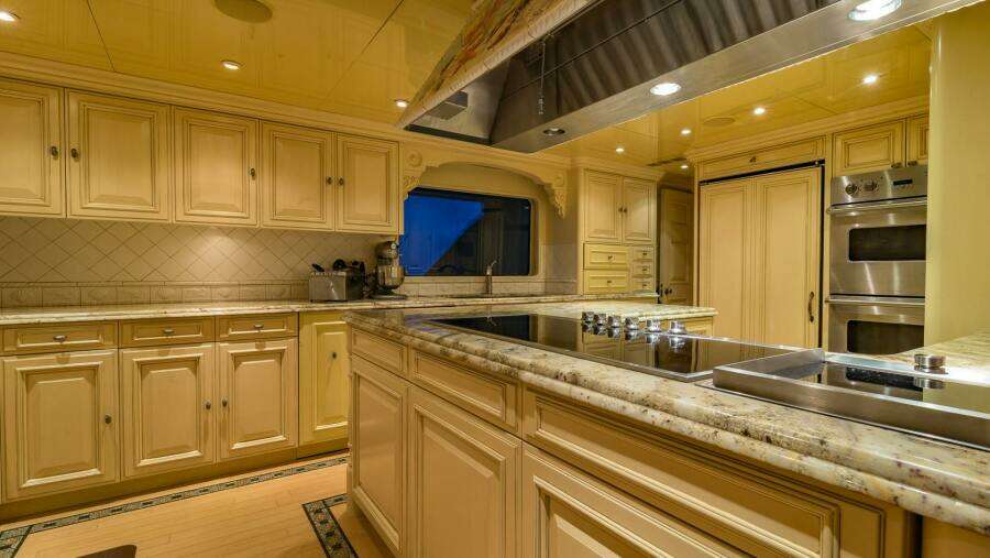 Картина на заказ, расположенная между камбузом и обеденной зоной, может опускаться, открывая стеклянное окно — это позволяет либо смотреть в камбуз, либо закрывать его для приватности во время приёма пищи .