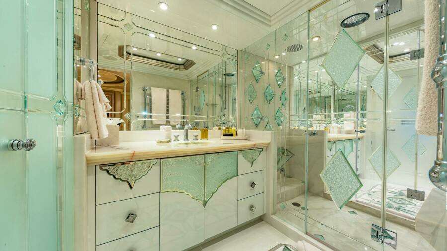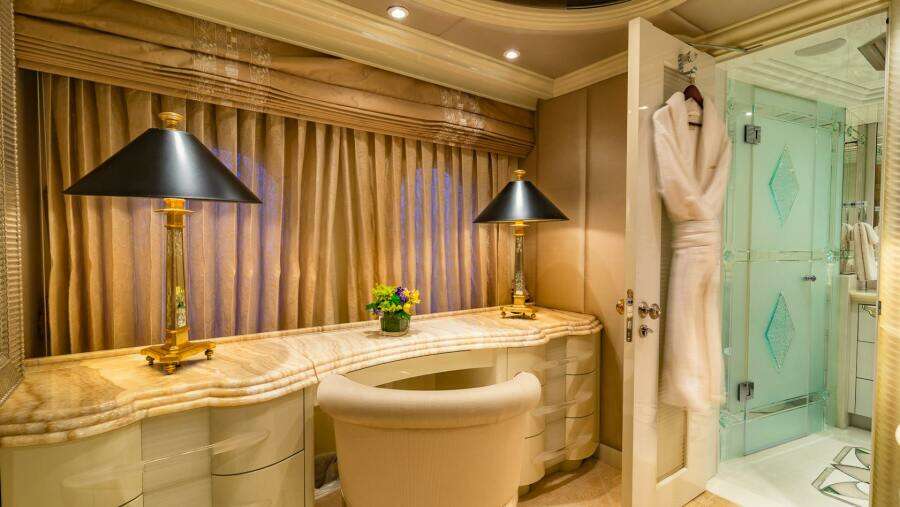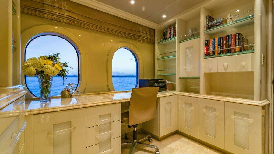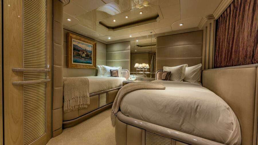 Планировка включает мастер-каюту на палубе с отдельным офисом, а также четыре дополнительные каюты, расположенные в средней части корпуса на нижней палубе, каждая с просторным санузлом. По всему интерьеру глянцево окрашенное дерево и встроенная подсветка усиливают изысканную атмосферу.