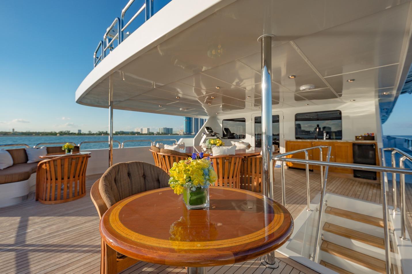 На солнечную палубу можно подняться по широкой лестнице из района миделя по правому борту с палубы бриджа. Большое джакузи легко вмещает 10 взрослых, а у большого бара с шестью барными стульями установлена машина Rum Runner для постоянной подачи замороженных напитков. Предусмотрено много мест для гостей, а впереди — два капитанских кресла для управления яхтой с верхней палубы.
