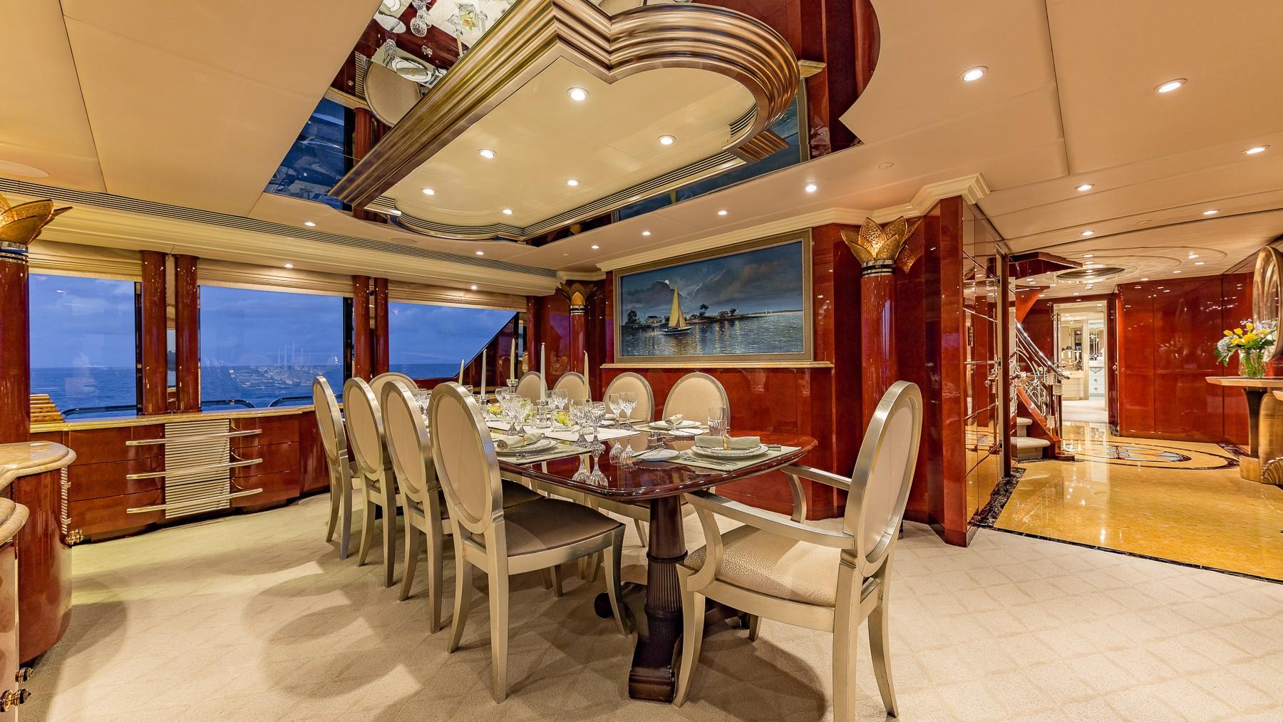Формальная обеденная зона оснащена прямоугольным столом на заказ, изготовленным в Голландии, и комфортно размещает 10 взрослых на больших мягких стульях. Слева и справа (по левому и правому борту) расположены буфетные шкафы, обеспечивающие большое количество места для фарфора, приборов и сервировки.