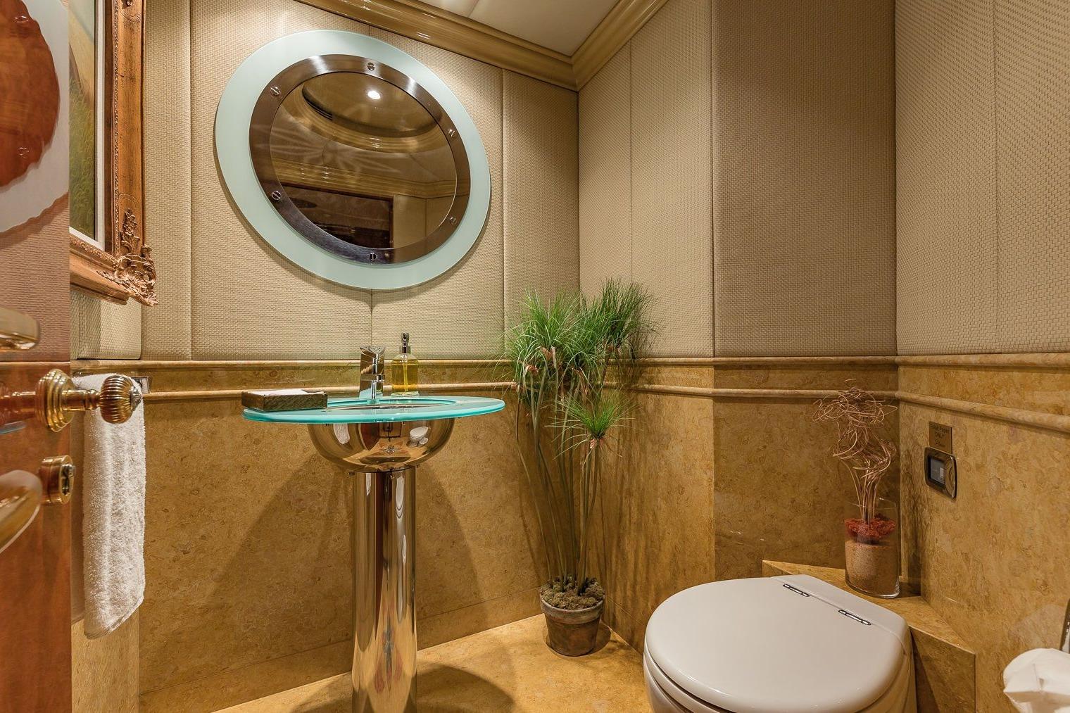 Машинное отделение — одна из ключевых особенностей яхты: главные двигатели окрашены в «пожарно-красный» цвет, пол выполнен из золотистого рифлёного листа, предусмотрено полноценное кондиционирование. Есть отдельная контрольная с офисом и просторный лазарет с дайв-компрессором — действительно уникальная и очень хорошо оснащённая техническая зона.