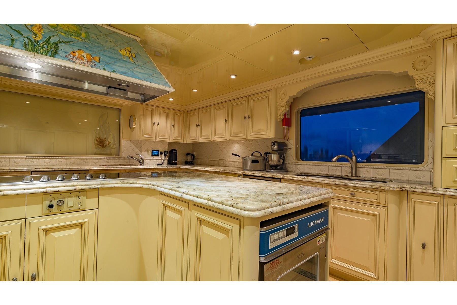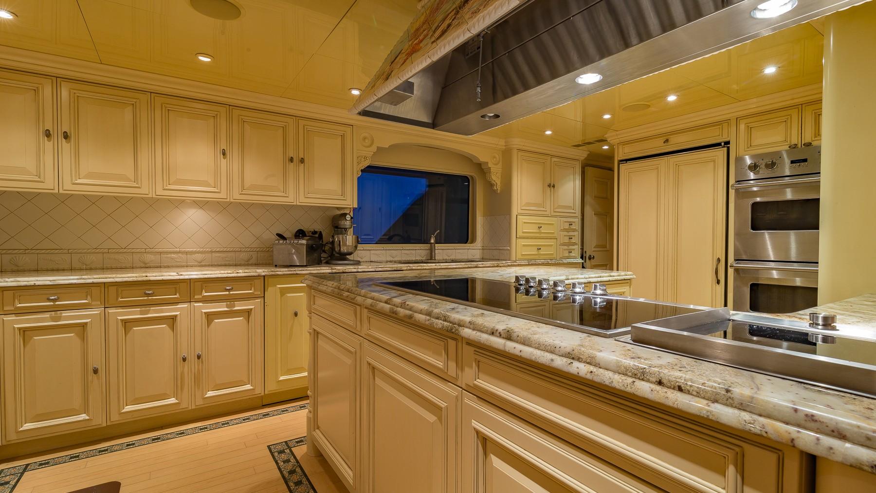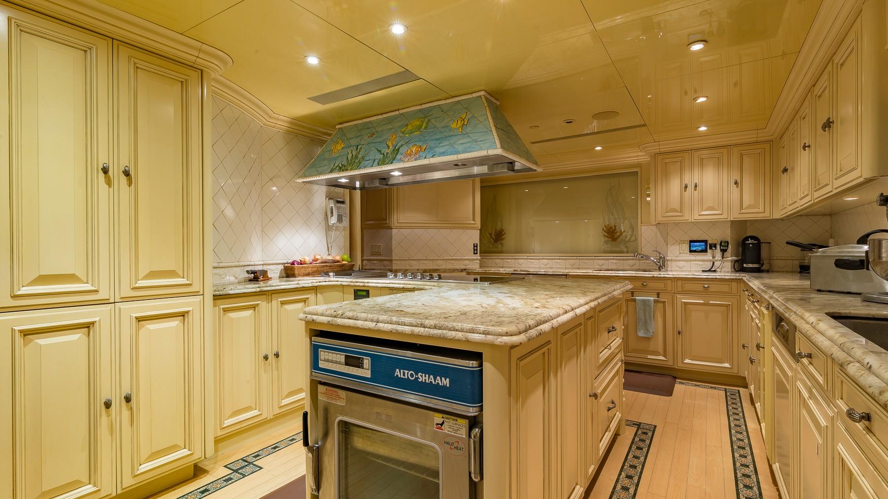 Камбуз расположен сразу впереди обеденной зоны по левому борту и оформлен в уютном «country French» стиле: светлый мрамор, кремовые шкафы и тёплая, располагающая атмосфера. Кастомная вытяжка над плитой украшена красивой плиткой «подводный мир» нежно-голубого оттенка.
